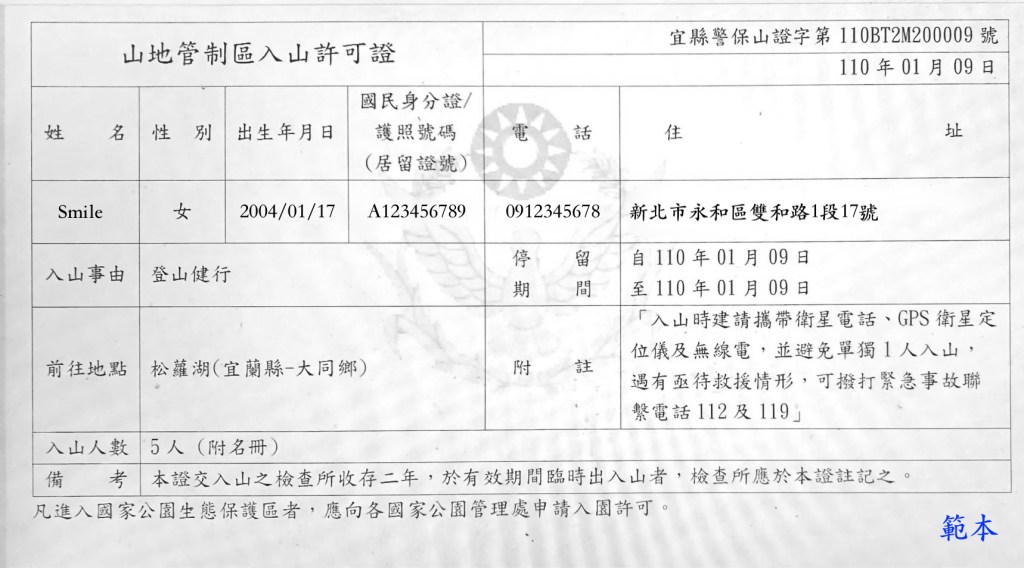 要攀登松蘿湖,可由入山之日前3日至124日內由網路提出申請,此種申請方式請讀者朋友們進入「內政部警政署入山案件申請系統」內進行辦理,或者於入山之日3日內或於當日直接到「宜蘭縣政府警察局三星分局大同分駐所」內帶身份證件直接辦理。記得,在下山後,再撥打電話03-9811176給分駐所警員先生確定團進團出平安下山。入山許可證的範本如下: