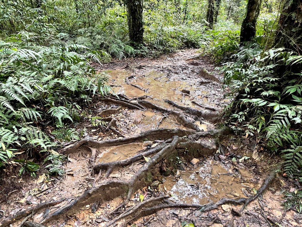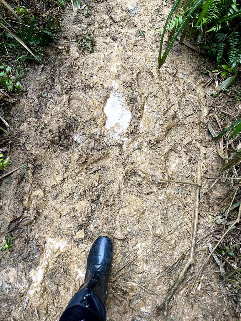 影片:整個路徑都是泥濘狀態,這時就會發現雨鞋的好處。Steven還故意採進去當作示範。08:39