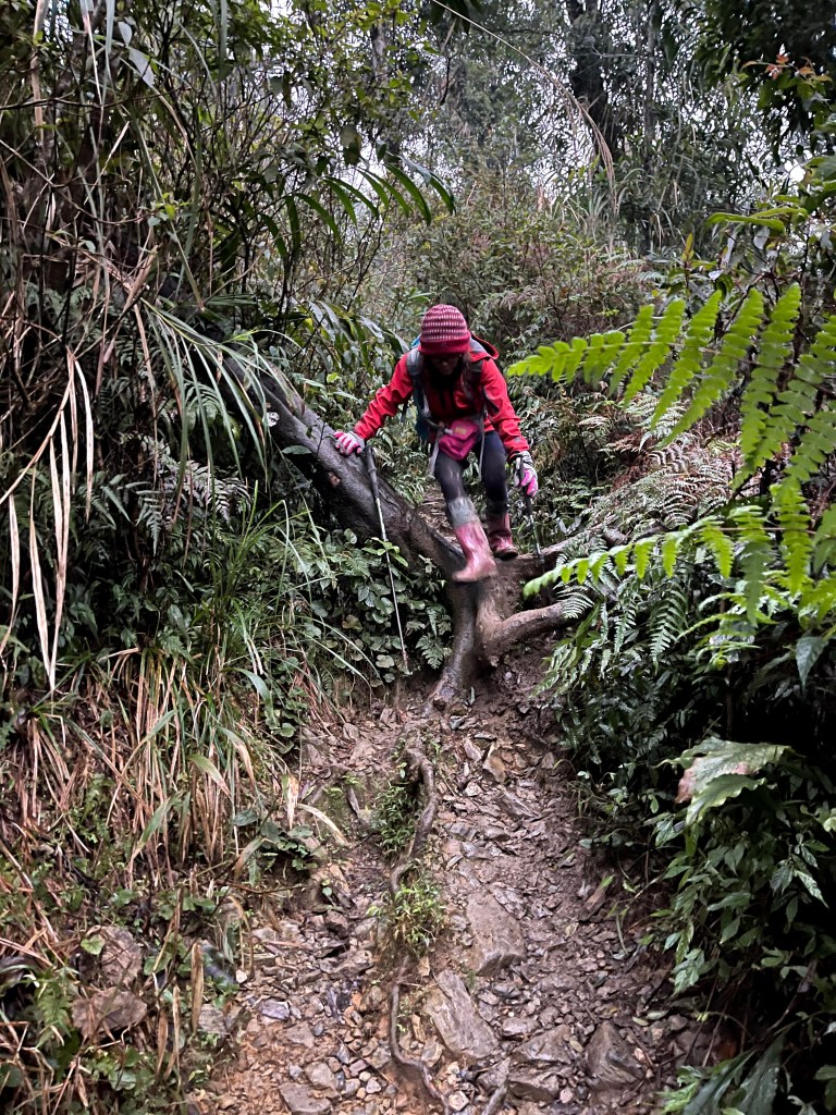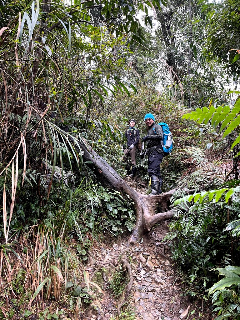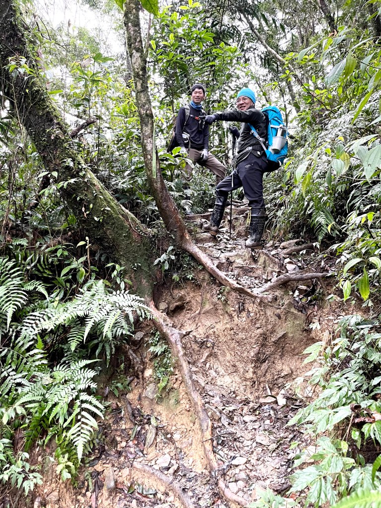 我想,若沒有下雪的因素,其實松羅湖山徑就是中級山的路徑。其中包含有一段的路徑是黃土型態(像是北插天山最後上攀的那種路徑),因此很容易就會將大腿以下都沾黏到泥土,親近松蘿湖會建議以雨鞋為主,短統的雨鞋或登山鞋應該會慘不忍睹。