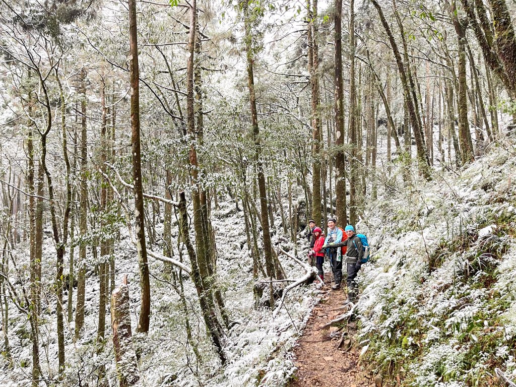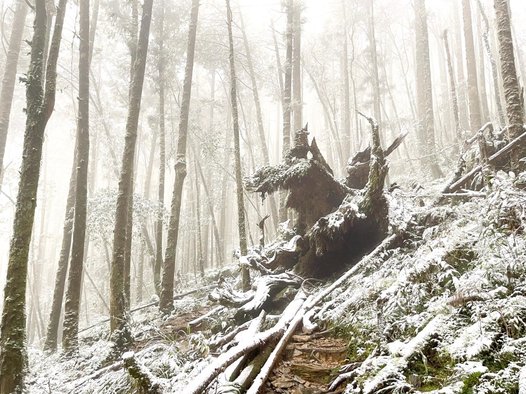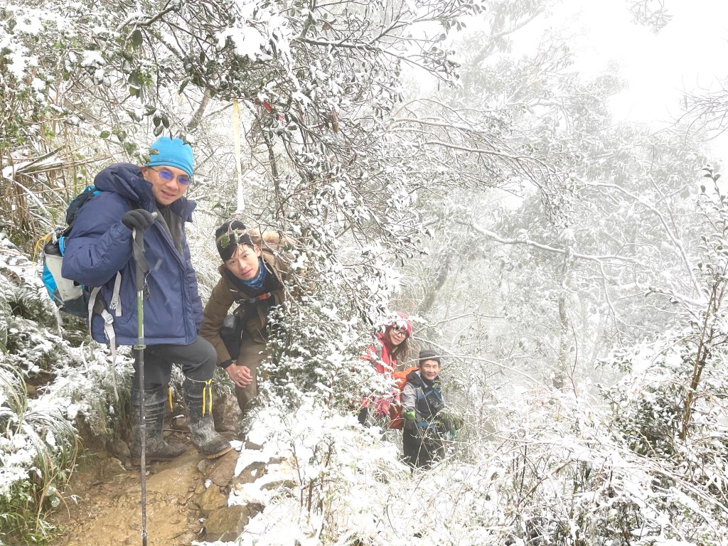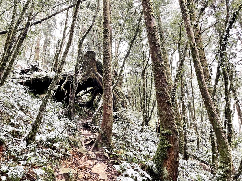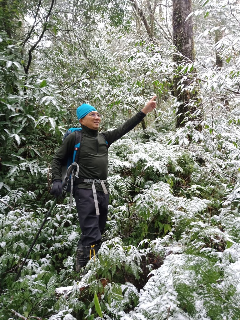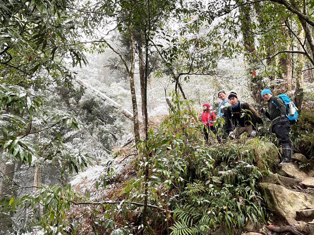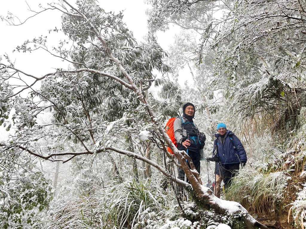 剛開始起登時,遠遠看著附近的其他山脈上,其山頭上都是白藹藹的一片,心裡滿是欽羨之情,就怕我們今天沒有這種福氣。從起登開始一直到水龍頭營地為止,只有看到路徑邊的樹叢裡偶爾有一些碎雪,心裡其實是有期待的,但是又覺得松蘿湖海拔不夠高,也許今天就僅能「爬」山吧!沒有想到,過了海拔1100m之後,碎雪變成了整片,樹梢都披上了白衣,而過了拳頭母山岔一直到松蘿湖,一路都在飄著細雪,整路上都是驚訝聲不斷,或許在其他高緯度國家這是冬天的常態,但在台灣,真是天上掉下來的禮物!