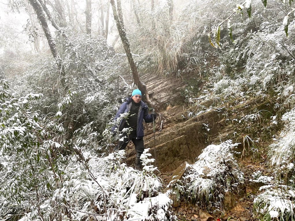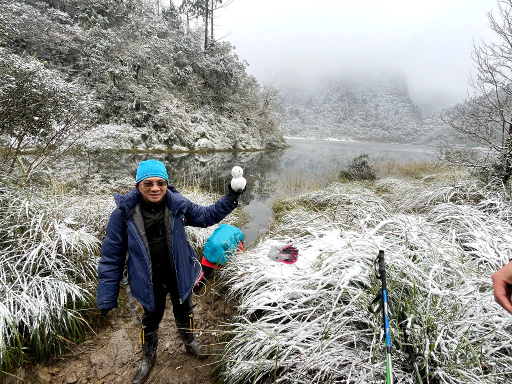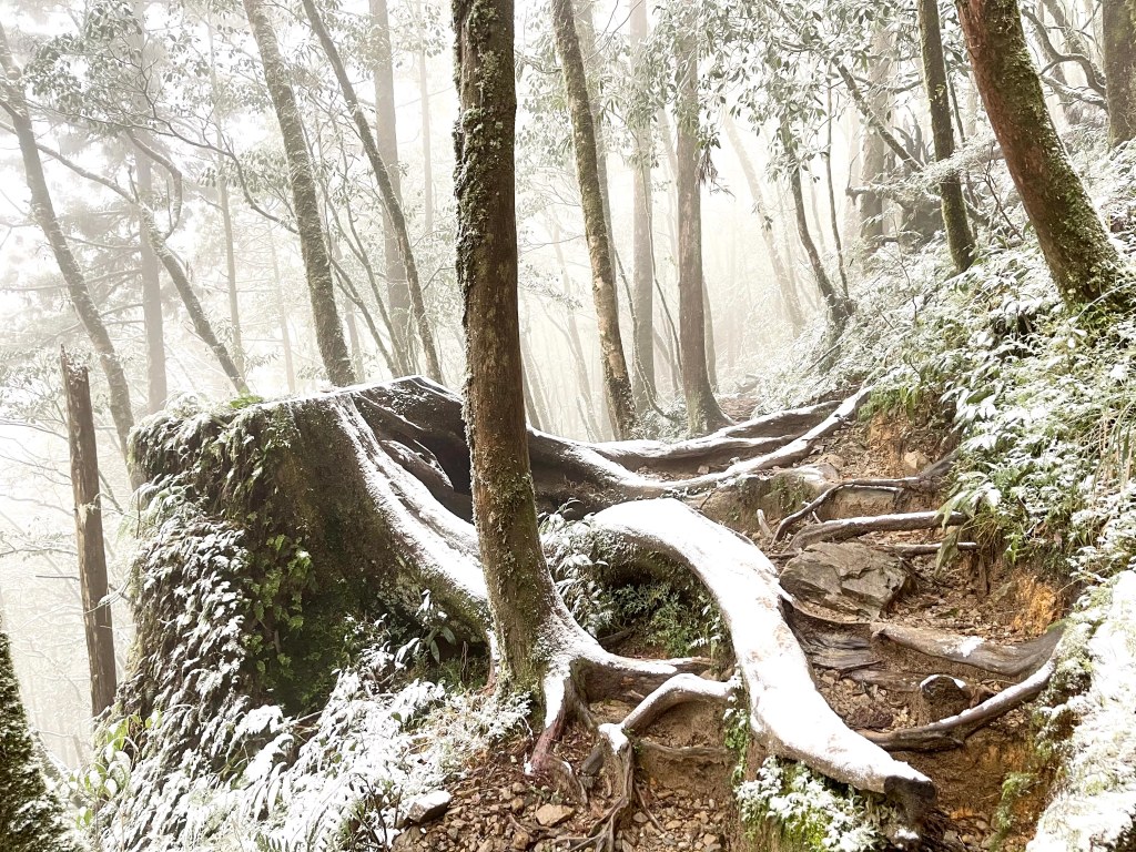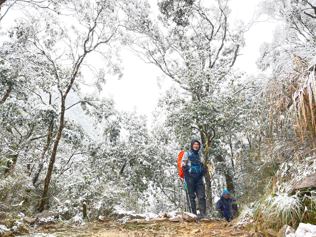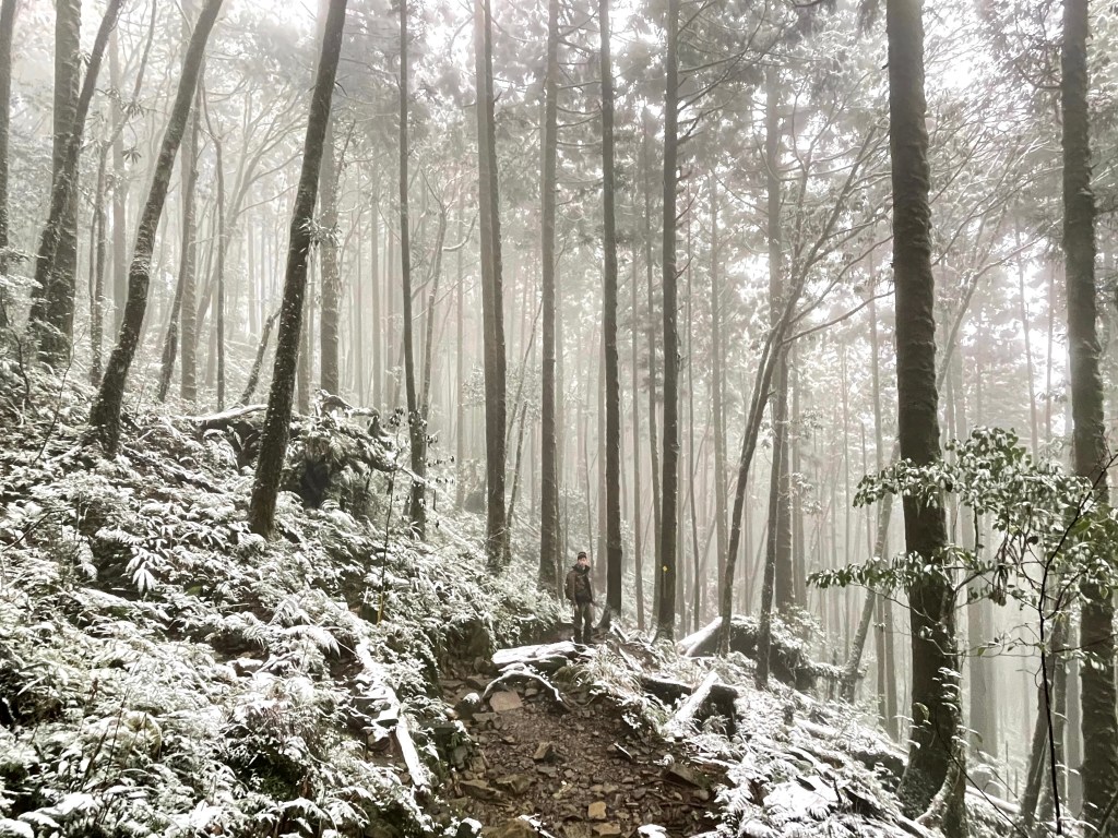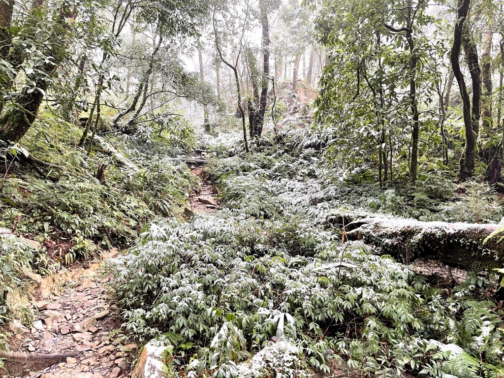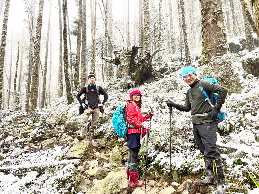剛開始起登時,遠遠看著附近的其他山脈上,其山頭上都是白藹藹的一片,心裡滿是欽羨之情,就怕我們今天沒有這種福氣。從起登開始一直到水龍頭營地為止,只有看到路徑邊的樹叢裡偶爾有一些碎雪,心裡其實是有期待的,但是又覺得松蘿湖海拔不夠高,也許今天就僅能「爬」山吧!沒有想到,過了海拔1100m之後,碎雪變成了整片,樹梢都披上了白衣,而過了拳頭母山岔一直到松蘿湖,一路都在飄著細雪,整路上都是驚訝聲不斷,或許在其他高緯度國家這是冬天的常態,但在台灣,真是天上掉下來的禮物!