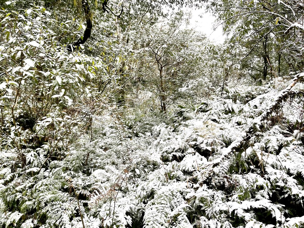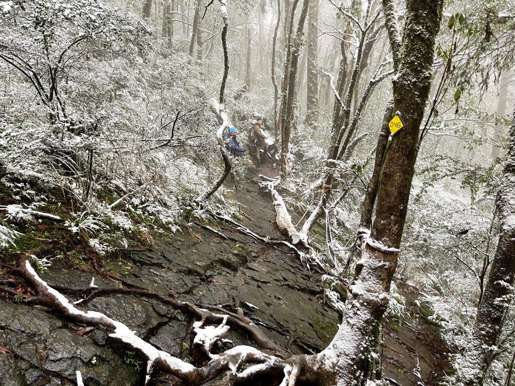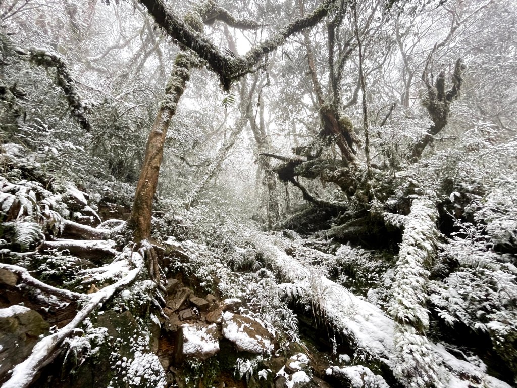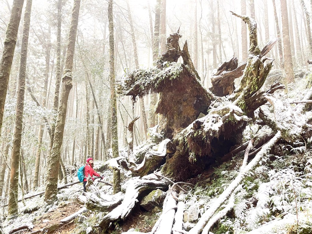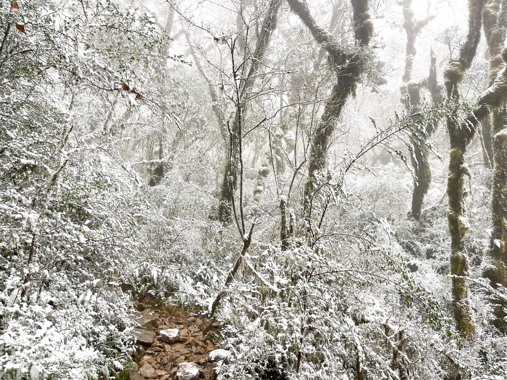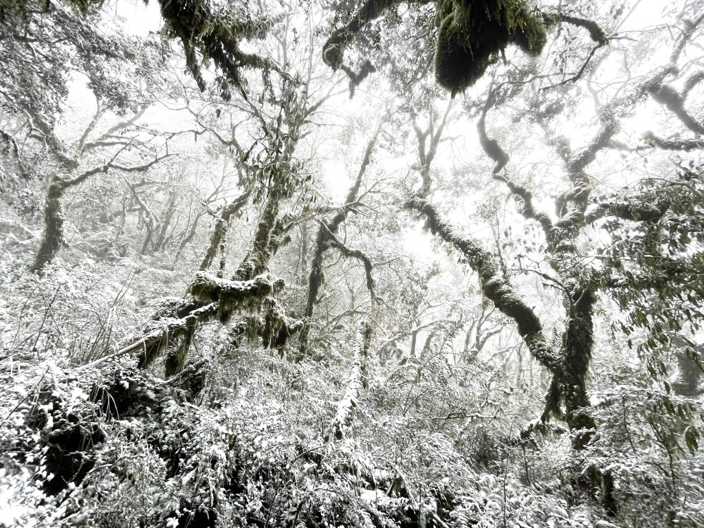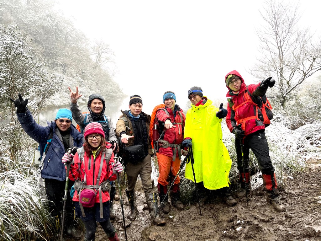 剛開始起登時,遠遠看著附近的其他山脈上,其山頭上都是白藹藹的一片,心裡滿是欽羨之情,就怕我們今天沒有這種福氣。從起登開始一直到水龍頭營地為止,只有看到路徑邊的樹叢裡偶爾有一些碎雪,心裡其實是有期待的,但是又覺得松蘿湖海拔不夠高,也許今天就僅能「爬」山吧!沒有想到,過了海拔1100m之後,碎雪變成了整片,樹梢都披上了白衣,而過了拳頭母山岔一直到松蘿湖,一路都在飄著細雪,整路上都是驚訝聲不斷,或許在其他高緯度國家這是冬天的常態,但在台灣,真是天上掉下來的禮物!