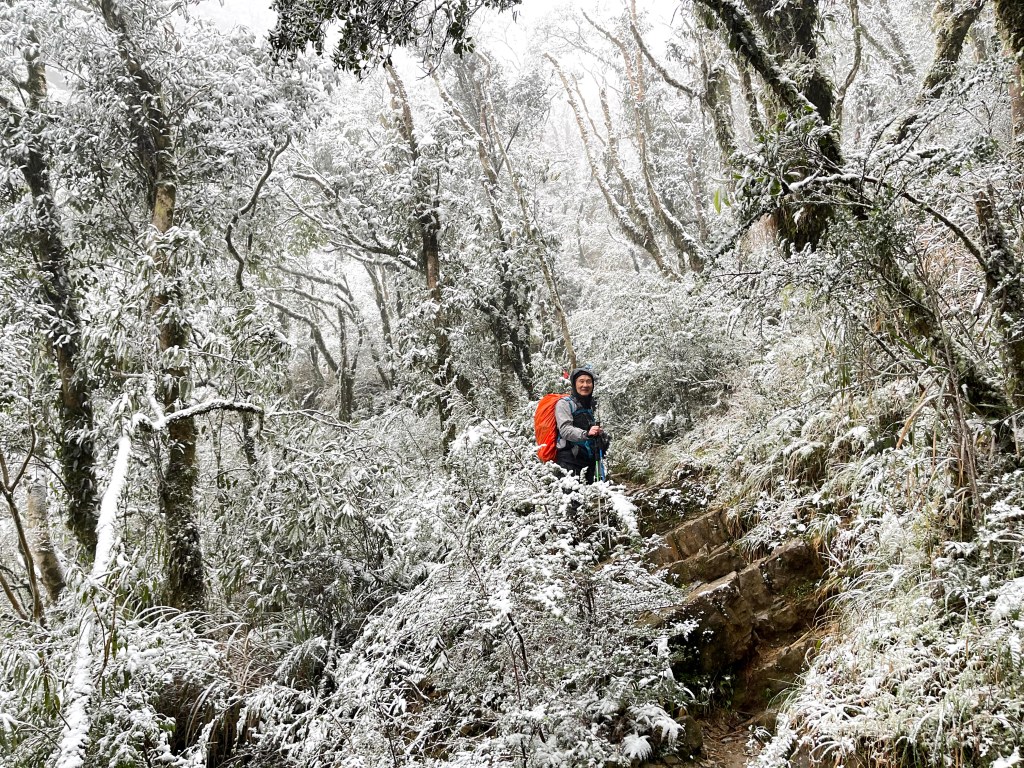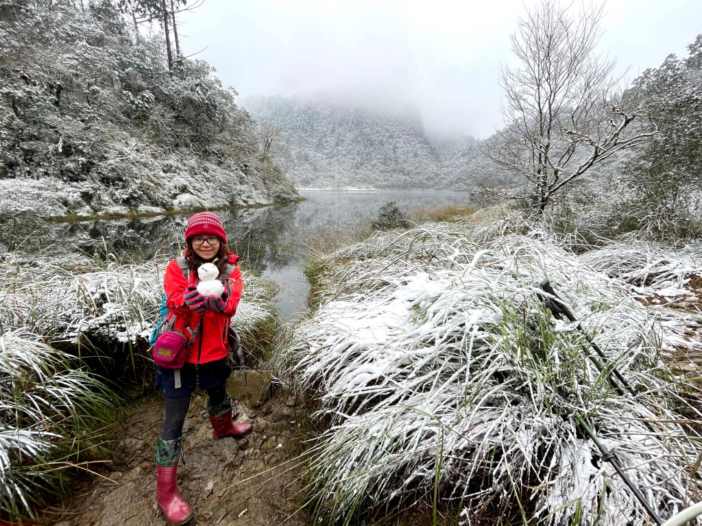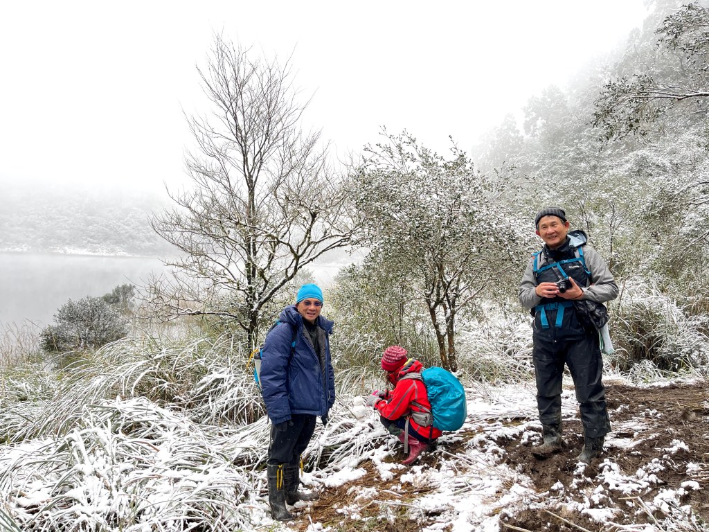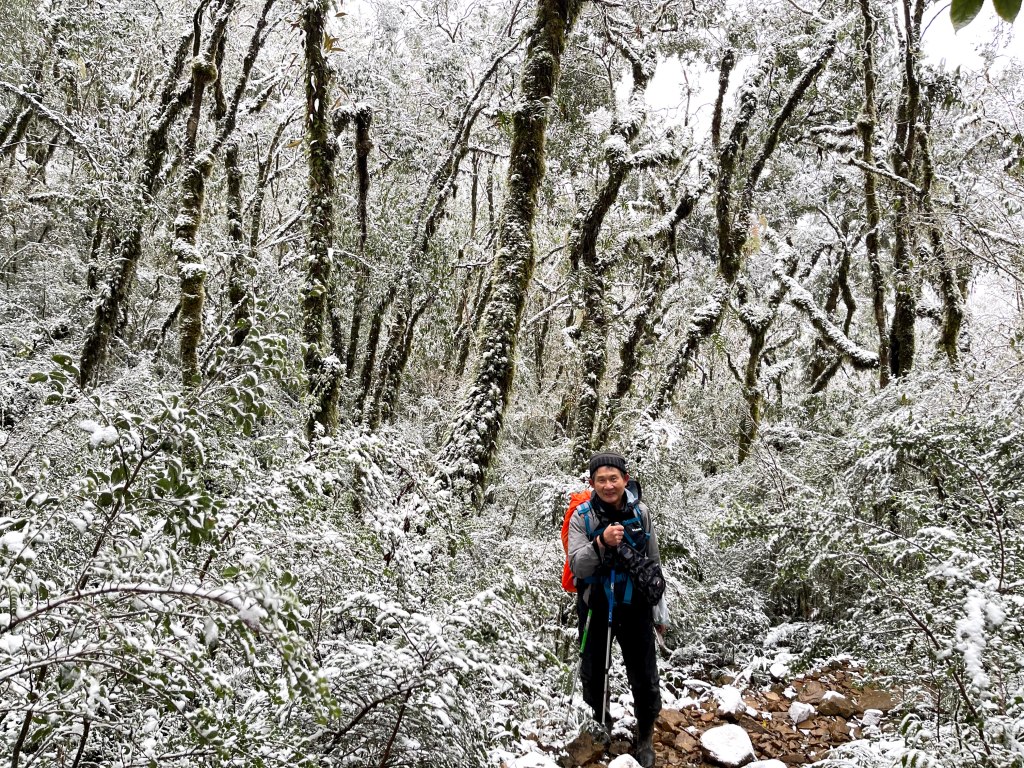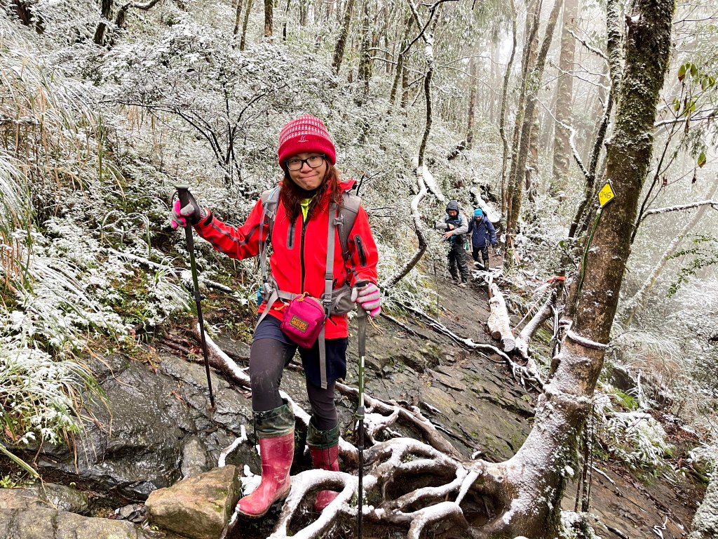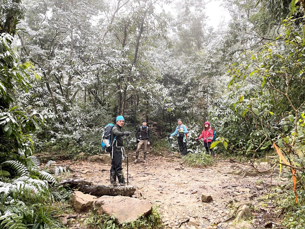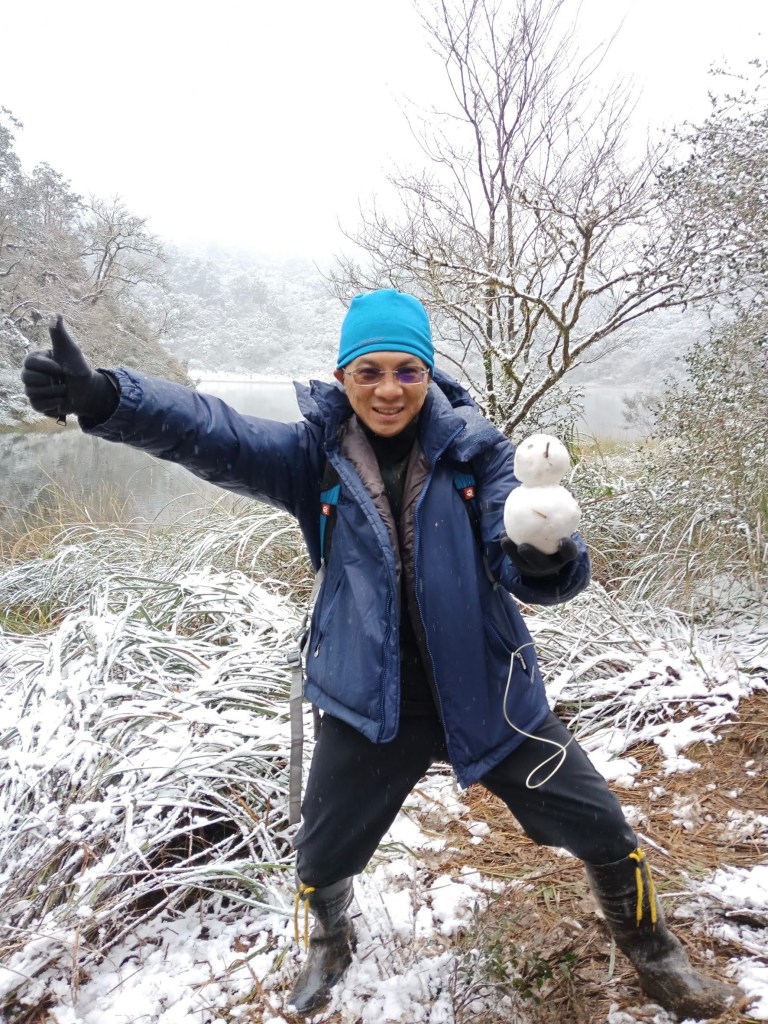 剛開始起登時,遠遠看著附近的其他山脈上,其山頭上都是白藹藹的一片,心裡滿是欽羨之情,就怕我們今天沒有這種福氣。從起登開始一直到水龍頭營地為止,只有看到路徑邊的樹叢裡偶爾有一些碎雪,心裡其實是有期待的,但是又覺得松蘿湖海拔不夠高,也許今天就僅能「爬」山吧!沒有想到,過了海拔1100m之後,碎雪變成了整片,樹梢都披上了白衣,而過了拳頭母山岔一直到松蘿湖,一路都在飄著細雪,整路上都是驚訝聲不斷,或許在其他高緯度國家這是冬天的常態,但在台灣,真是天上掉下來的禮物!