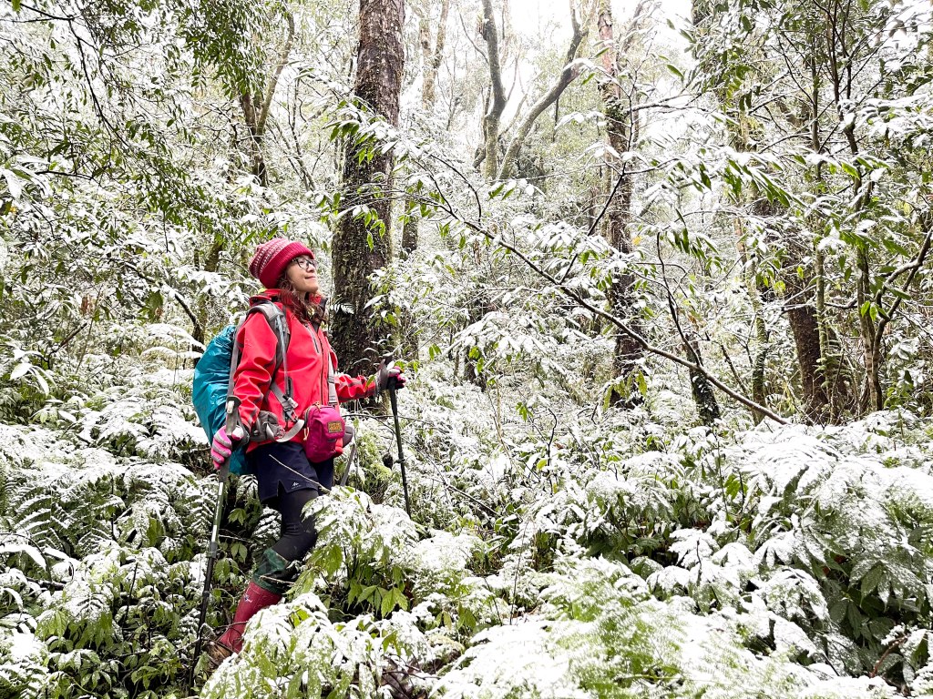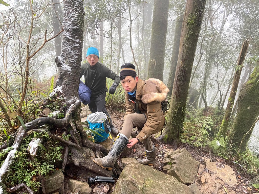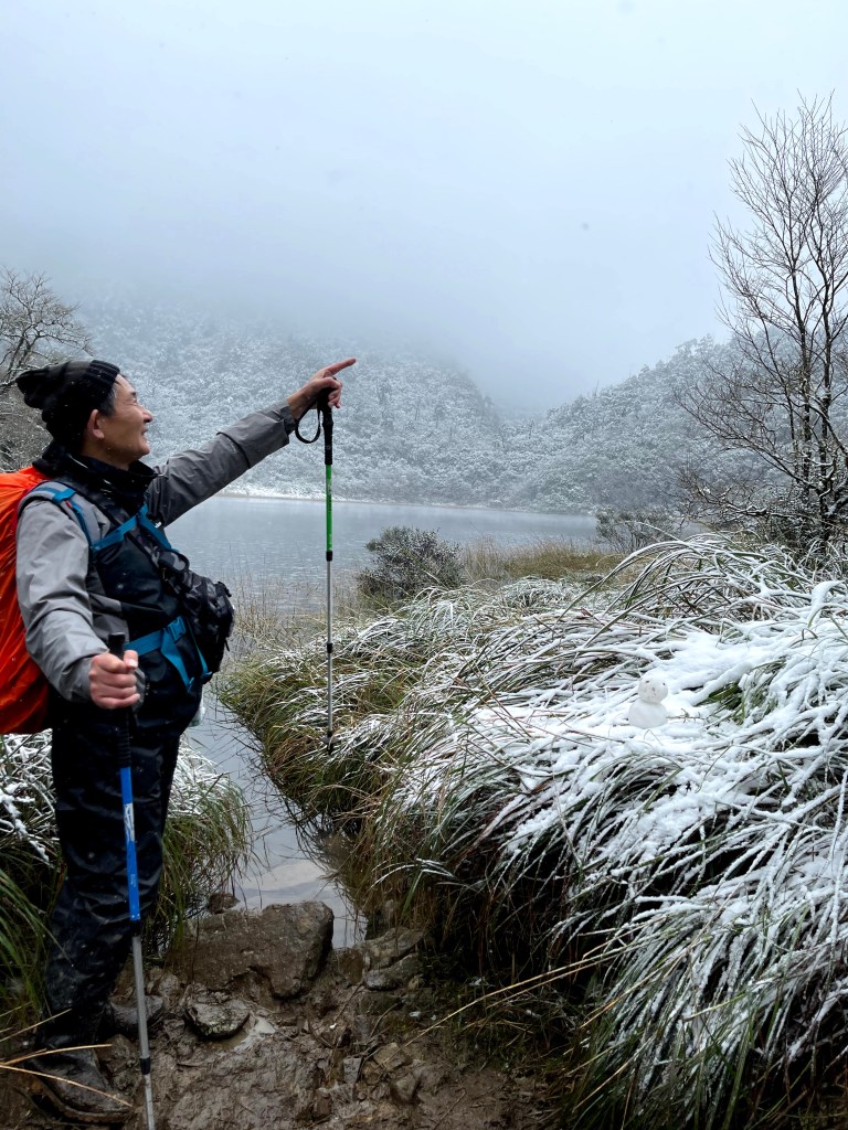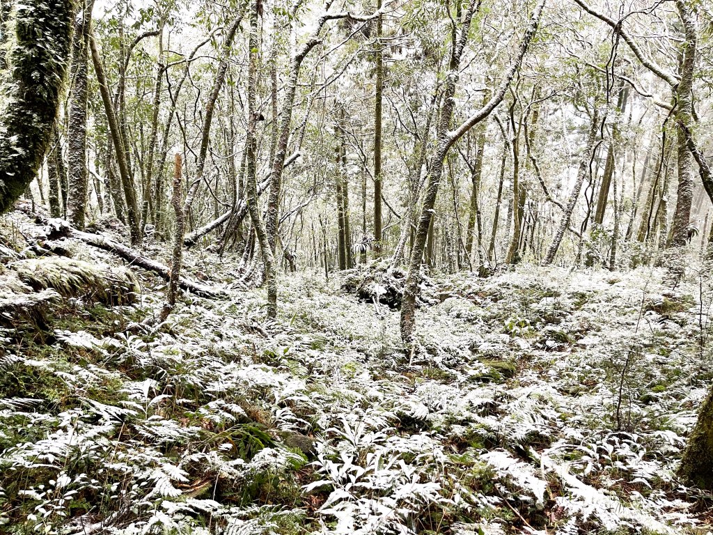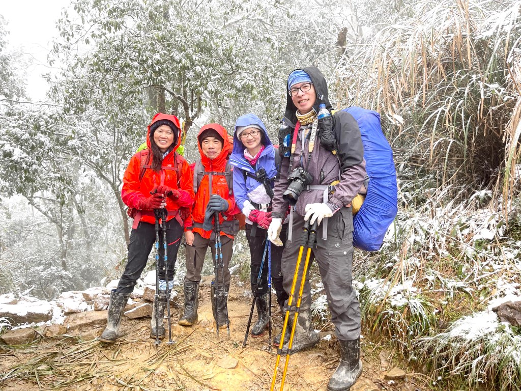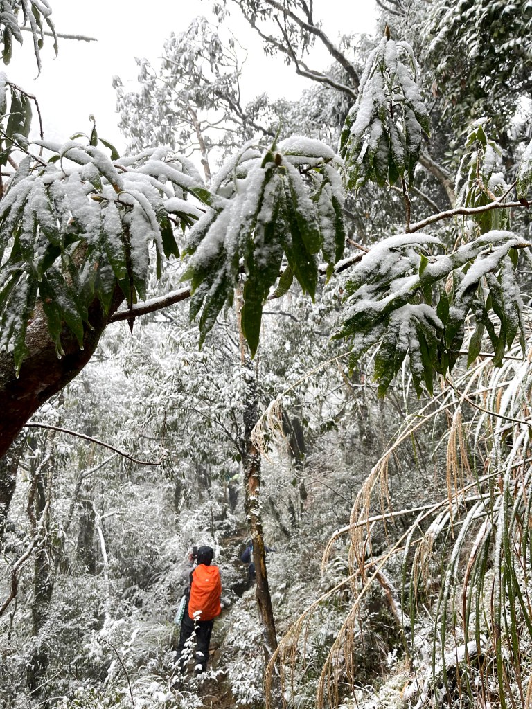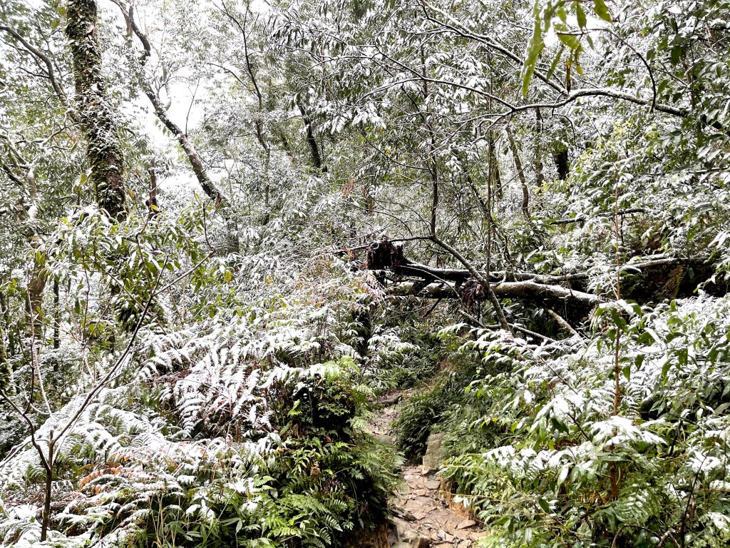 剛開始起登時,遠遠看著附近的其他山脈上,其山頭上都是白藹藹的一片,心裡滿是欽羨之情,就怕我們今天沒有這種福氣。從起登開始一直到水龍頭營地為止,只有看到路徑邊的樹叢裡偶爾有一些碎雪,心裡其實是有期待的,但是又覺得松蘿湖海拔不夠高,也許今天就僅能「爬」山吧!沒有想到,過了海拔1100m之後,碎雪變成了整片,樹梢都披上了白衣,而過了拳頭母山岔一直到松蘿湖,一路都在飄著細雪,整路上都是驚訝聲不斷,或許在其他高緯度國家這是冬天的常態,但在台灣,真是天上掉下來的禮物!
