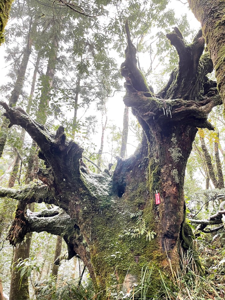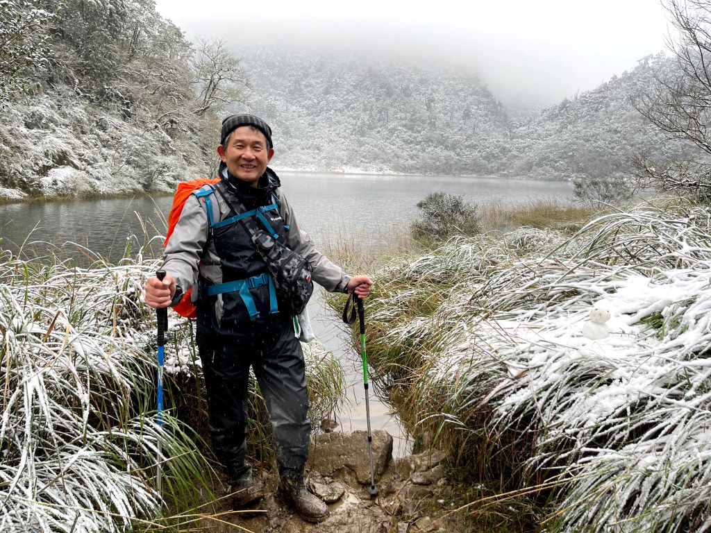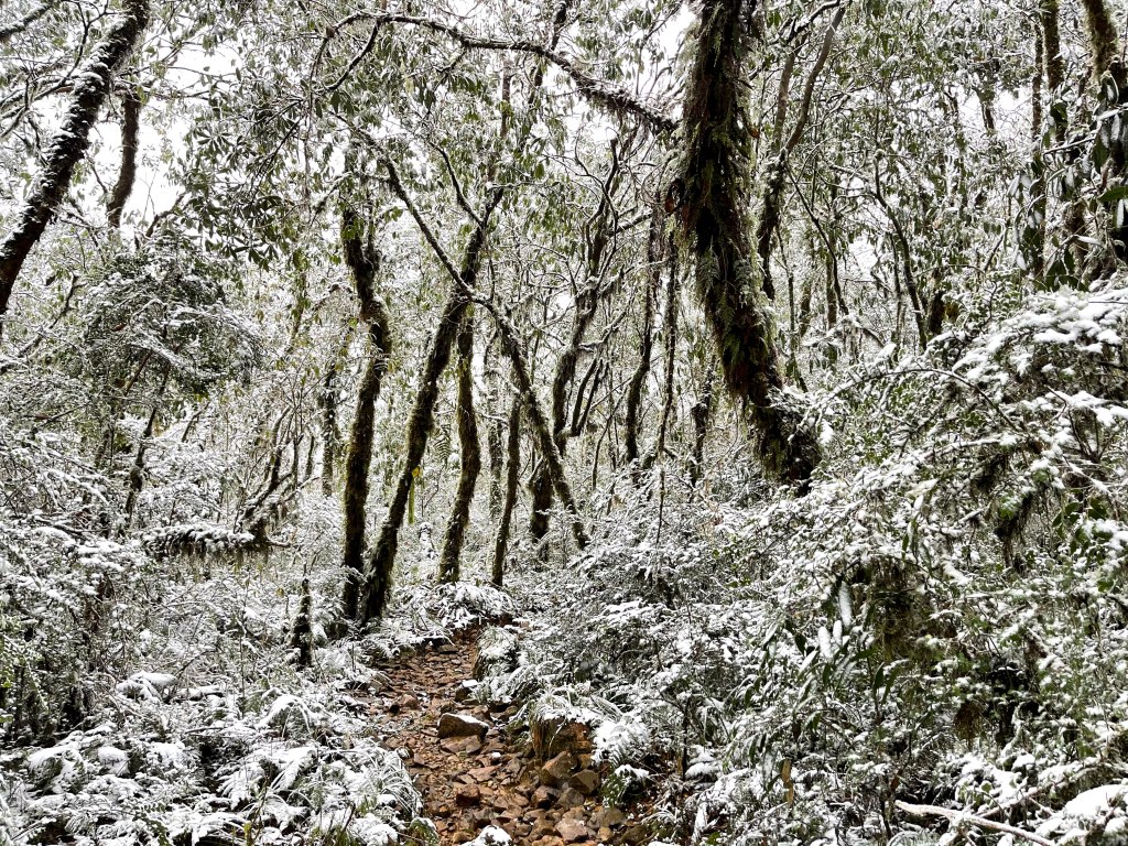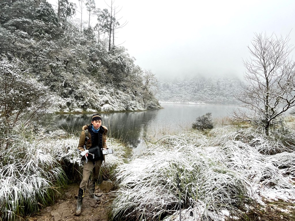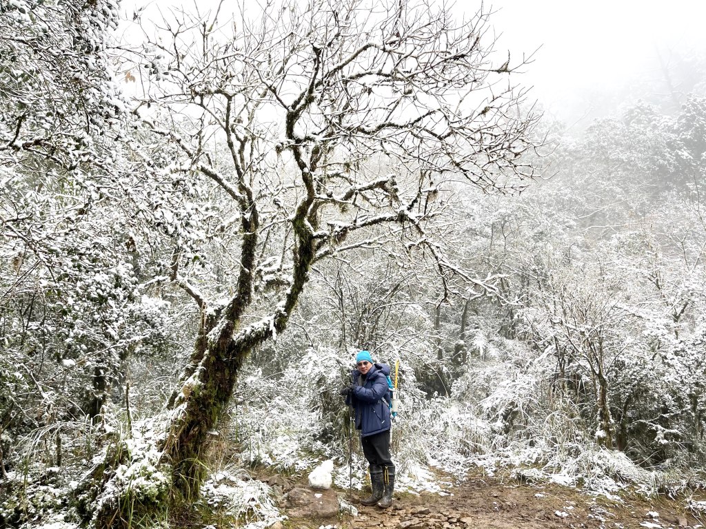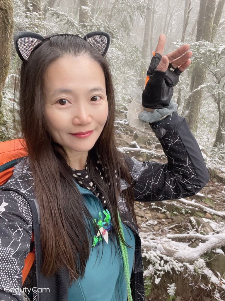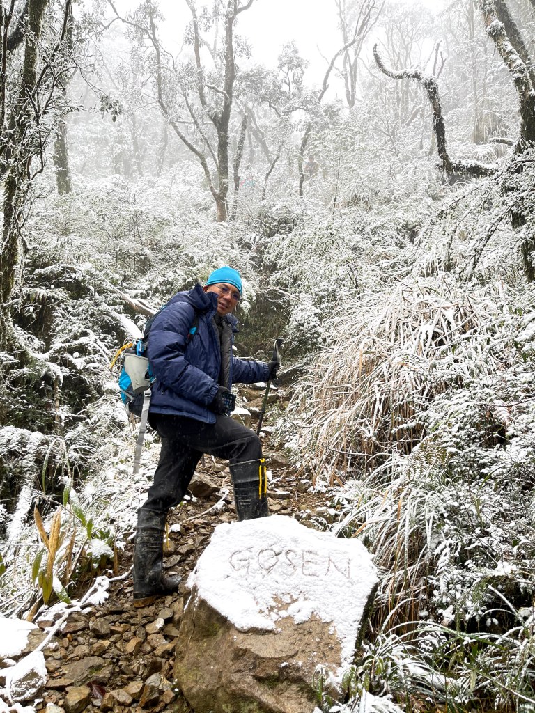 剛開始起登時,遠遠看著附近的其他山脈上,其山頭上都是白藹藹的一片,心裡滿是欽羨之情,就怕我們今天沒有這種福氣。從起登開始一直到水龍頭營地為止,只有看到路徑邊的樹叢裡偶爾有一些碎雪,心裡其實是有期待的,但是又覺得松蘿湖海拔不夠高,也許今天就僅能「爬」山吧!沒有想到,過了海拔1100m之後,碎雪變成了整片,樹梢都披上了白衣,而過了拳頭母山岔一直到松蘿湖,一路都在飄著細雪,整路上都是驚訝聲不斷,或許在其他高緯度國家這是冬天的常態,但在台灣,真是天上掉下來的禮物!