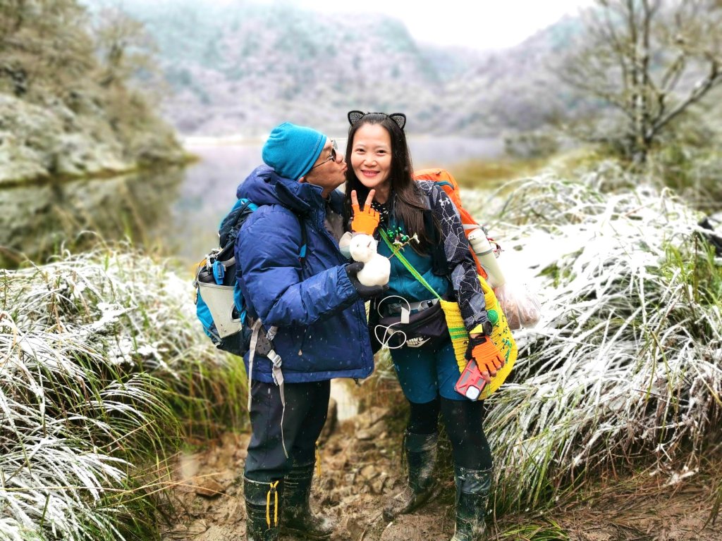 爬了三年的山,從沒有想過,有一天寫紀錄必須要戴墨鏡來看(哈哈哈,幽默一下!),因為下雪,松蘿湖就像是披著白紗的新娘子,美麗但仍藏不住其嬌羞之情,我們有幸也能躬逢其盛參與其中。