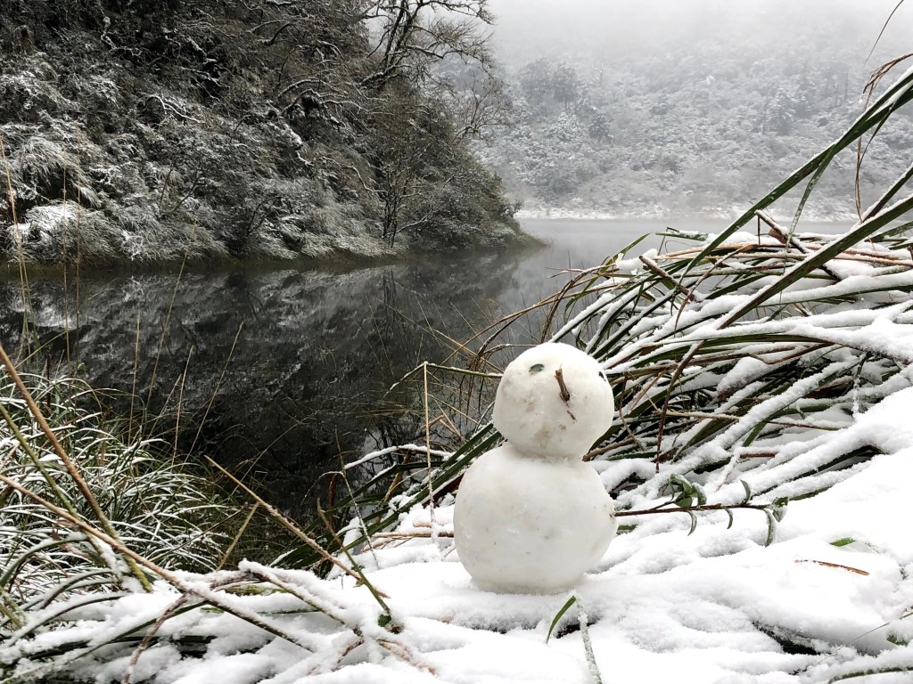 上圖:松蘿湖由20210108開始降下大雪,我們在0109上山時氣溫仍低,偶而下冰霰也偶有下雪,讓我們驚艷不已!也讓我們像小孩一樣堆起雪人!13:08