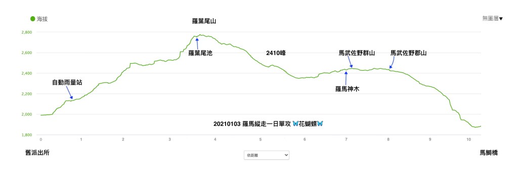 上圖:橫軸為距離,縱軸為海拔高度。由Garmin Fenix 6x所記錄。因為起登沒有做海拔校正,因此整個圖形的高度都要減掉60m。