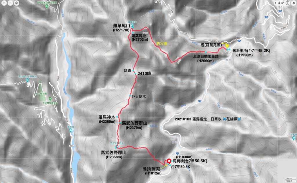 上圖:由Garmin Fenix 6x所記錄,羅馬縱走的靜態路徑圖。從思源舊派出所到馬鰣橋為止,總里程為10.3K。