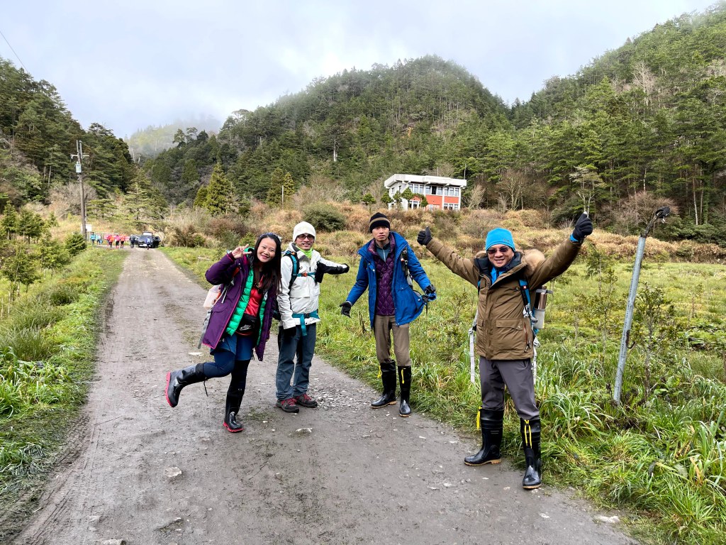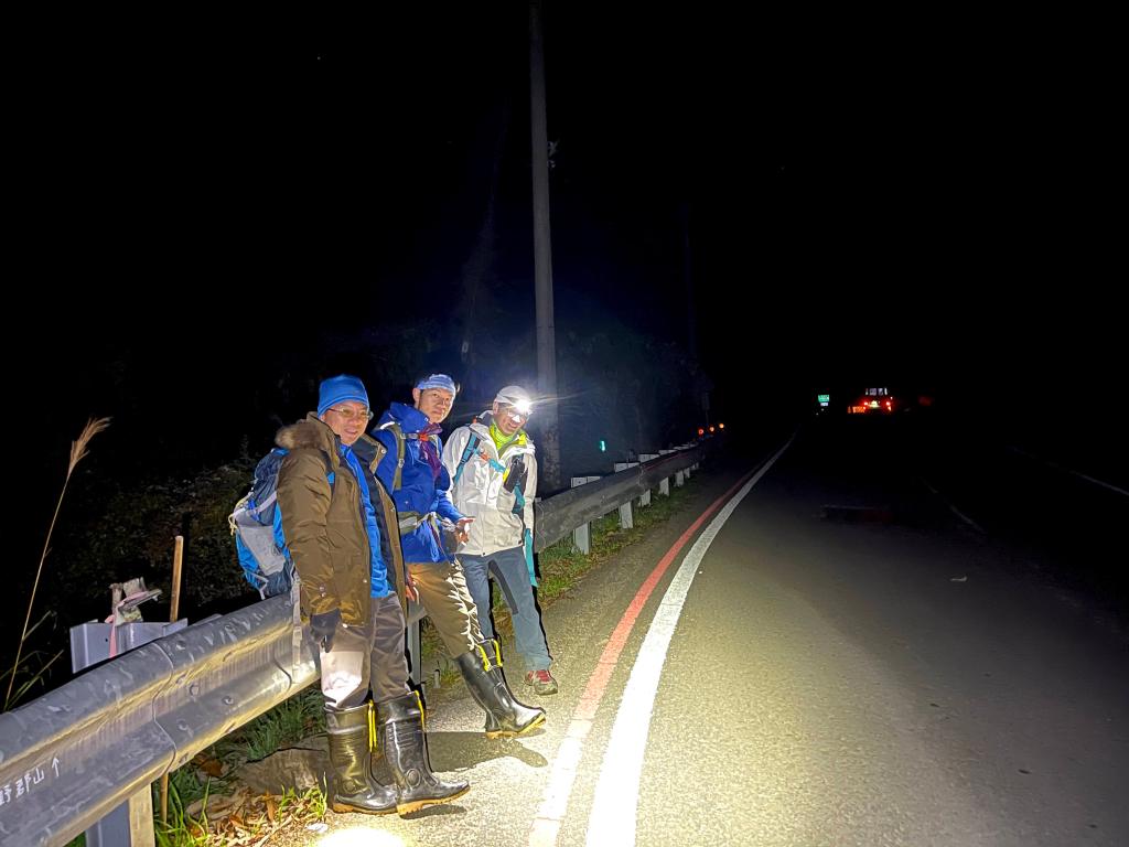 上圖:我們在台7甲40.2K的思源舊派出所準備起登。由左至右:Steven、阿志、我(Gosen)還有接駁大哥。後方的中巴就是我們今天搭乘的接駁車。09:16