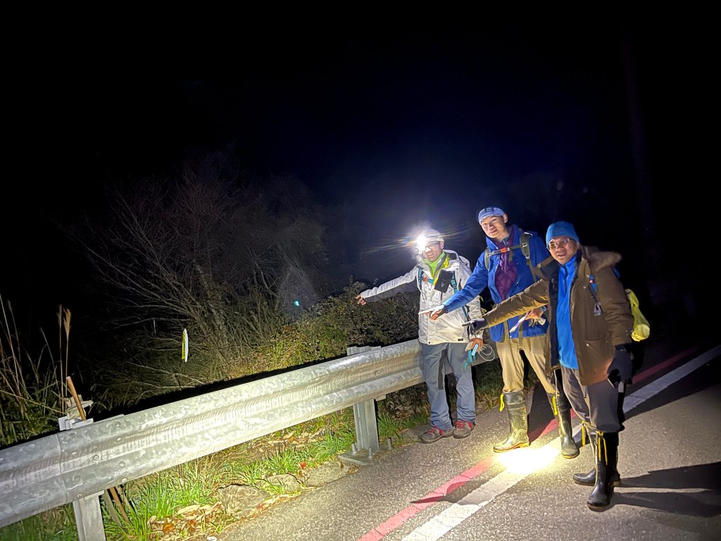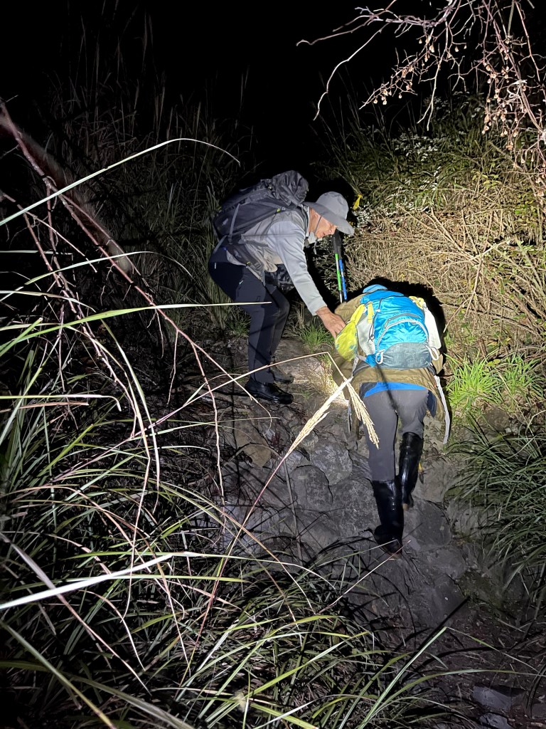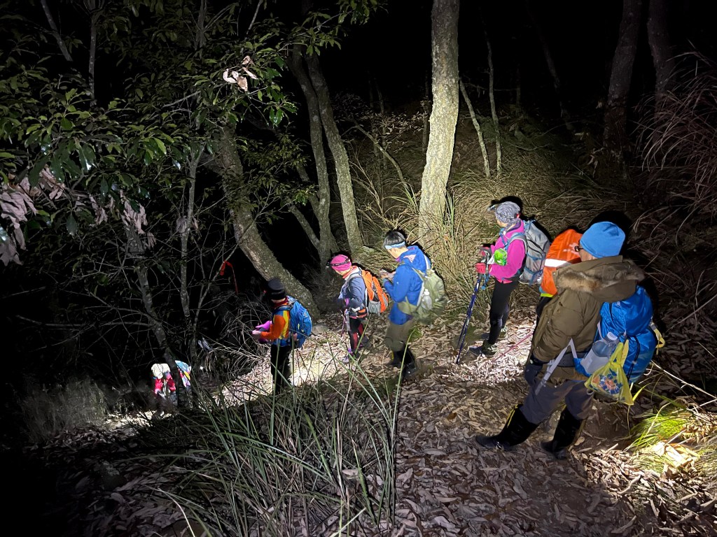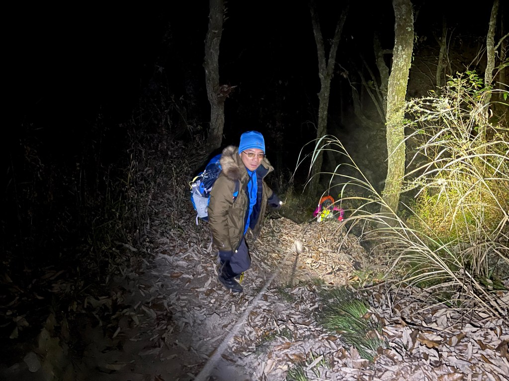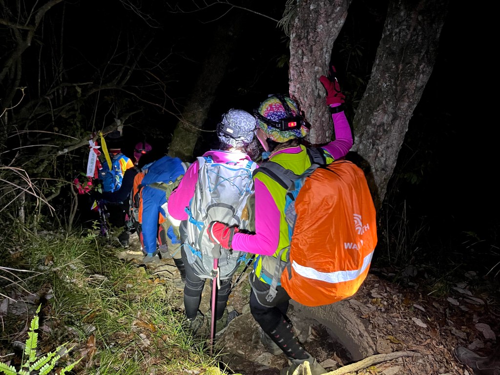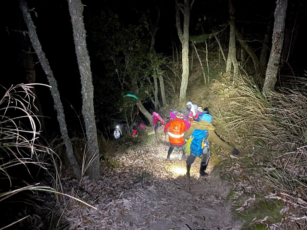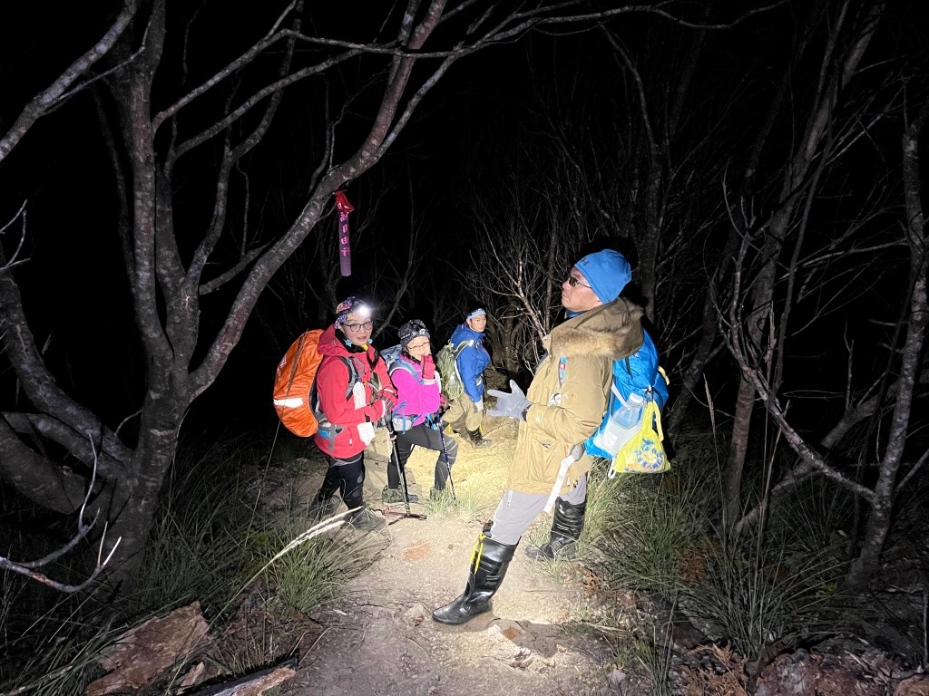 在下山的過程中,阿志當領隊,Andy大哥的9人團與Steven在中間,Smile與我押隊。阿志會引導大哥大姊們路徑上應注意的細節,讓大伙在摸黑下山過程中感受到安心。個人在此感謝阿志對大伙的付出。
