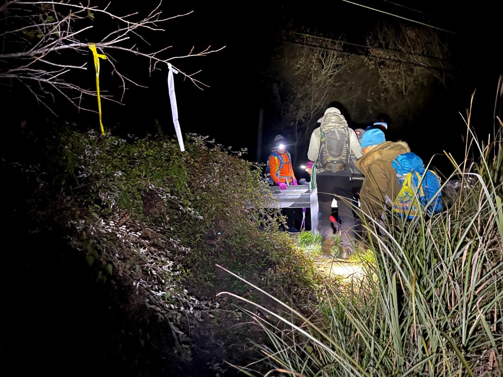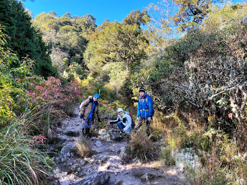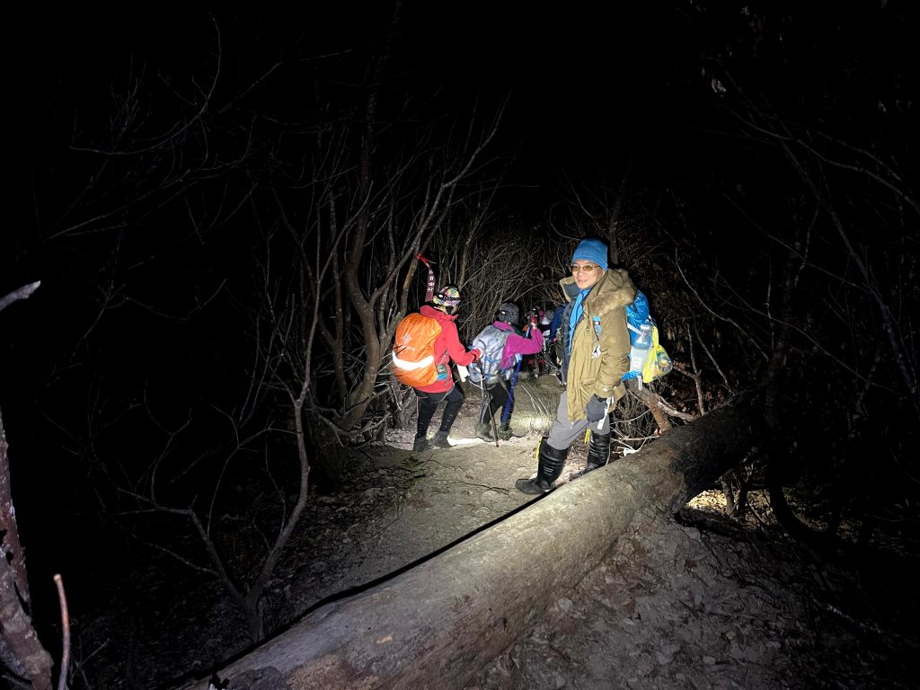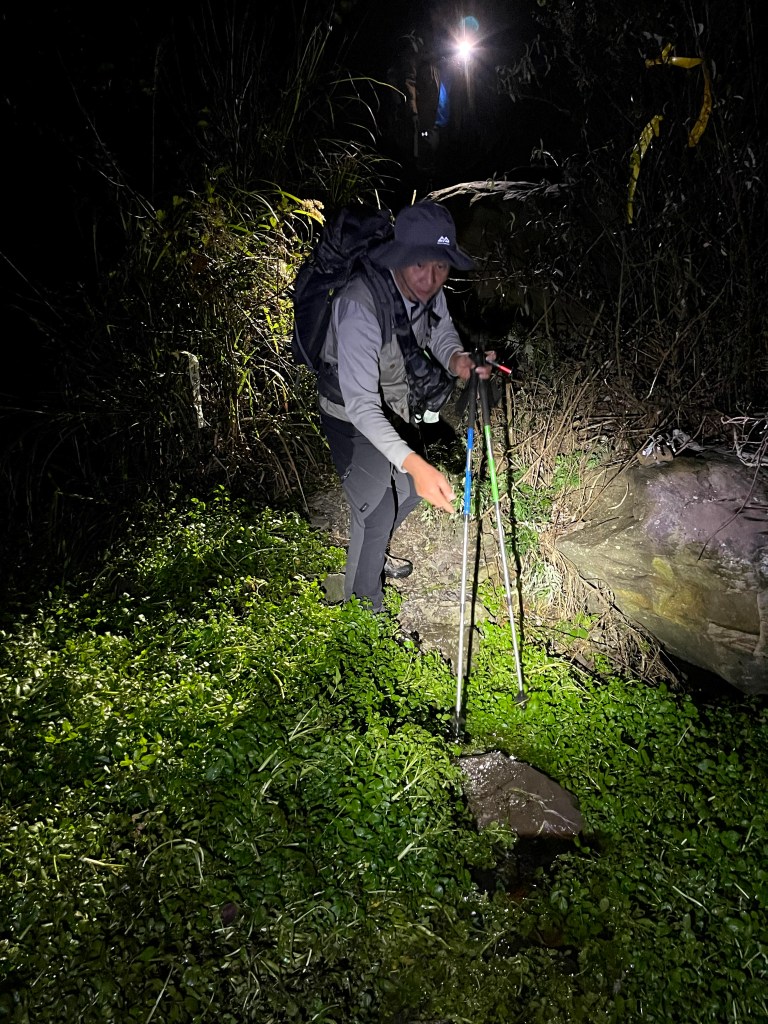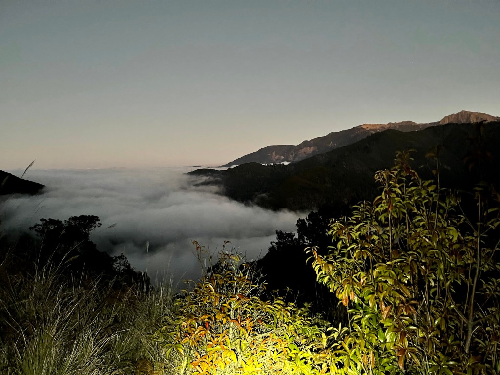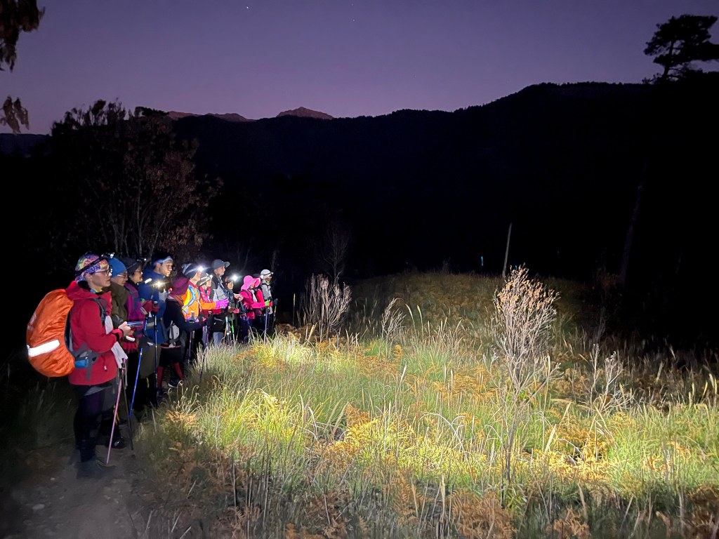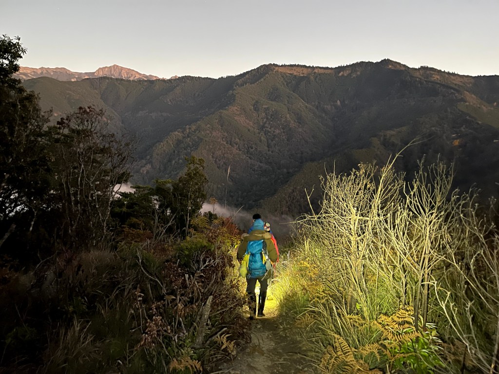 在下山的過程中,阿志當領隊,Andy大哥的9人團與Steven在中間,Smile與我押隊。阿志會引導大哥大姊們路徑上應注意的細節,讓大伙在摸黑下山過程中感受到安心。個人在此感謝阿志對大伙的付出。