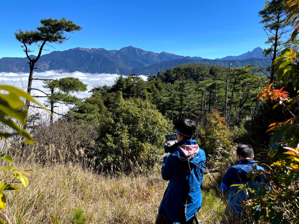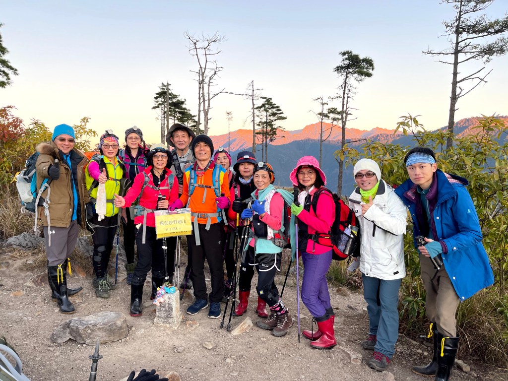 在下午4點半抵達馬武佐野郡山後,更讓人驚艷的是,往西邊望去,志佳陽大山、雪山、北稜角、雪山東峰、凱蘭特昆山、品田山、池有山及桃山等歷歷在目!此時我們4人在此先行吃點水果,空拍攝影等待Andy的大哥大姊團的到來,等候大伙都到齊了再一起下山。
