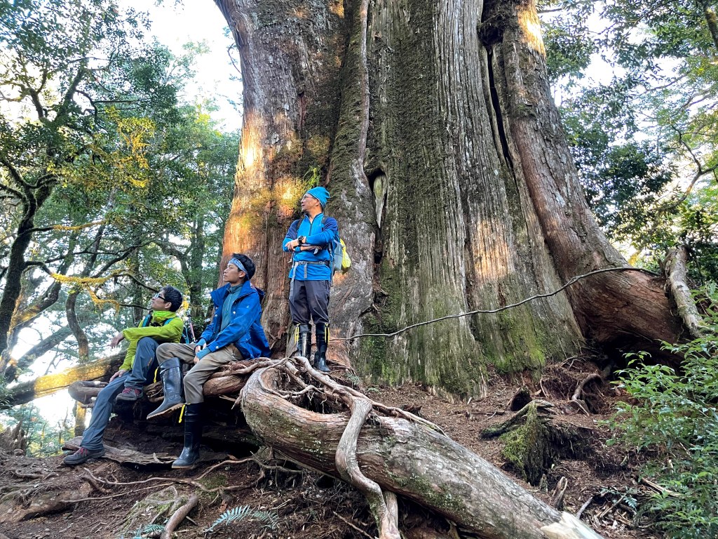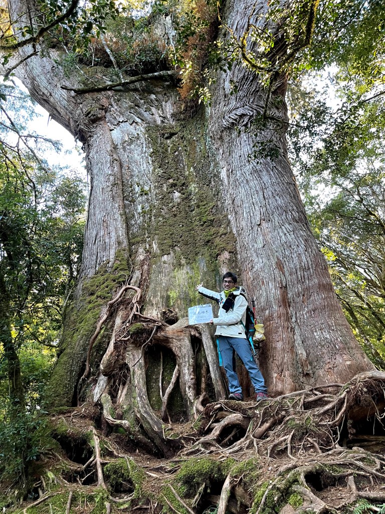 在接近馬武佐野郡山前1K會來到羅馬神木,還沒有到前就知道是很大的神木,但當實際看到的那一剎那,還是被其巨大威猛給震攝到!其後到達馬武佐野郡山前300m就會走出森林而走在草原區上,此時往左側看去,南湖大山整個在夕陽照射下呈現美極了的金黃色!也讓我們產生何時去親近此帝王之山的念頭?
