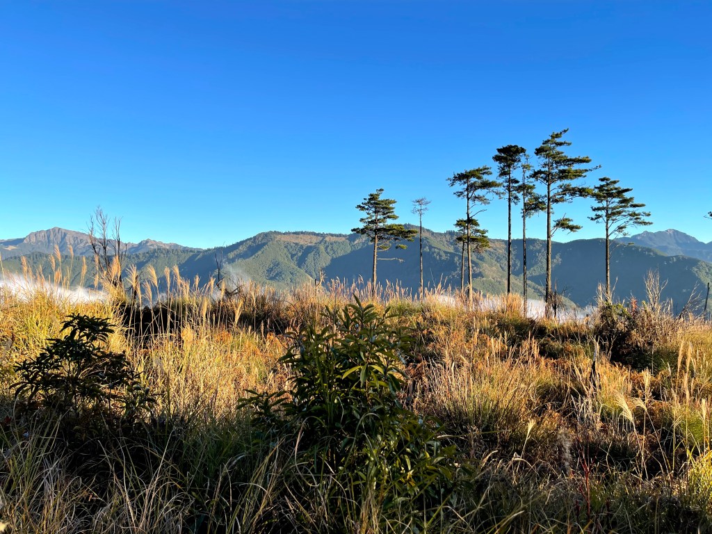 上圖:此時陽光照耀在草原區上,呈現金黃色的色調美感。左側是帝王之山–南湖大山!16:27