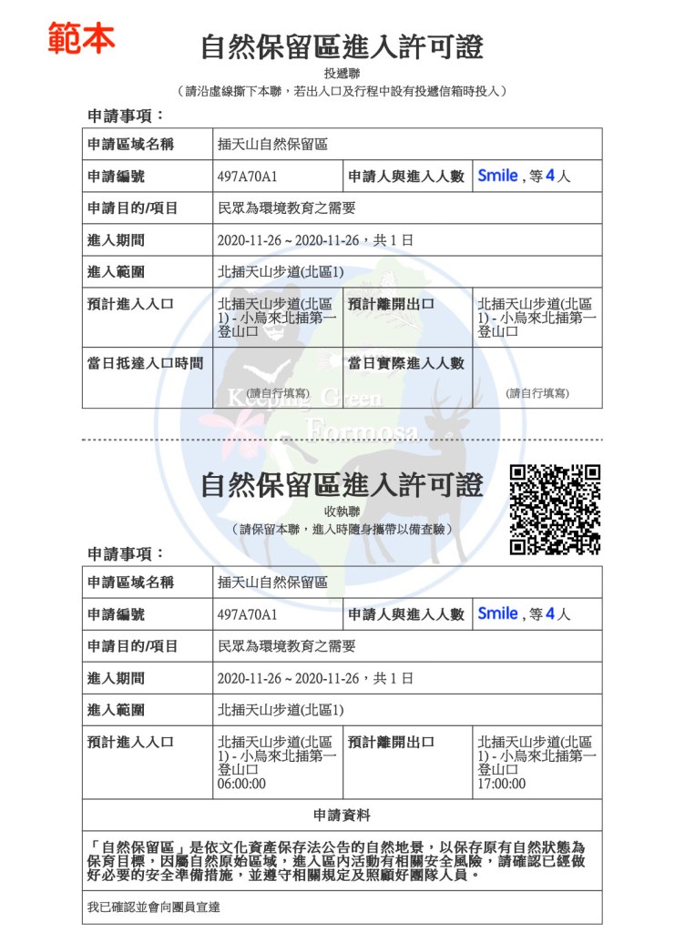 上圖:自然保留區進入許可證。一定要3人以上才能申請,如果登山當日無法至少3人成行,則不得進入自然保留區。