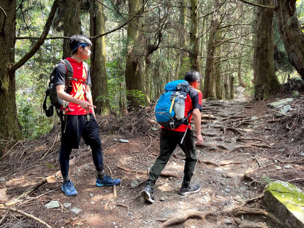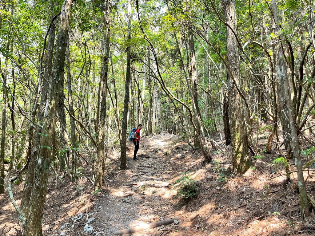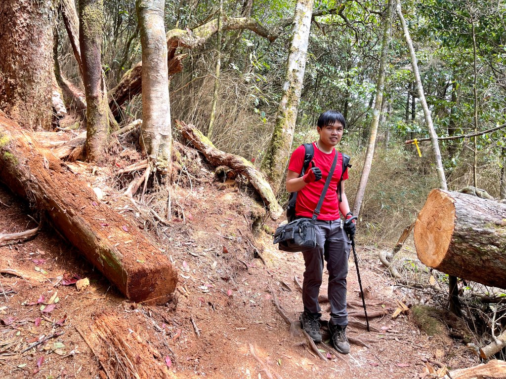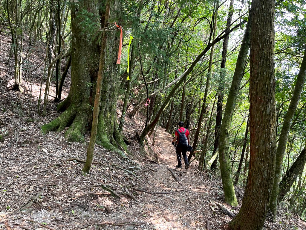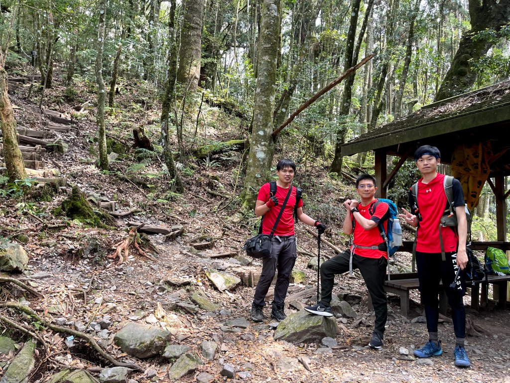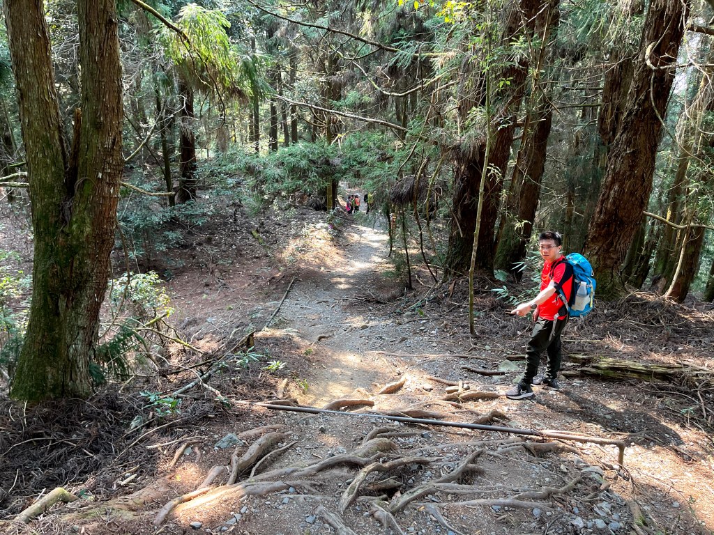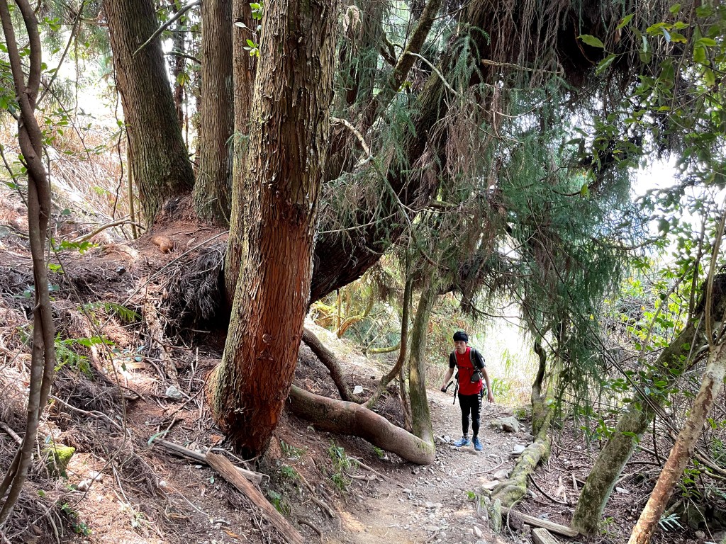 上圖:接下來的路徑緩緩而上,且為柔軟的松針路徑,Smile幫我們拍照,Steven居然把Gropro桿子當作棒球棒在揮,我(Gosen)也順勢擺出正要接球的捕手姿勢。