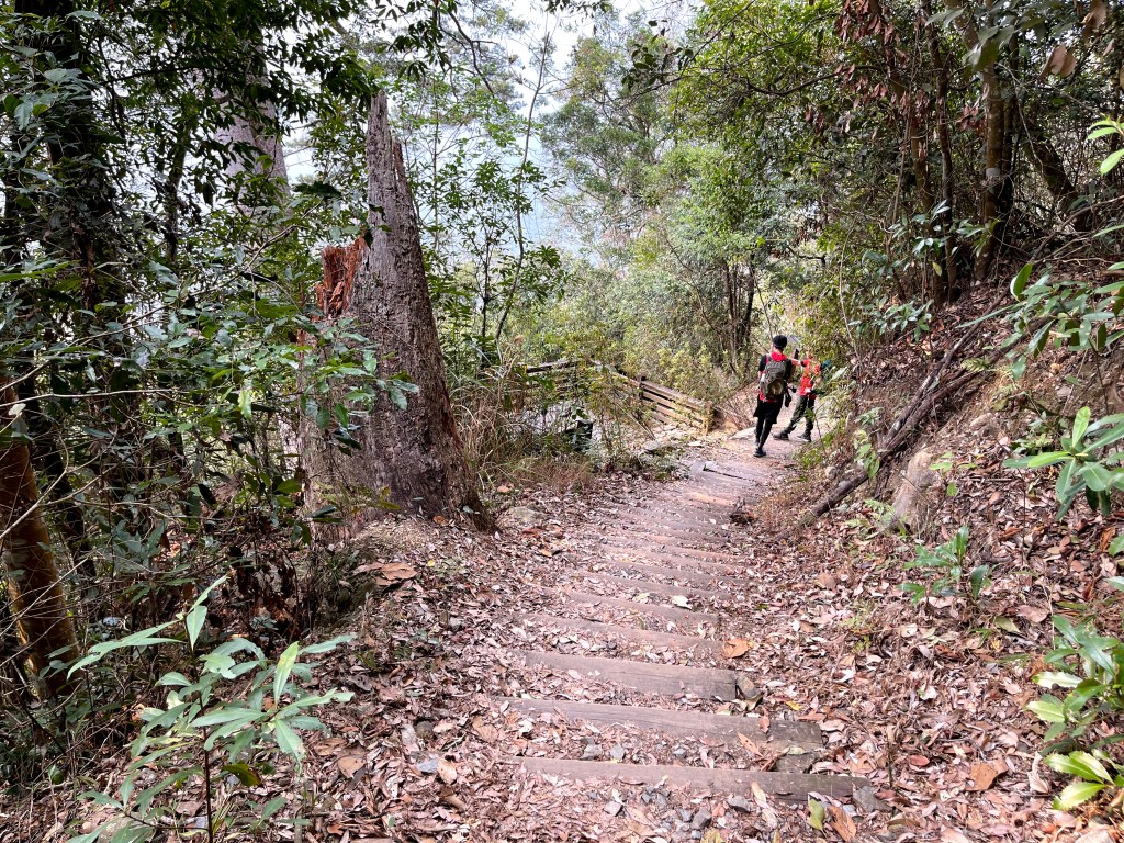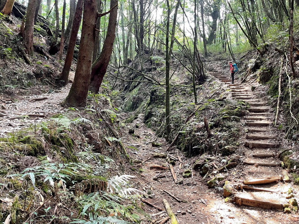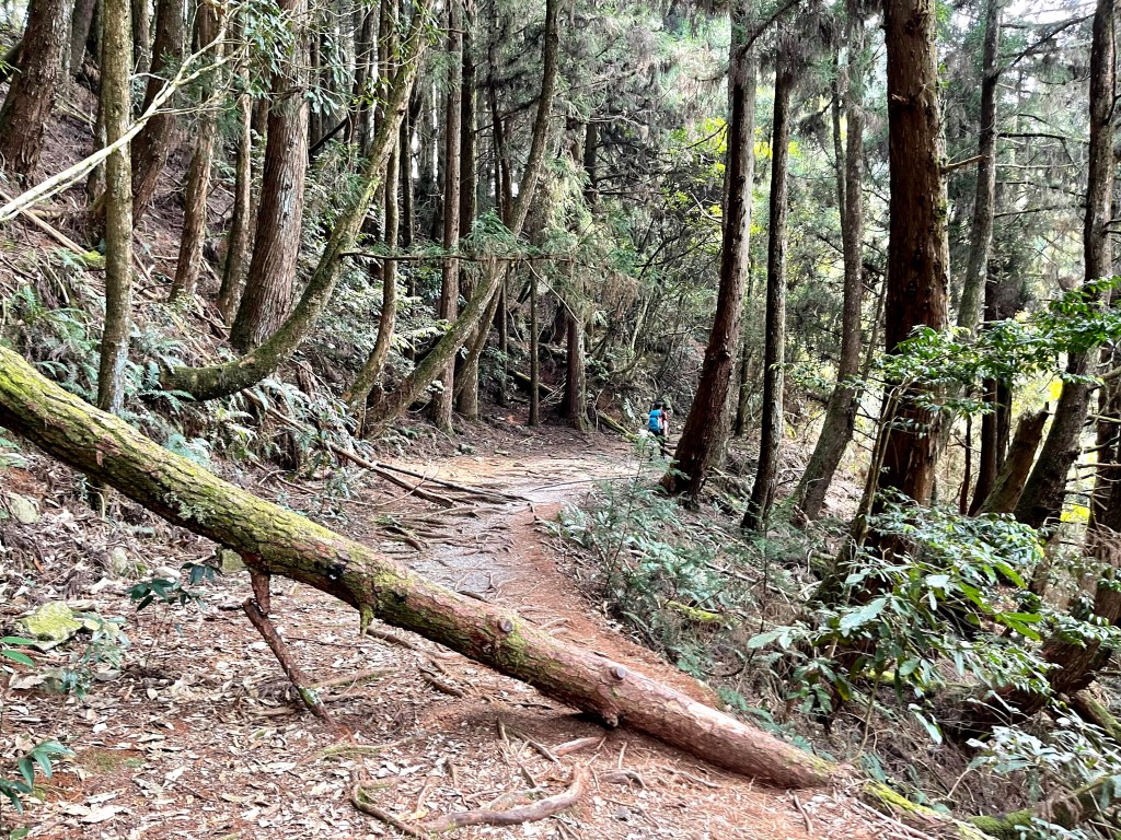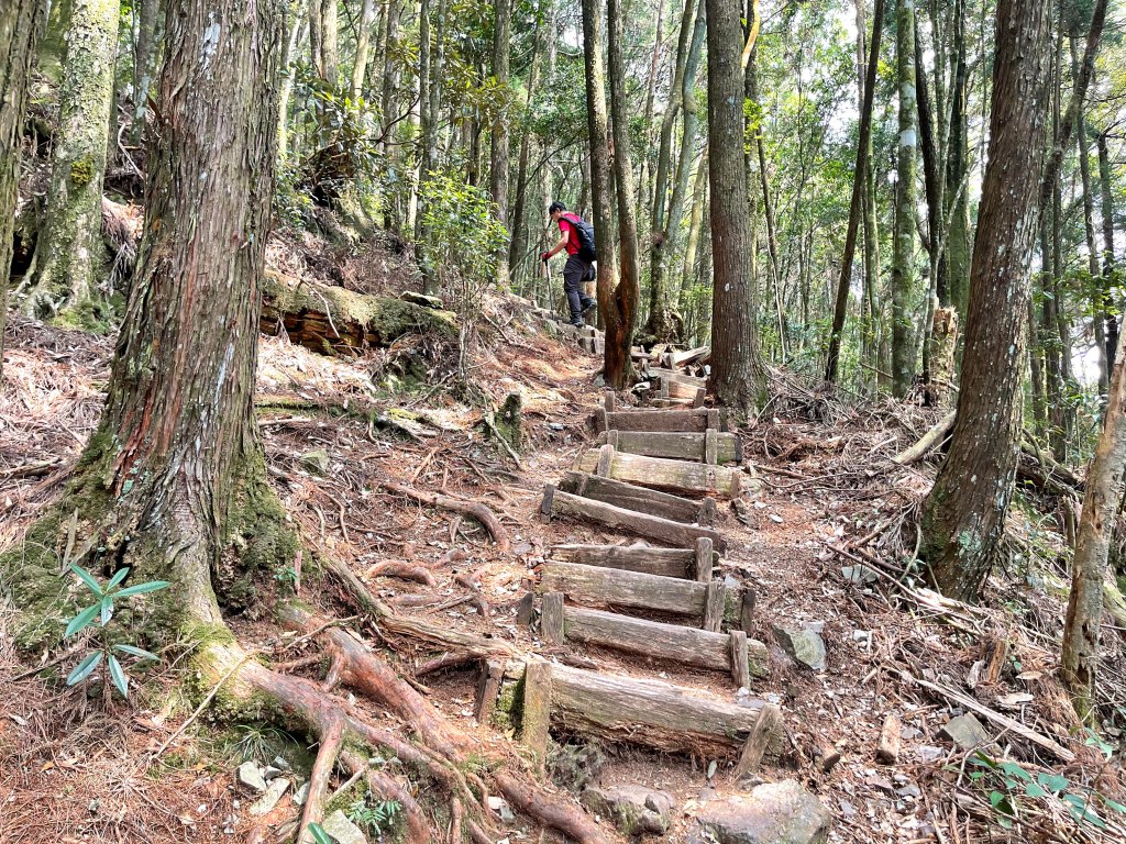 上圖:過倒木後,路徑轉為陡下,經過木枕路陡下時,就會到達前方的觀景台。
