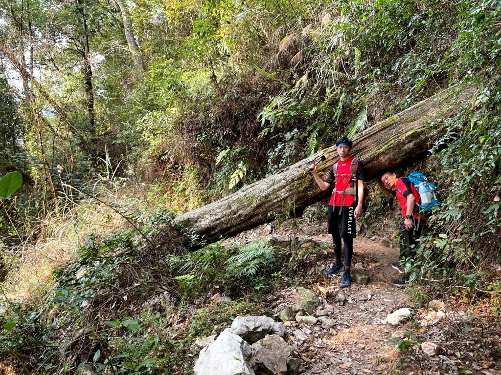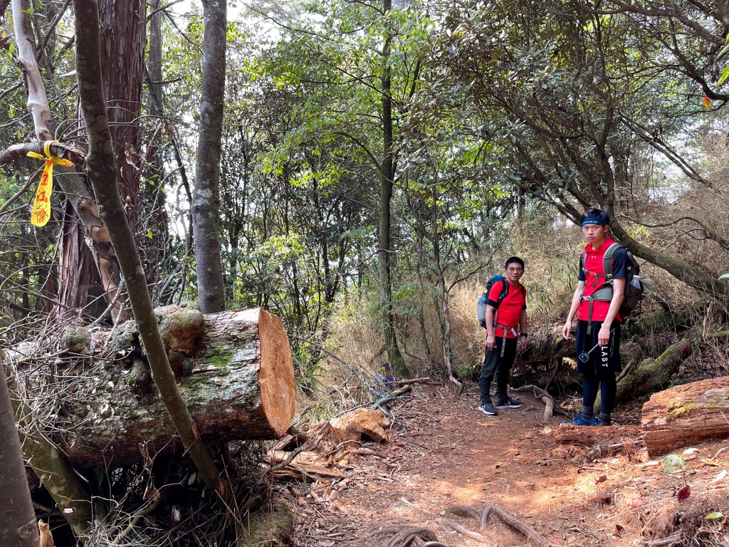 上圖:陡上後路徑再轉為平緩,看到這個鋸木,就表示馬崙山要到了。