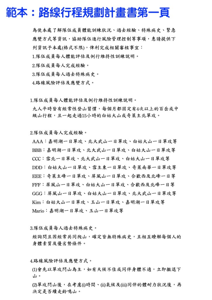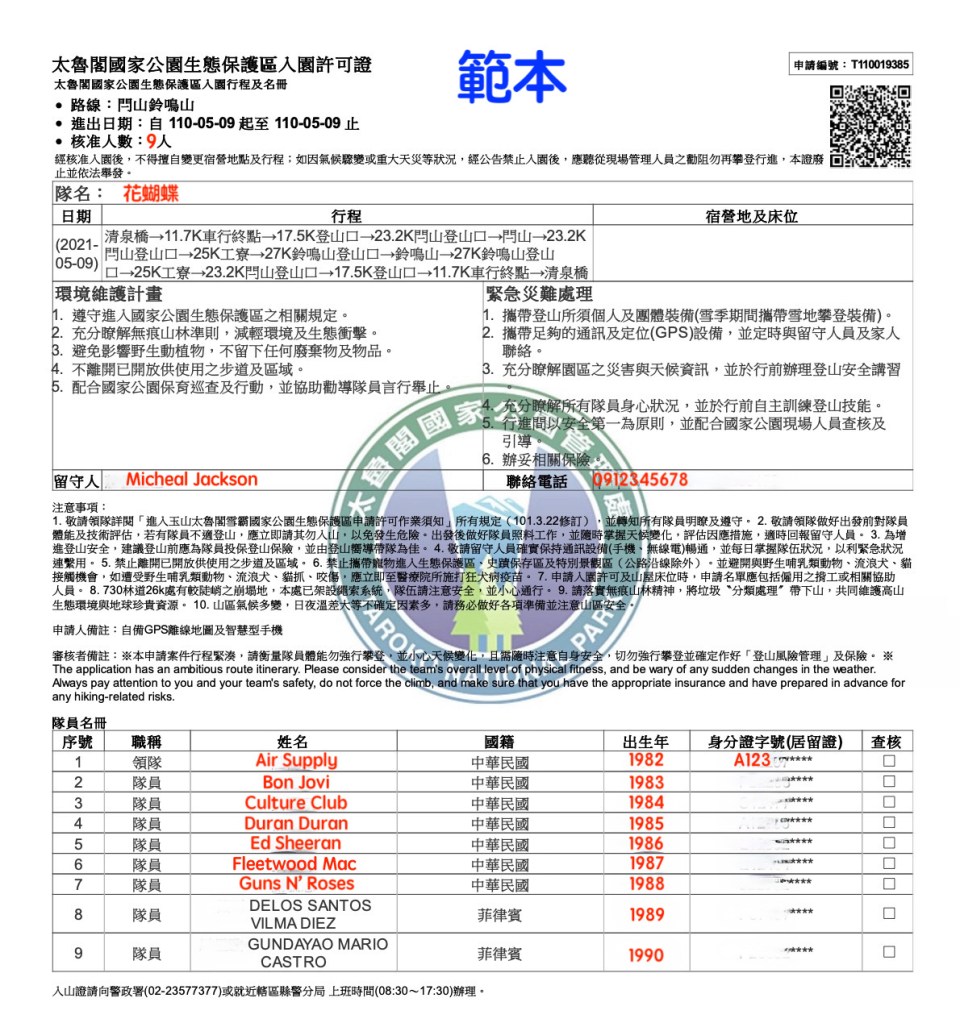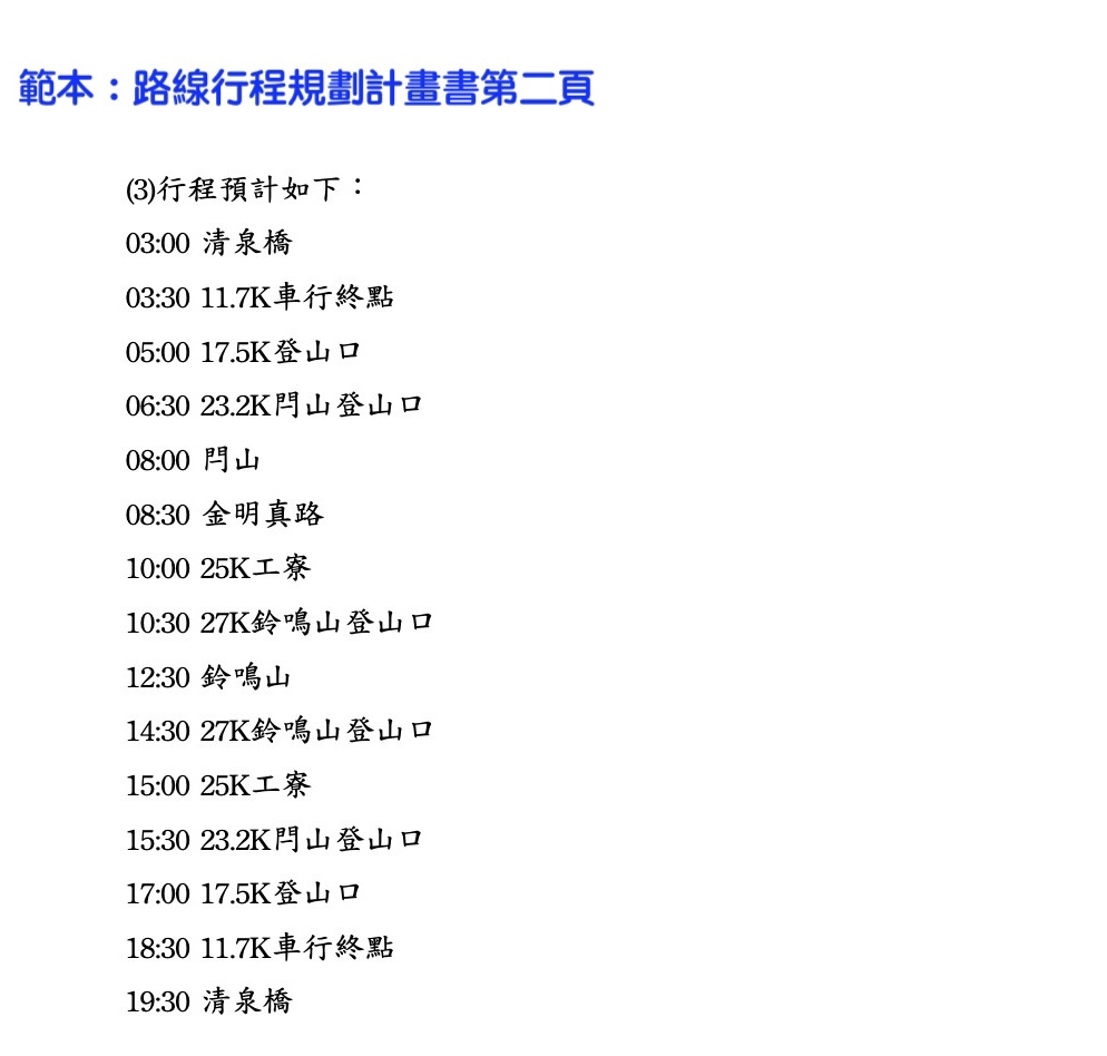 要單攻閂山鈴鳴山,必須要事先向太魯閣國家公園申請入園許可證,單攻是非常消耗體力的行程,因此申請過程中要附上路線行程規劃計畫書。範本如下: