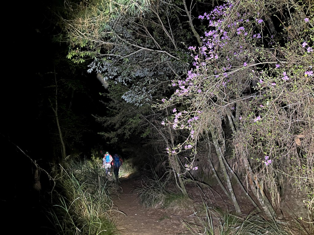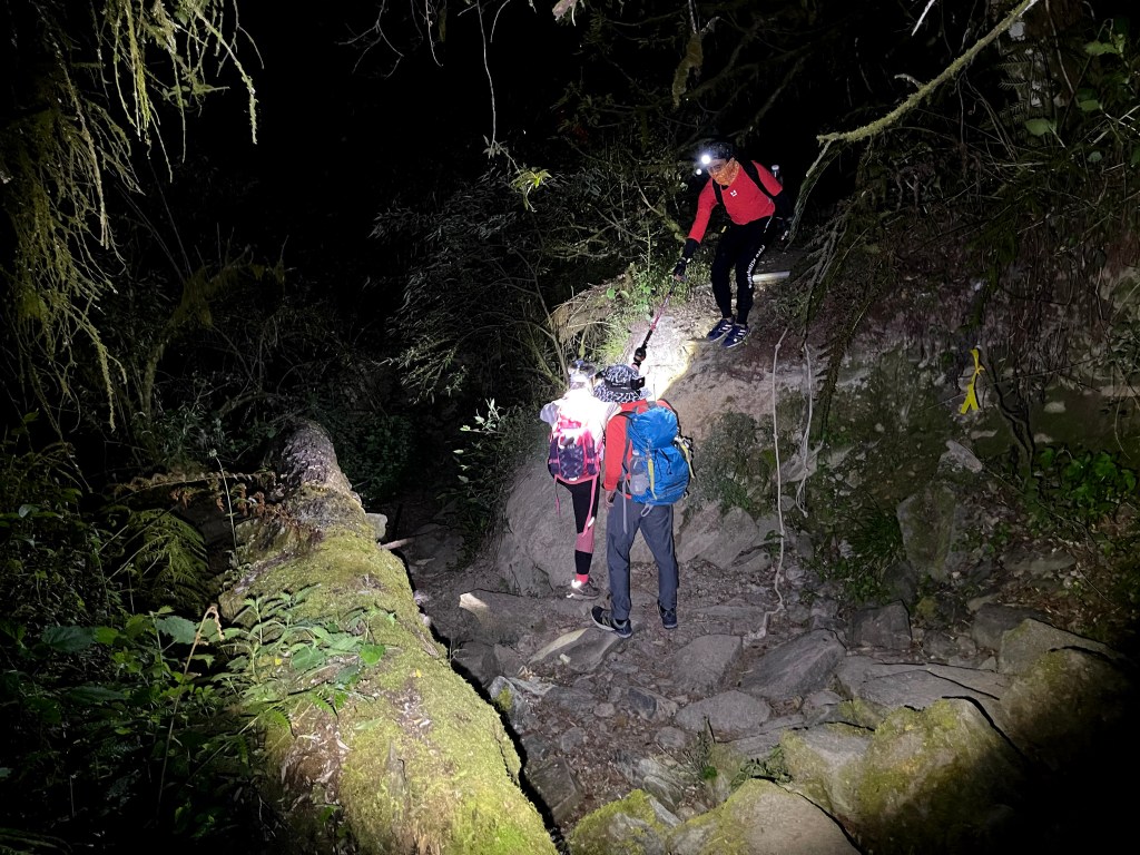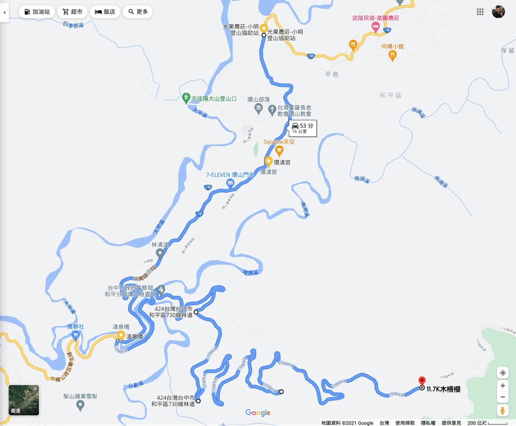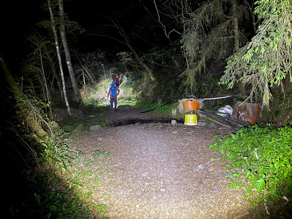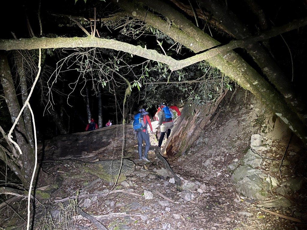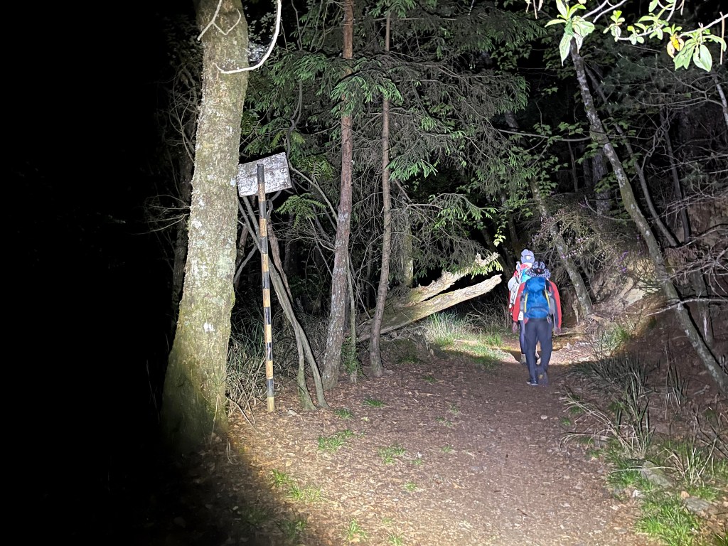 今天我們要進行的行程,在前一天就先到光果農莊–小明登山協助站進行休息。到了清晨1點搭上王小明接駁車,由台7甲線59.5K經過環山部落,過了清泉橋(台7甲線65K)後左轉,立即進入730林道,接下來就像是雲霄飛車似的搖晃11.7K的林道,要由海拔約1,500m直上到海拔2,300m的11.7K木柵欄。