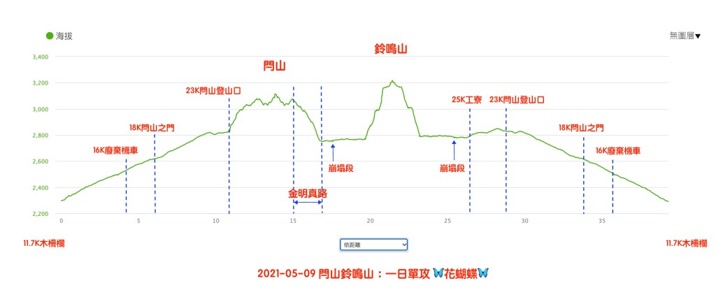 上圖:橫軸為距離,縱軸為海拔高度。由Garmin Fenix 6x所記錄。