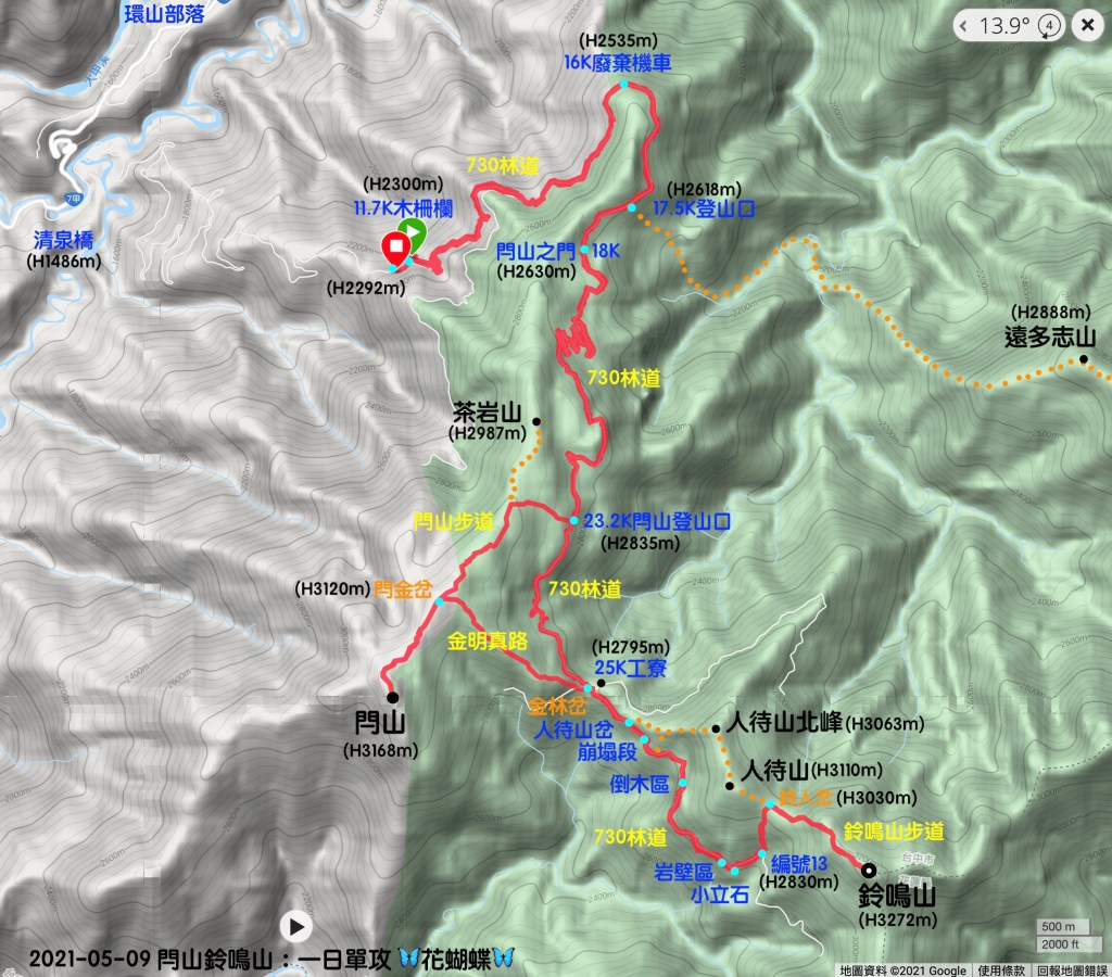 紅色路線就是今天徒步的路徑,可參考下方的路徑移動影片。橘色細線是其他山徑,包含在730林道17.5K登山口可往遠多志山而到甘薯峰或無明山;另有一條在閂山步道上可往茶岩山;還有一條可從鈴人岔經人待山走到人待山岔。而從清泉橋到11.7K木柵欄這段細白路徑為730林道,路況極差、會車不易且迴轉有困難,強烈建議改以當地(王小明)接駁車來接駁。