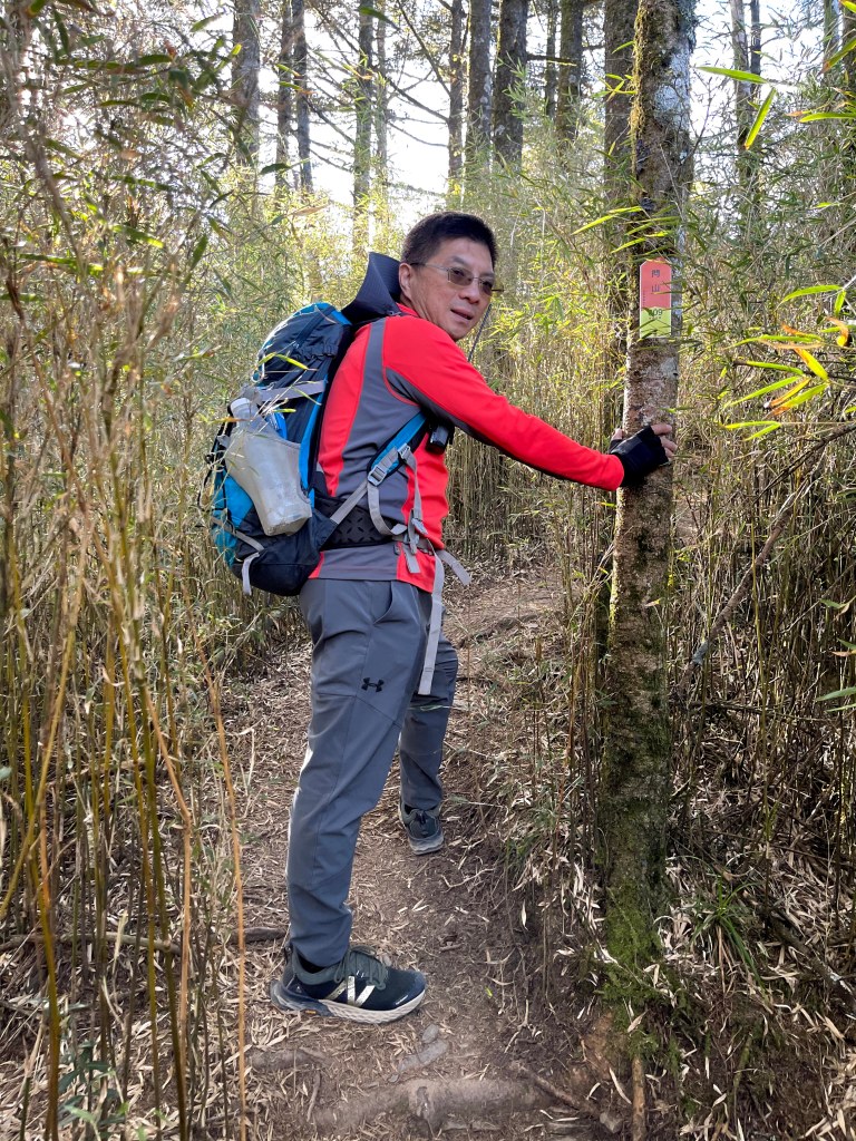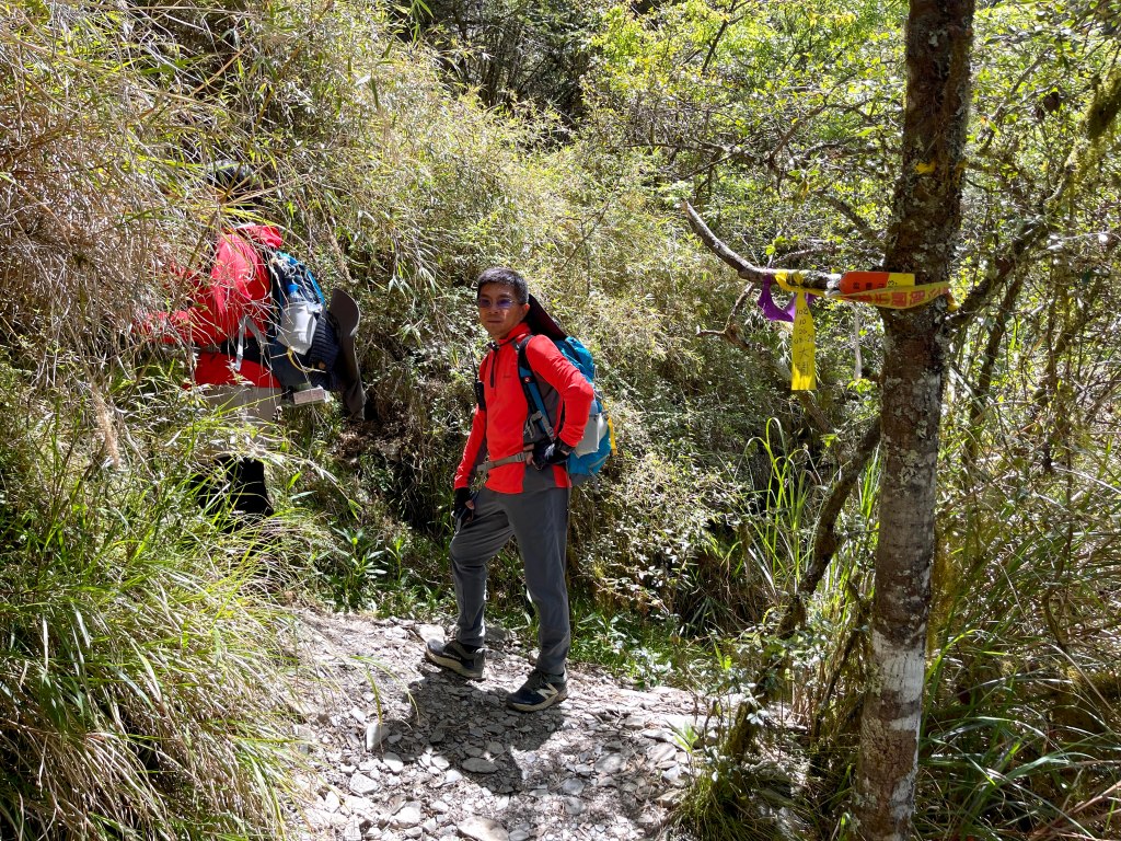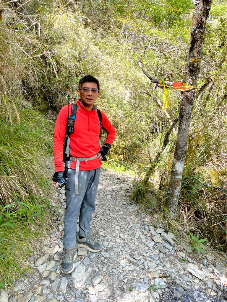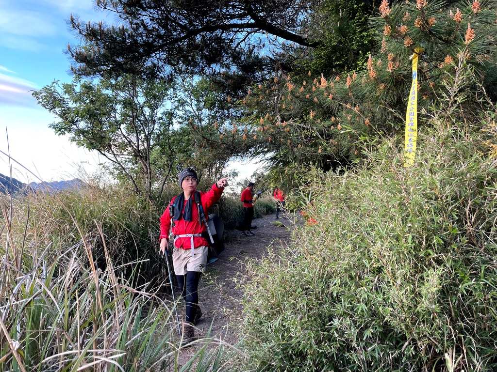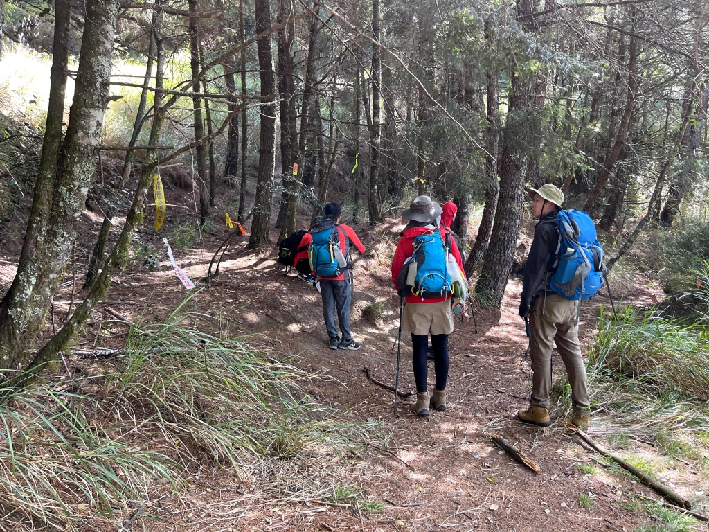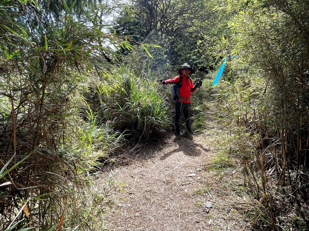 上圖:David手指的登山布條方向,就是23.2K的閂山登山口。我們在過了23.2K的閂山登山口後的小腹地稍微休息一下。