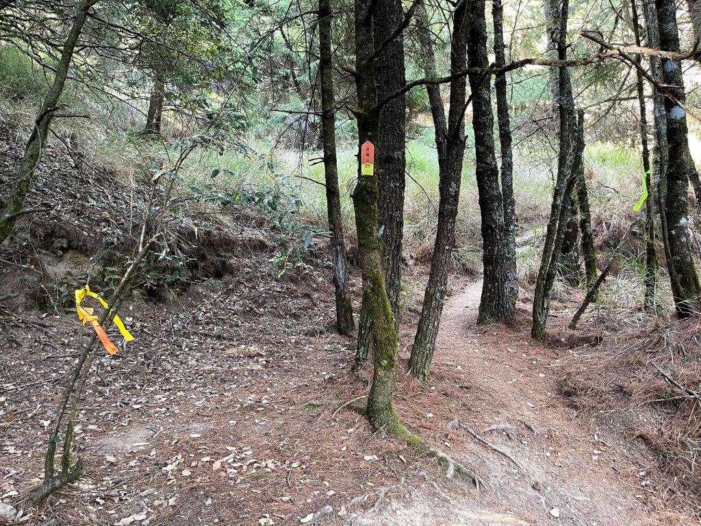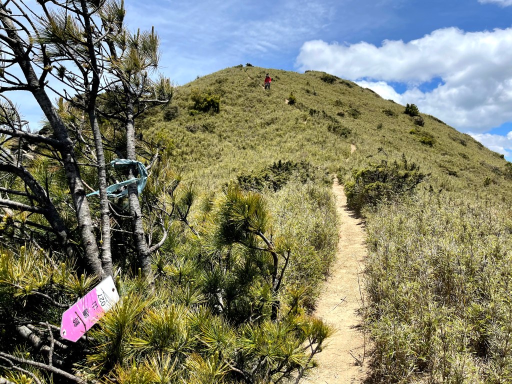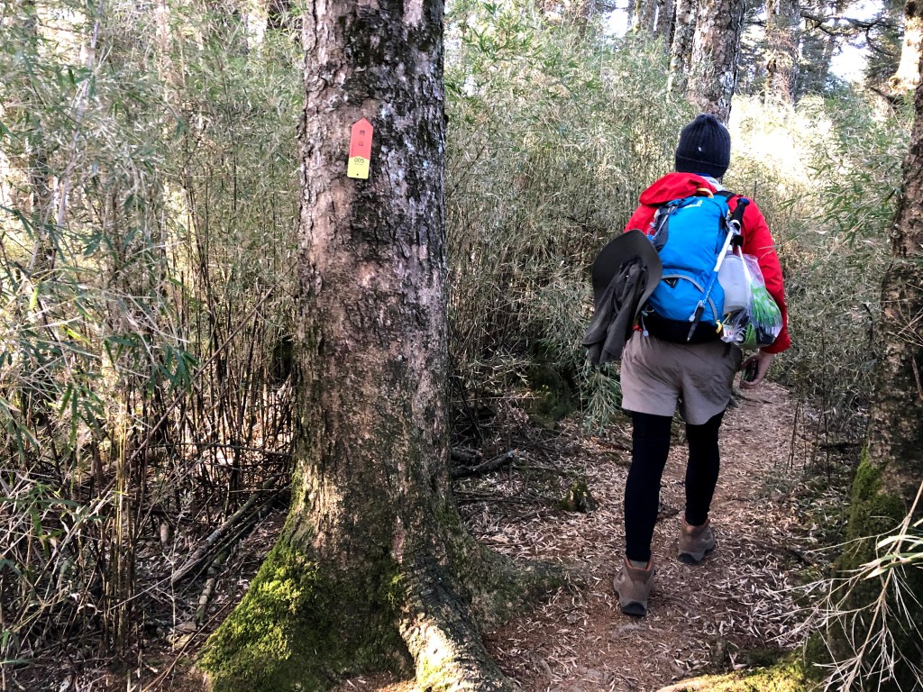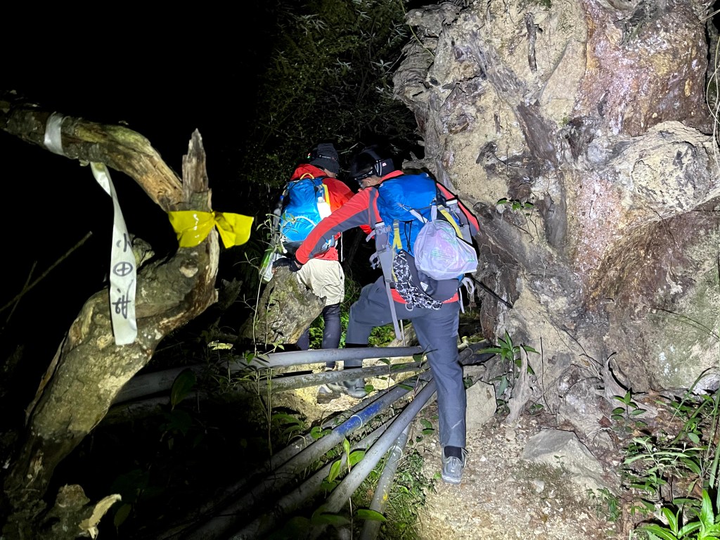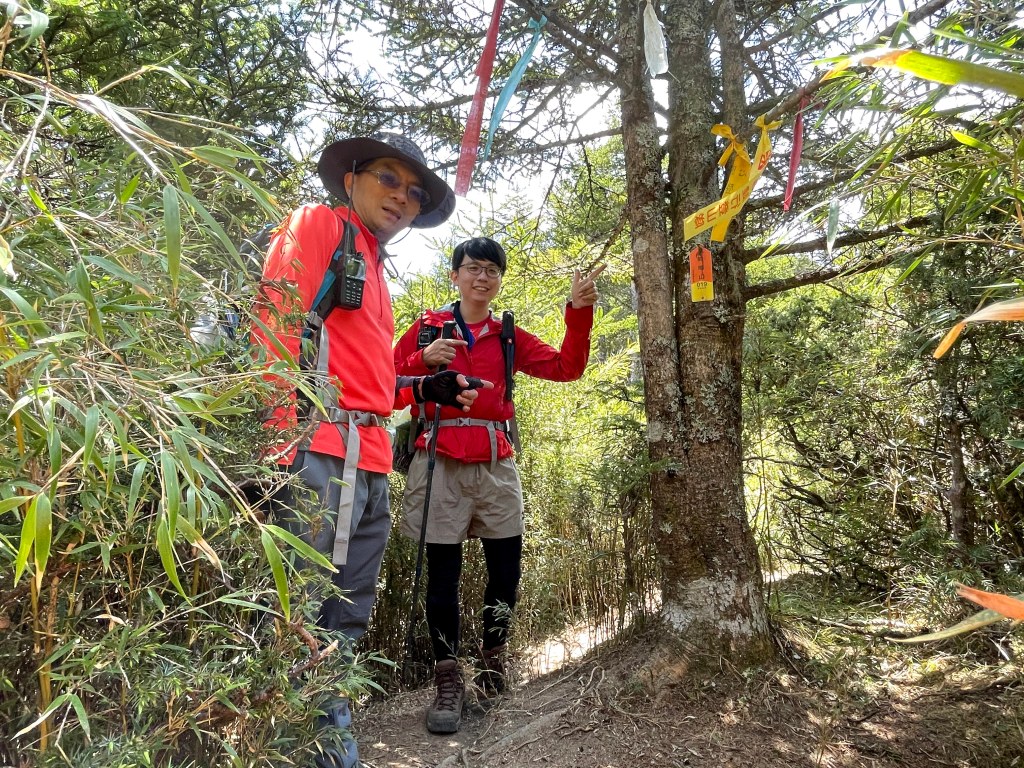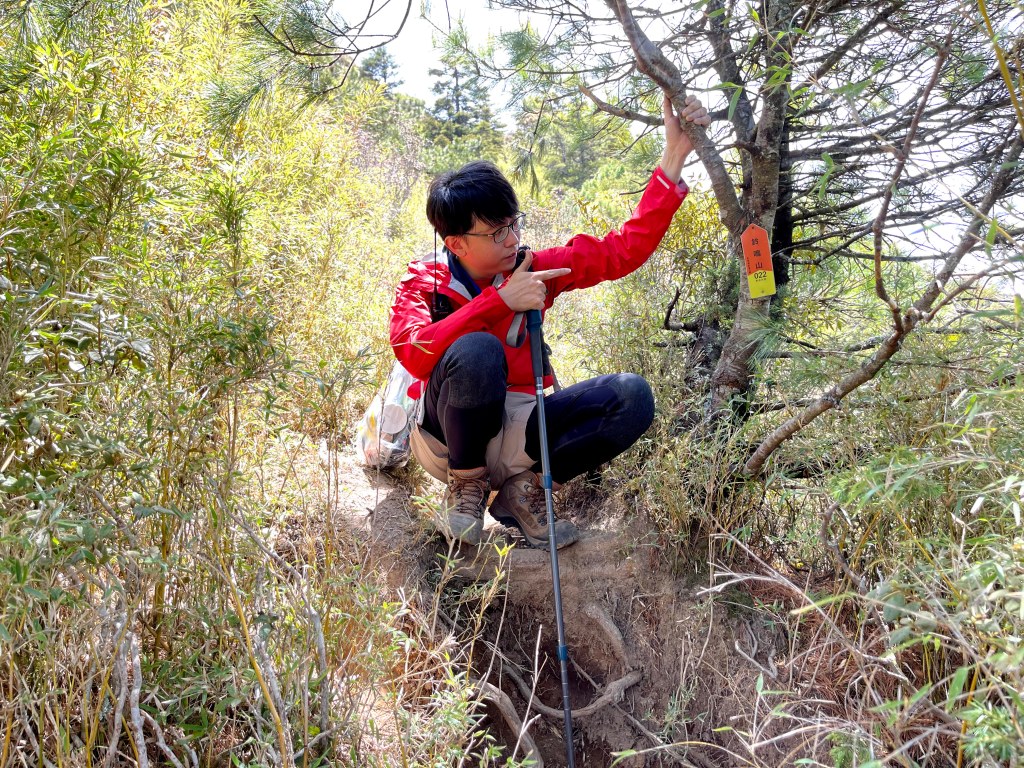 上圖:David手指的登山布條方向,就是23.2K的閂山登山口。我們在過了23.2K的閂山登山口後的小腹地稍微休息一下。