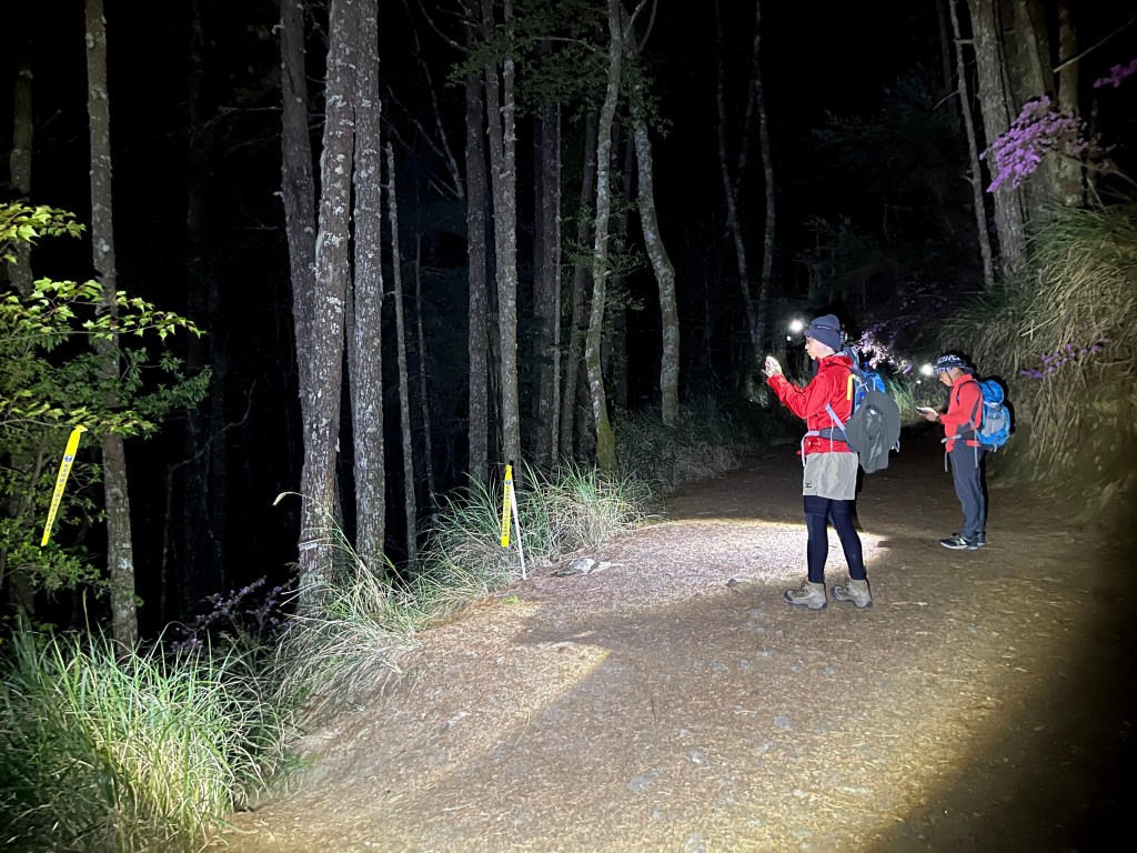 完稿後,才由山友黃文林提供訊息得知,原來「金明真路」是由周業鎮前輩所維護,其中金與真兩字合併就是鎮字,金明真路是日據時代的舊有伐木林道,周業鎮前輩進行了維護後,讓山友們可以節省不少的時間。這些登山前輩的故事既溫馨也說不完,朋友們可以參考一下新聞:87天完登百岳.4歐吉桑創極限紀錄
