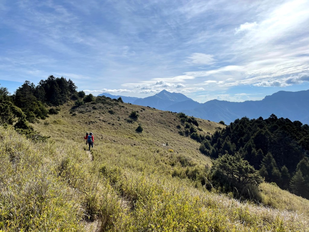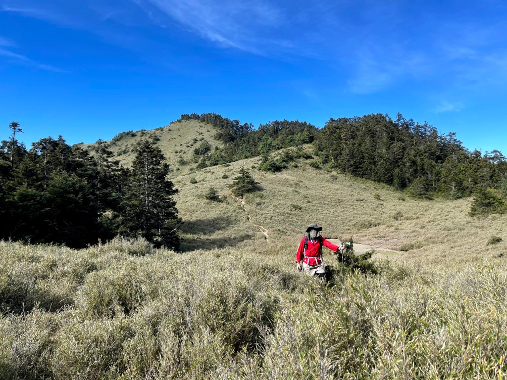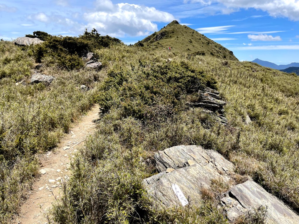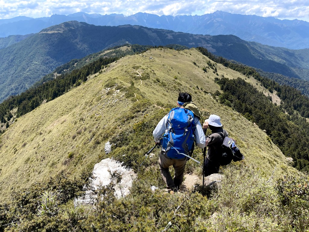 在730林道23.2K處稍微休息後,就由登山口直接往右陡上,約3K的距離要陡上330m的高度,是今天需要持續陡上的兩段路徑中的一段。一路上會看到閂山路牌由(閂山001)直到抵達閂山三角點的(閂山010)。這段路徑上除了美美的草原區,左側持續看得到的北一段與北二段,偶爾右側也會出現聖稜線與武陵四秀,但印象最深刻的就是持續不斷的箭竹林,會一直刷洗你的臉。還好,這幾天沒有下雨,只有刷沒有洗。抵達閂山後發現它的展望只有180度左右,也就是北一段與北二段的大景,也可看到下一個目標–遠遠的鈴鳴山。大伙在此拍照也休息了近一小時後離開。