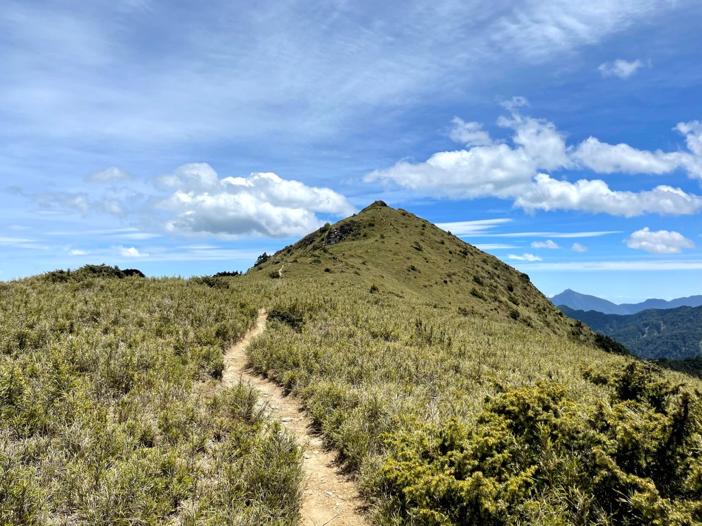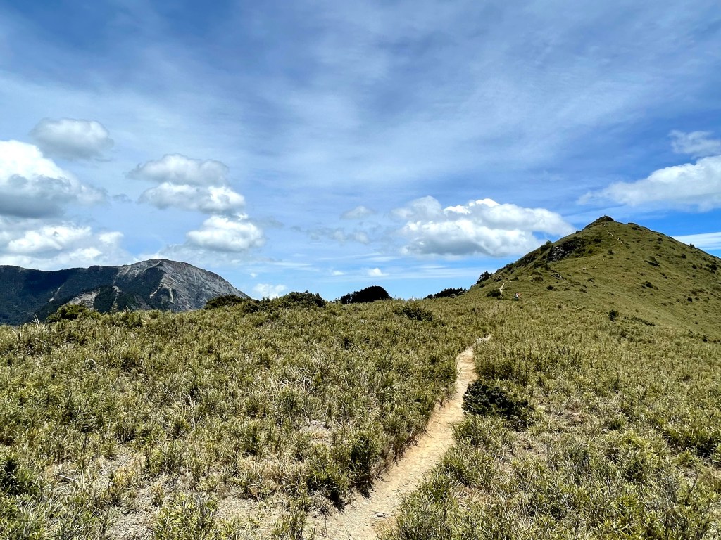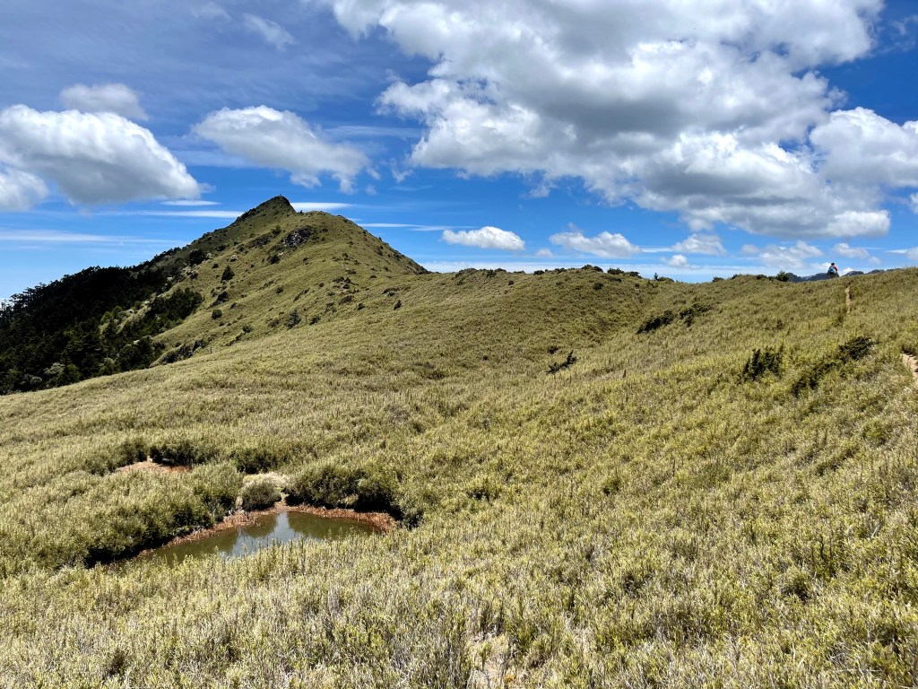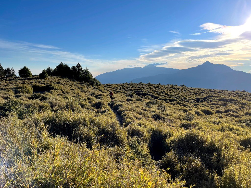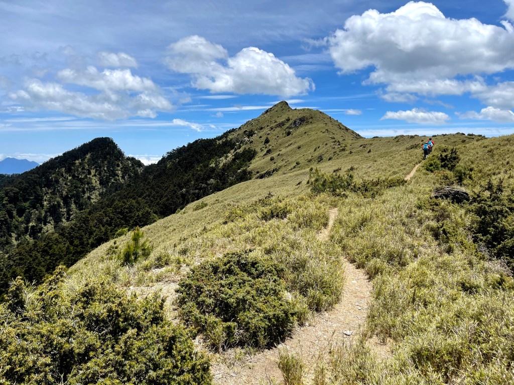 在730林道23.2K處稍微休息後,就由登山口直接往右陡上,約3K的距離要陡上330m的高度,是今天需要持續陡上的兩段路徑中的一段。一路上會看到閂山路牌由(閂山001)直到抵達閂山三角點的(閂山010)。這段路徑上除了美美的草原區,左側持續看得到的北一段與北二段,偶爾右側也會出現聖稜線與武陵四秀,但印象最深刻的就是持續不斷的箭竹林,會一直刷洗你的臉。還好,這幾天沒有下雨,只有刷沒有洗。抵達閂山後發現它的展望只有180度左右,也就是北一段與北二段的大景,也可看到下一個目標–遠遠的鈴鳴山。大伙在此拍照也休息了近一小時後離開。