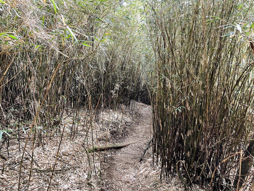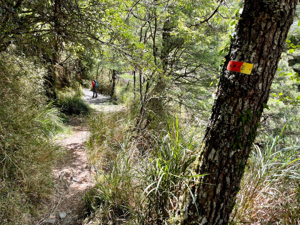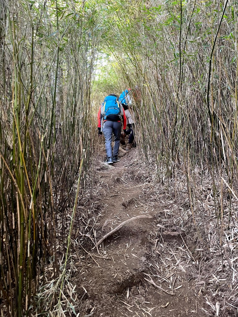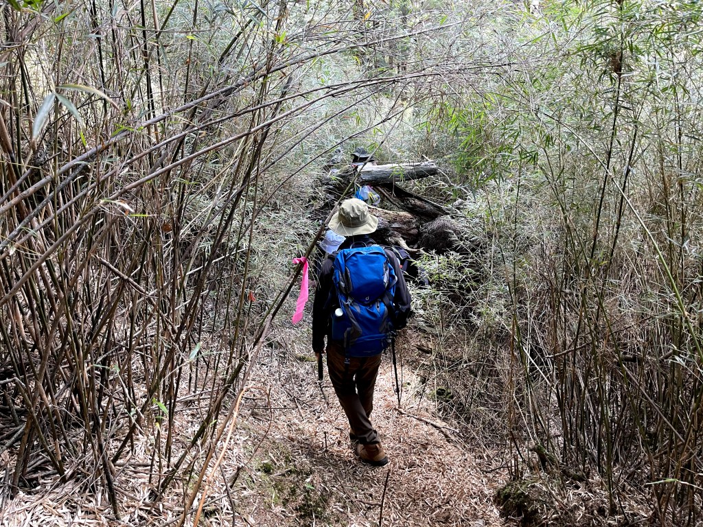 在25K工寮處大伙休息一下,就繼續由730林道往鈴鳴山走,由此開始的730林道與前段略有不同,雖然海拔起伏仍然不大,但是路徑就有比較多的岩石、倒木、芒草、箭竹林還有路徑旁大朵的咬人貓相互交雜。路程會經過人待山岔,若由此高繞上人待山而走鈴鳴山,可以避開約在26K的崩塌段,但我們採過26K的崩塌段,如此時間上可以縮短一些,但是讀者朋友們若走此行程,在此崩塌段就謹慎拉繩慢慢而行即可。此段路徑沿路會有鈴鳴山編號路牌,由(鈴鳴山002)一直到攻頂的(鈴鳴山030)。