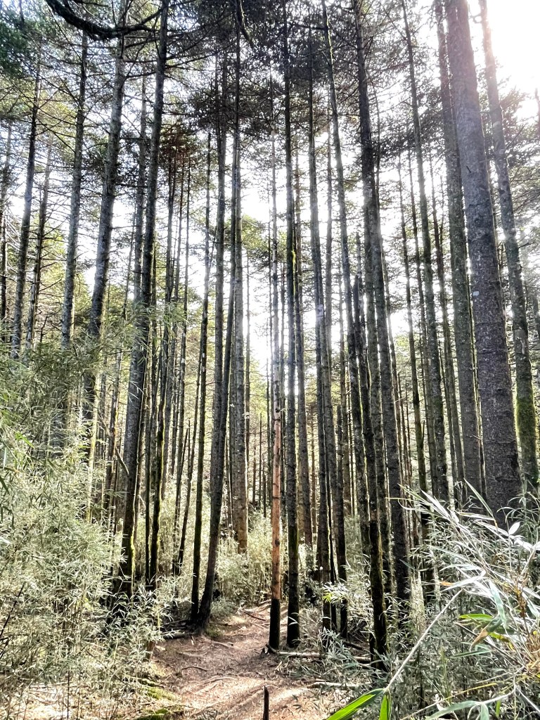 脫離了天旋地轉的林道洗禮後,看著接駁車緩緩離開,也就是我們今天行程的開始,此時是清晨2點多。要先由730林道的11.7K木柵欄走到23.2K的閂山登山口,其中會經過16K的廢棄機車,還有18K的閂山之門,快到23.2K的閂山登山口前,天色已亮,就可以看到左側的南湖大山與中央尖山,還有甘薯峰、鬼門關峰以及無明山。這段路徑要走上11.5K的距離,海拔由2,300m緩緩而上至2,835m,一路上除了少數的小坍塌及倒木外,大半都是好走的路徑。
