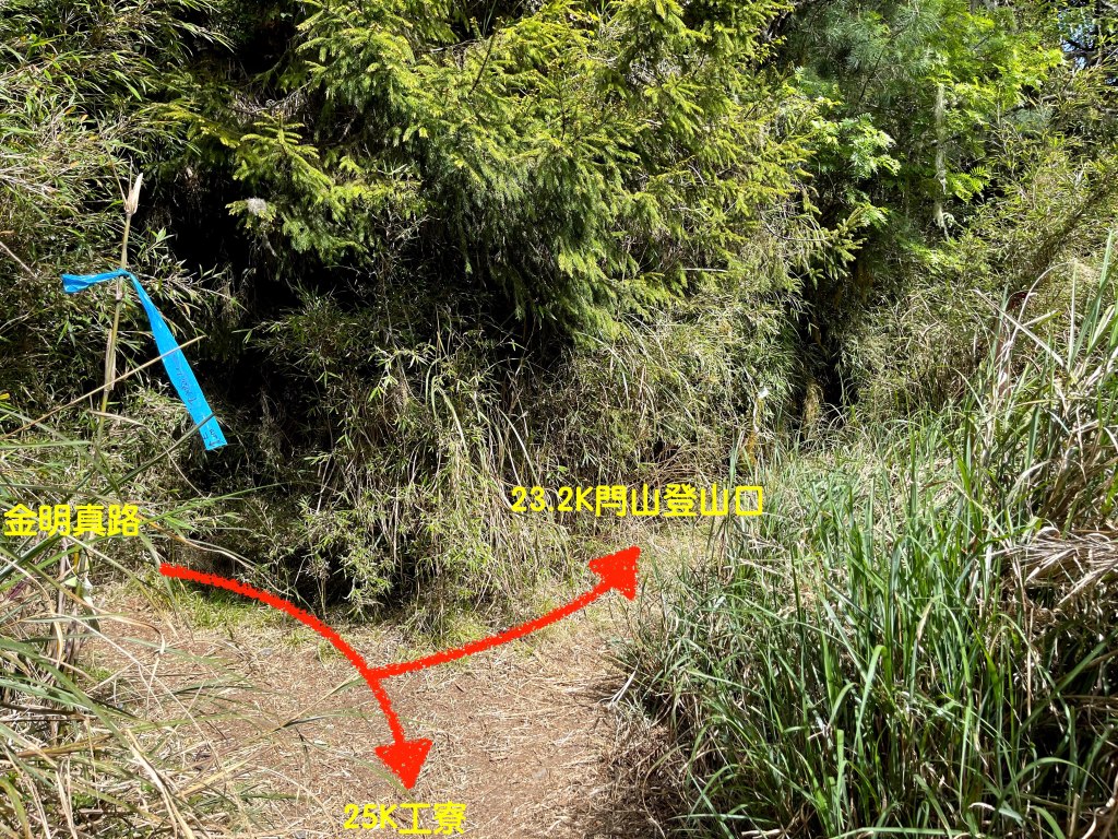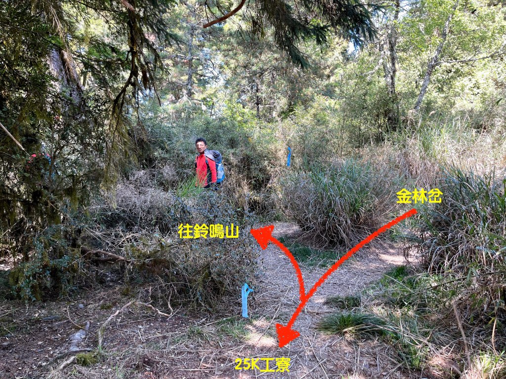 上圖:由閂山往鈴鳴山走,回程走到此閂金岔,有綠色路牌指示往右走即為金明真路,可以縮短距離到達25K工寮。