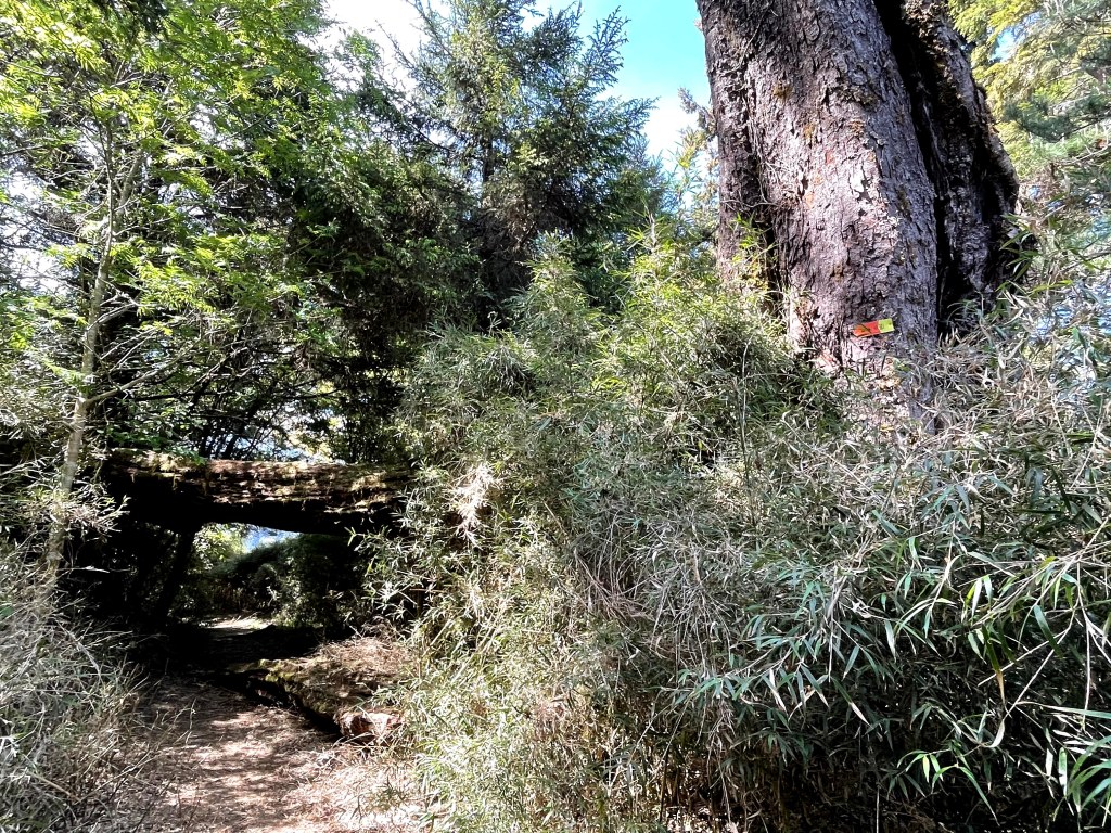 上圖:離開25工寮,出岔路一左轉就看到路牌(鈴鳴山002)指引方向,還可以看到前方的倒木,我們稱此倒木為鈴鳴山之門。