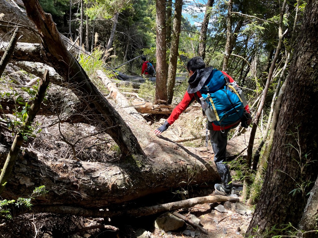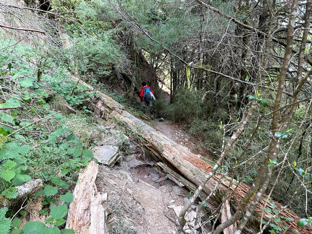 上圖:跨過倒木。