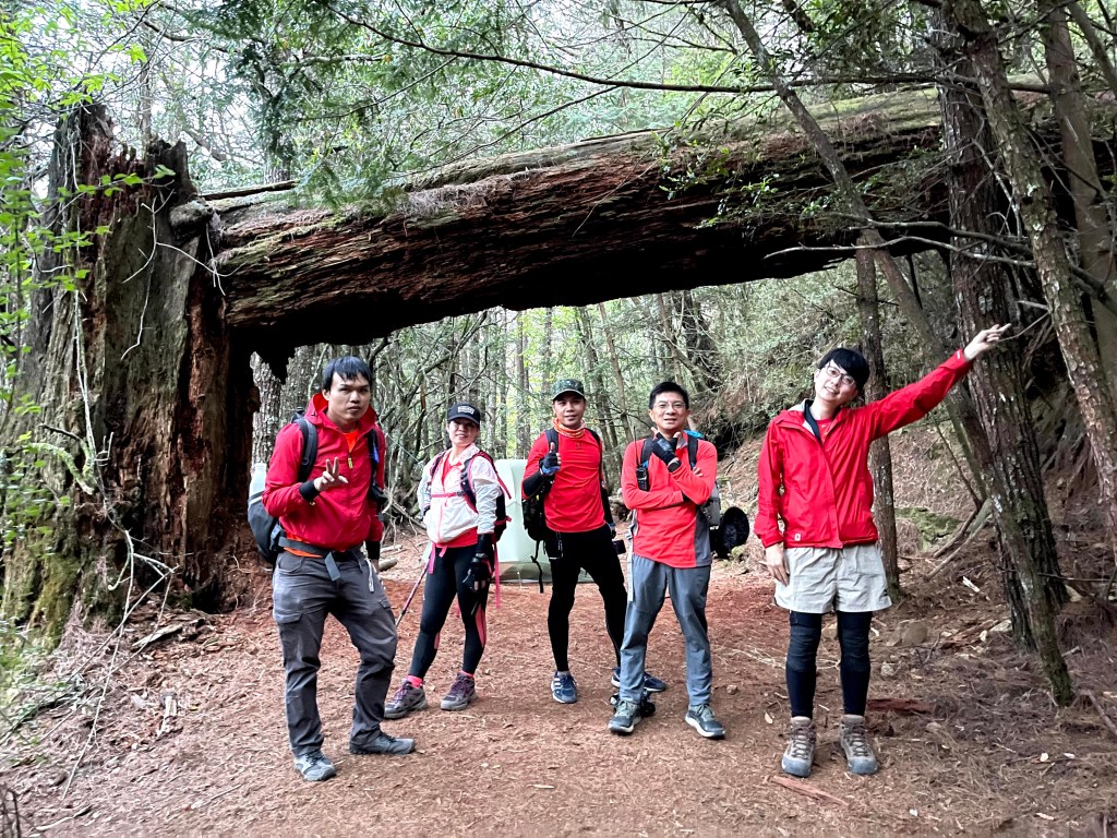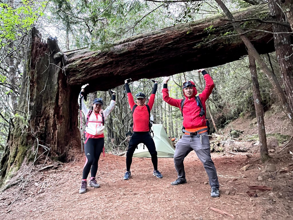 上圖:閂山之門,由730林道進入閂山、鈴鳴山的地標。由左至右:Kim、Mario及小六。此時已經有山友準備在此紮營過夜。