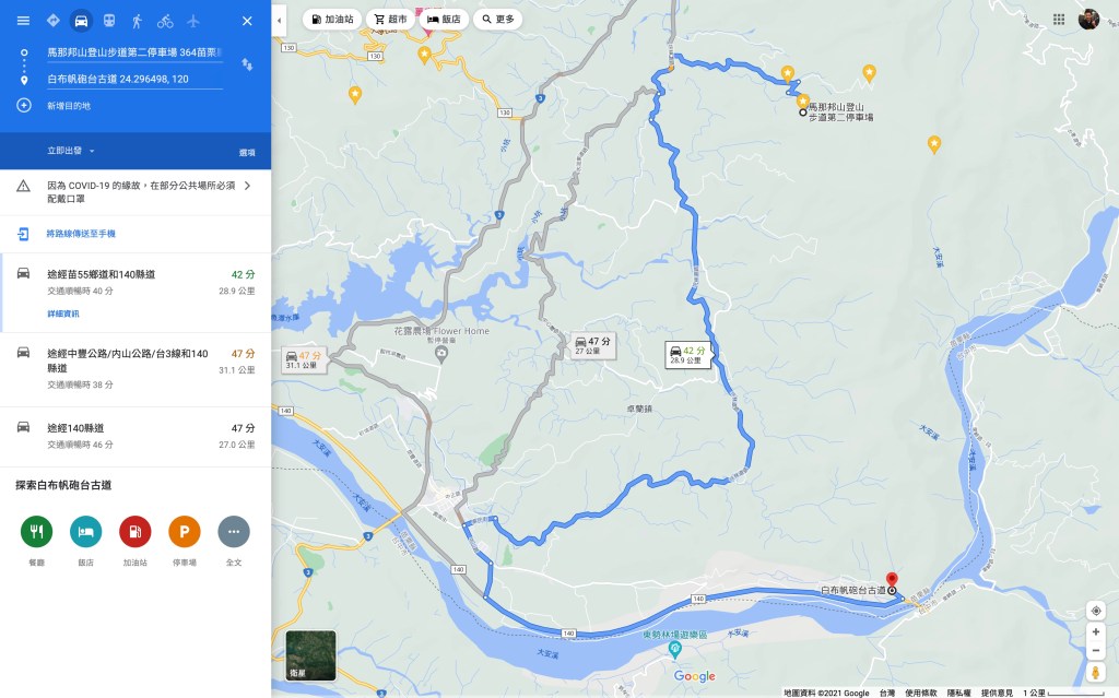 另外,當我們由馬那邦山下山走到上湖第二停車場,需要安排接駁才能回到白布帆登山口。由下圖可以得知,還需要42分鐘開將近29K的距離。接駁的部分,要請讀者朋友們事先安排妥當。我們今天的接駁,是請在登山社團內初次認識的強哥幫忙,大伙約好下午2點在馬那邦山相見,沒有想到天候不佳,起登前下雨使得我們延遲了約20分鐘,結果到了馬那邦山已經是下午3點半。