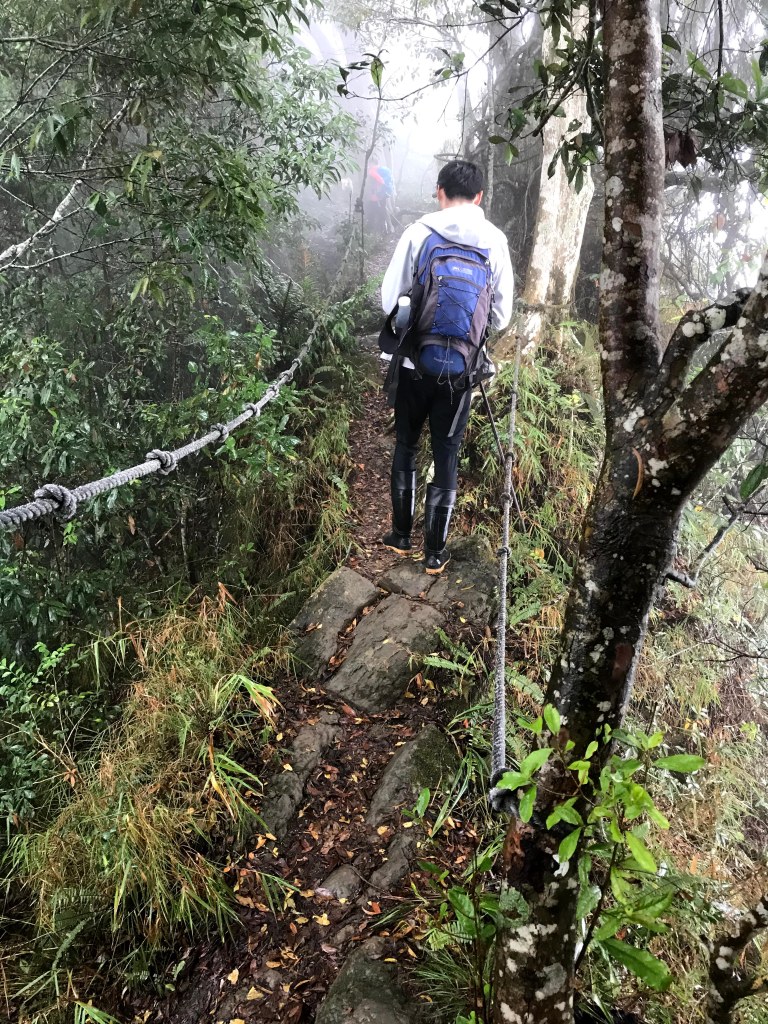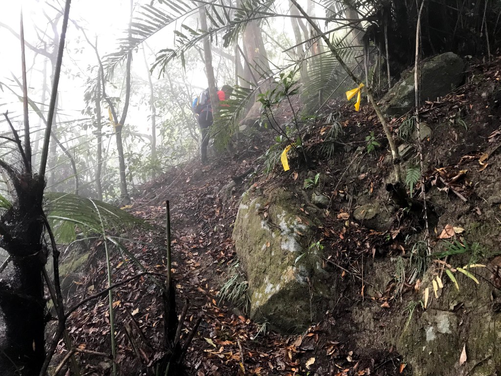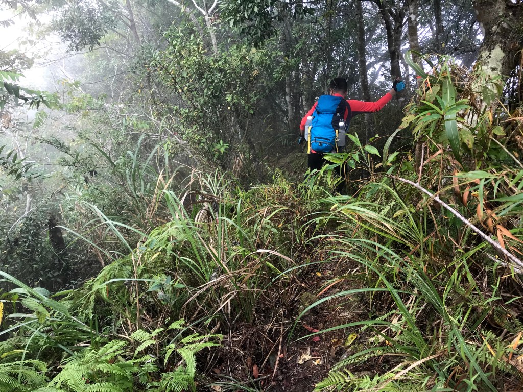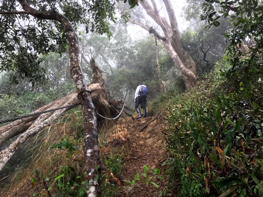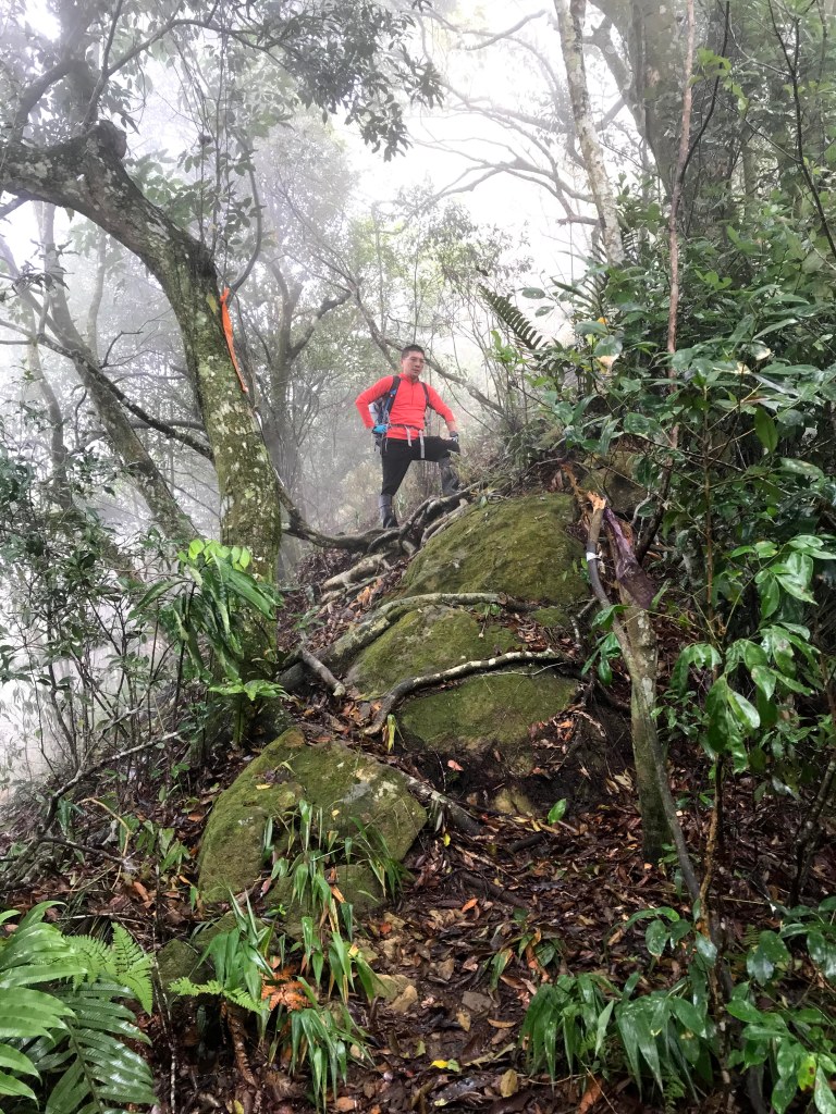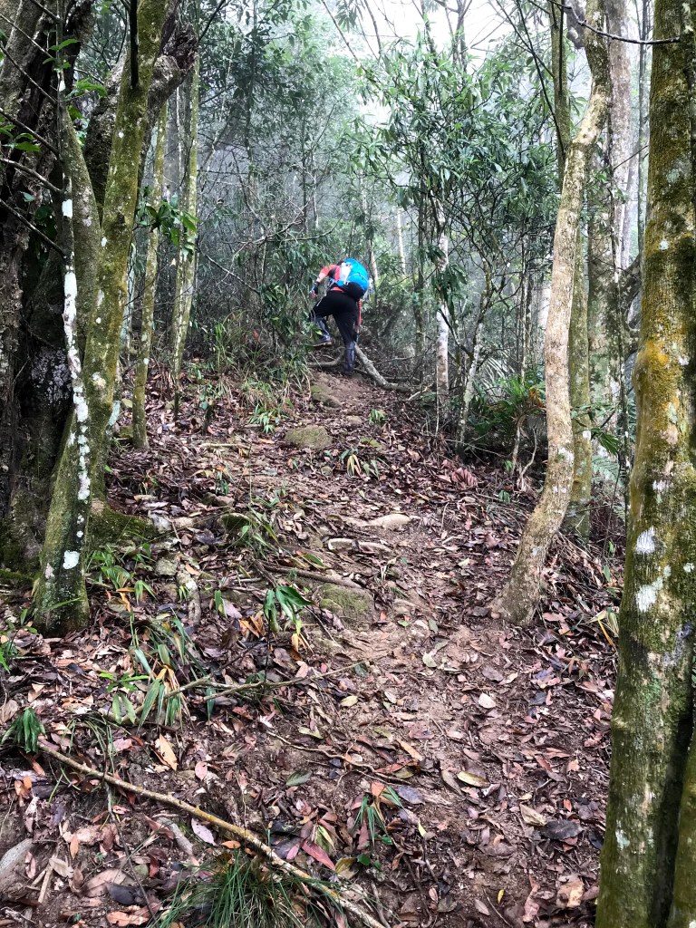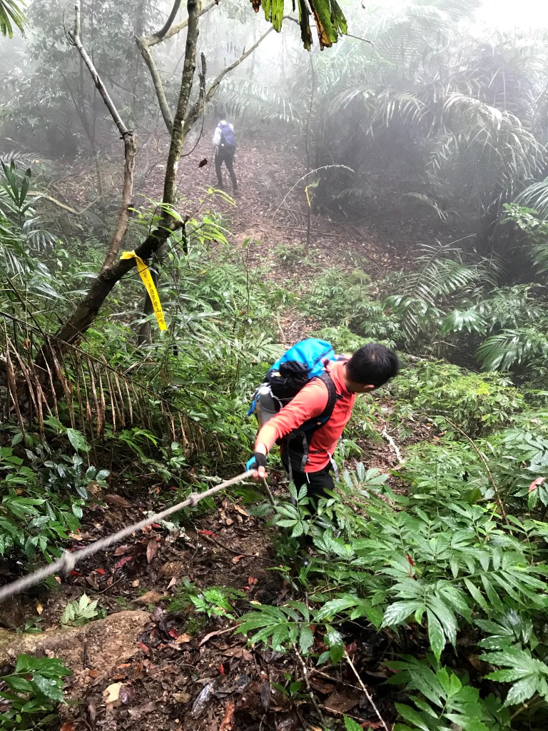 從白布帆登山口到大克山這段路程的距離有3.9K,要陡上海拔約750m,整個路徑在今天來說算是好走的一段,就是一路的逐漸陡上,剛起登前一小時其實天氣狀況很糟,一直處在雲雨之中,腦海裡不斷萌生撤退的聲音,但是隨著越來越接近大克山三角點,沒有想到居然陽光偶爾從雲層的破口射出,也讓我們更有信心完成今天的行程。