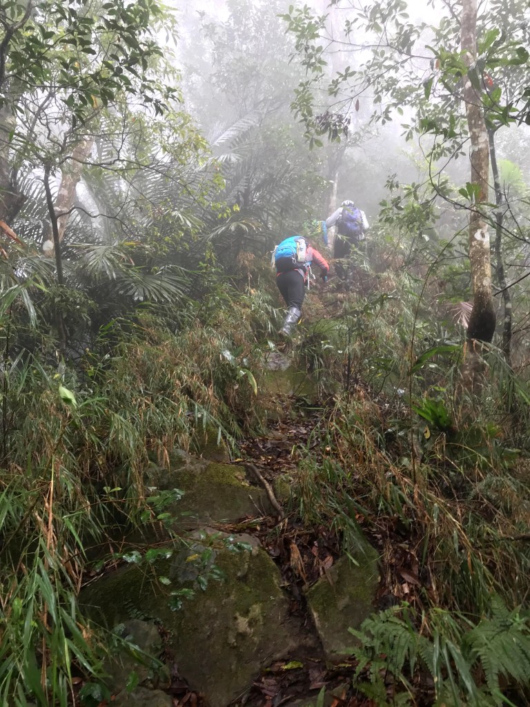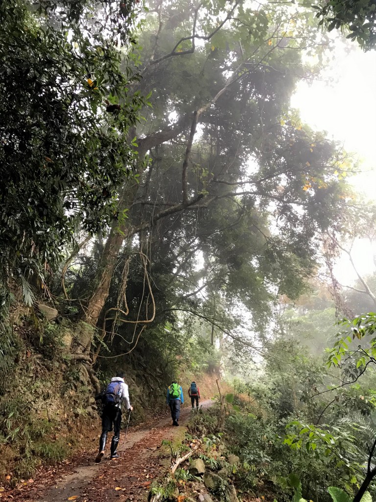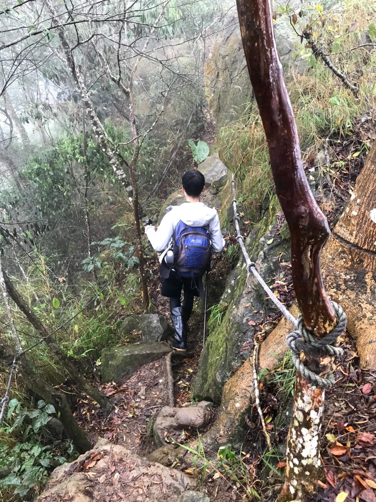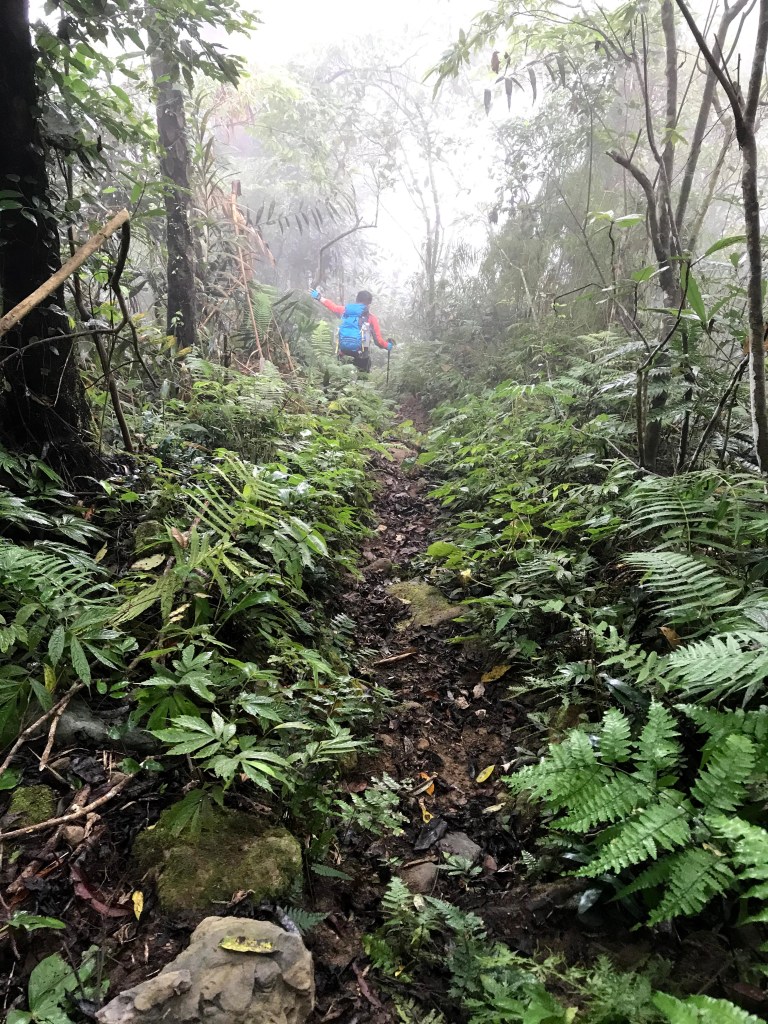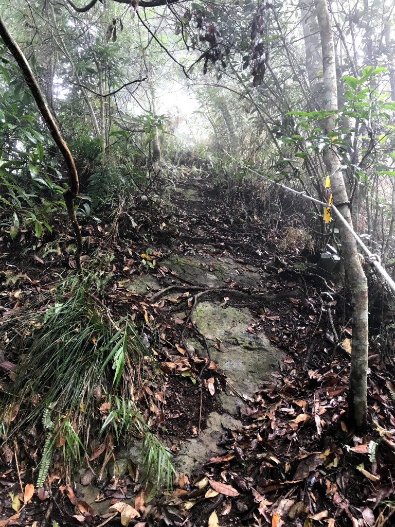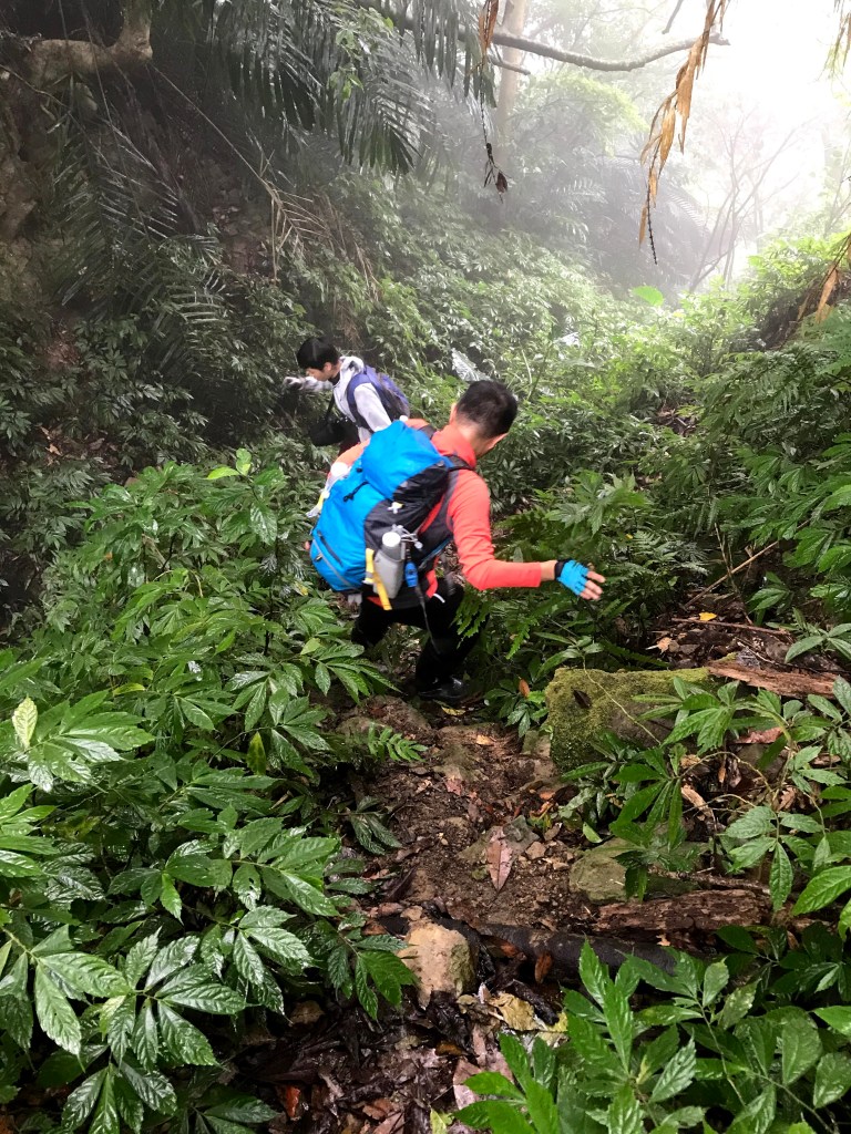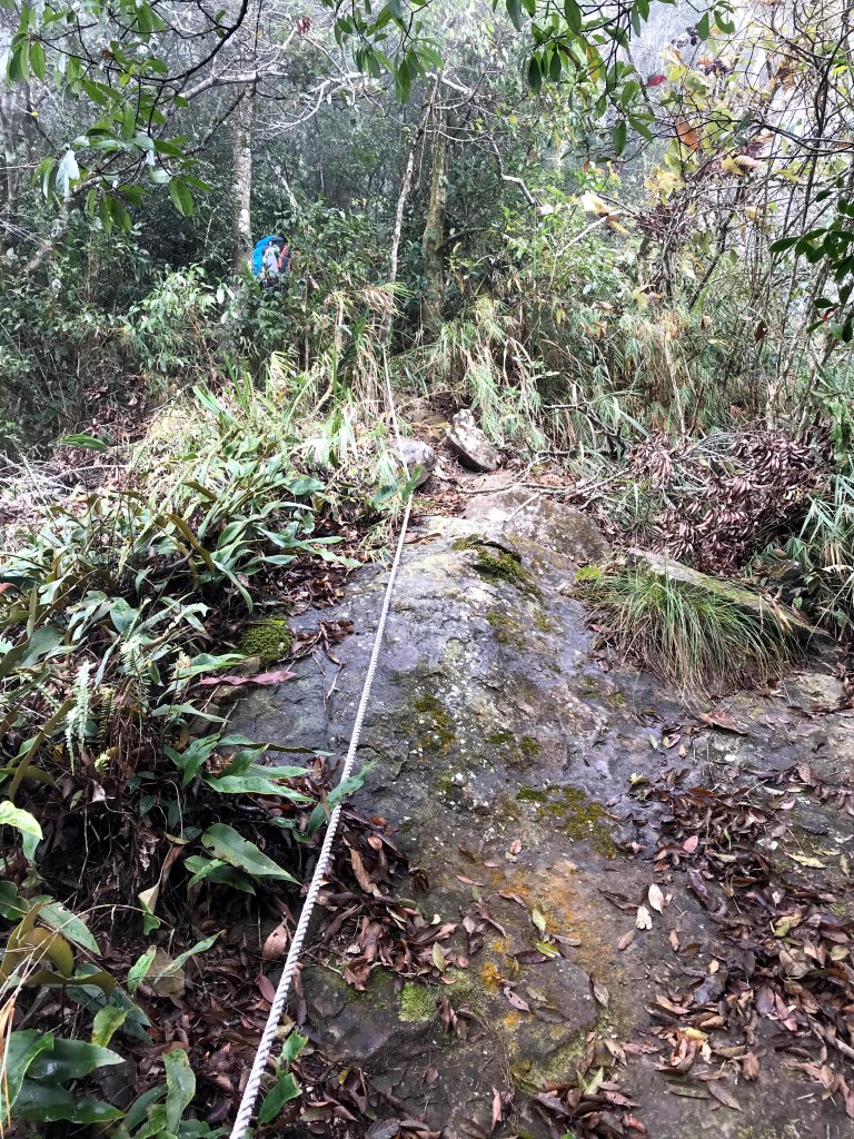 從白布帆登山口到大克山這段路程的距離有3.9K,要陡上海拔約750m,整個路徑在今天來說算是好走的一段,就是一路的逐漸陡上,剛起登前一小時其實天氣狀況很糟,一直處在雲雨之中,腦海裡不斷萌生撤退的聲音,但是隨著越來越接近大克山三角點,沒有想到居然陽光偶爾從雲層的破口射出,也讓我們更有信心完成今天的行程。