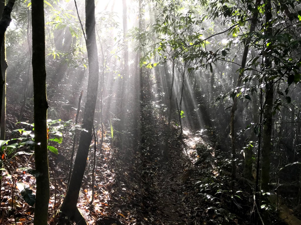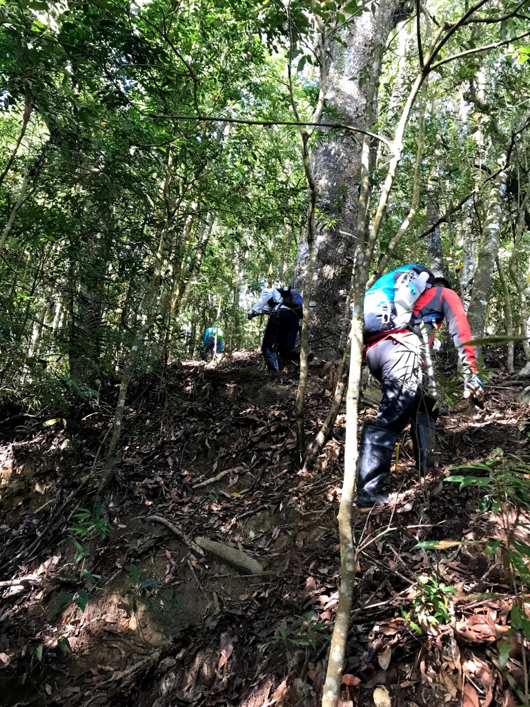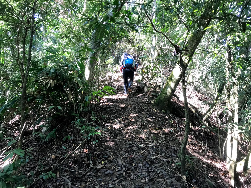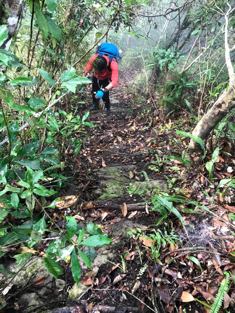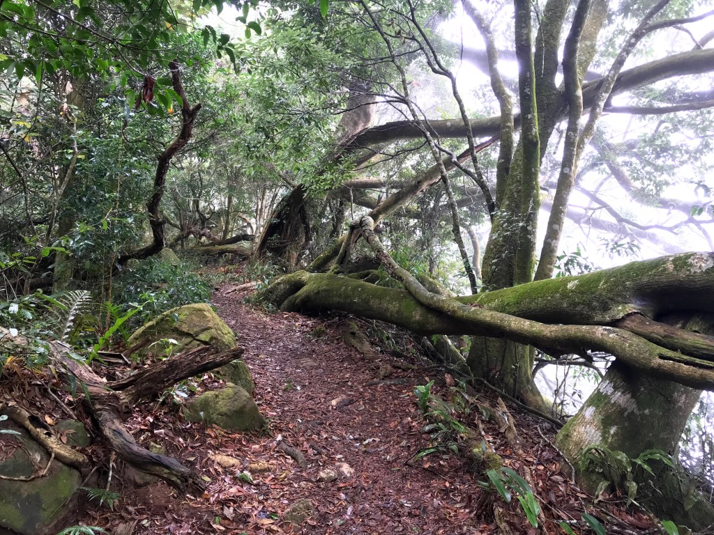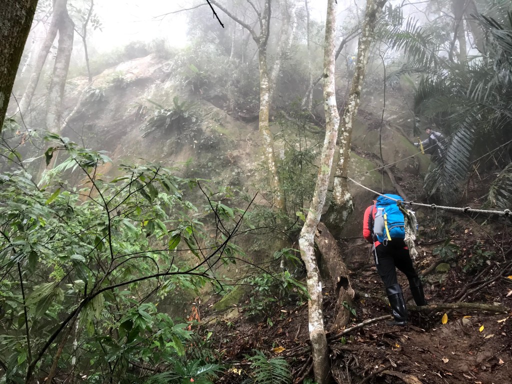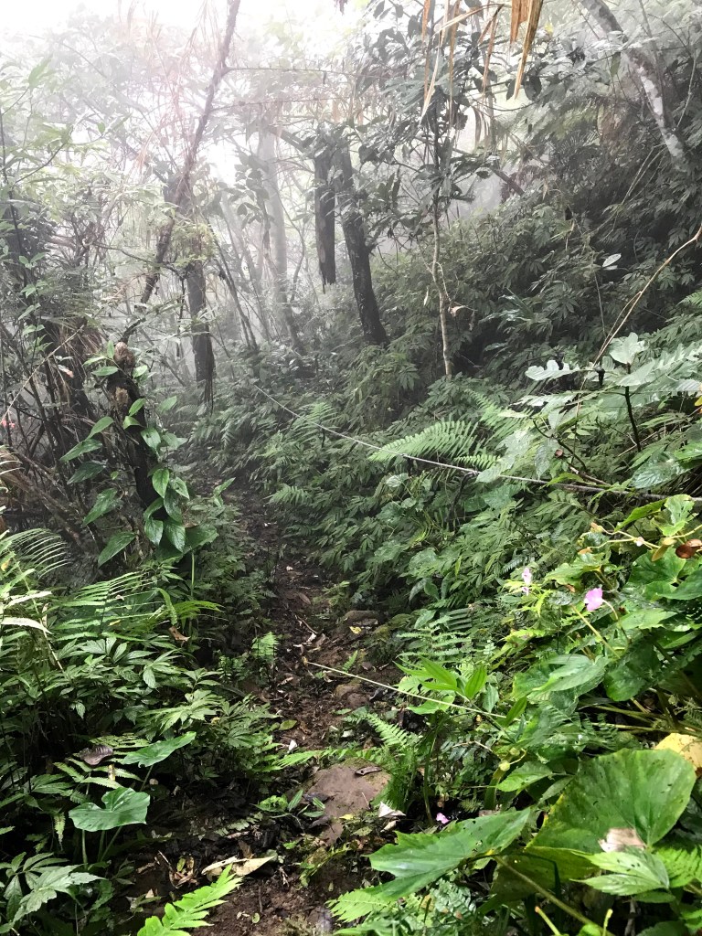 從白布帆登山口到大克山這段路程的距離有3.9K,要陡上海拔約750m,整個路徑在今天來說算是好走的一段,就是一路的逐漸陡上,剛起登前一小時其實天氣狀況很糟,一直處在雲雨之中,腦海裡不斷萌生撤退的聲音,但是隨著越來越接近大克山三角點,沒有想到居然陽光偶爾從雲層的破口射出,也讓我們更有信心完成今天的行程。