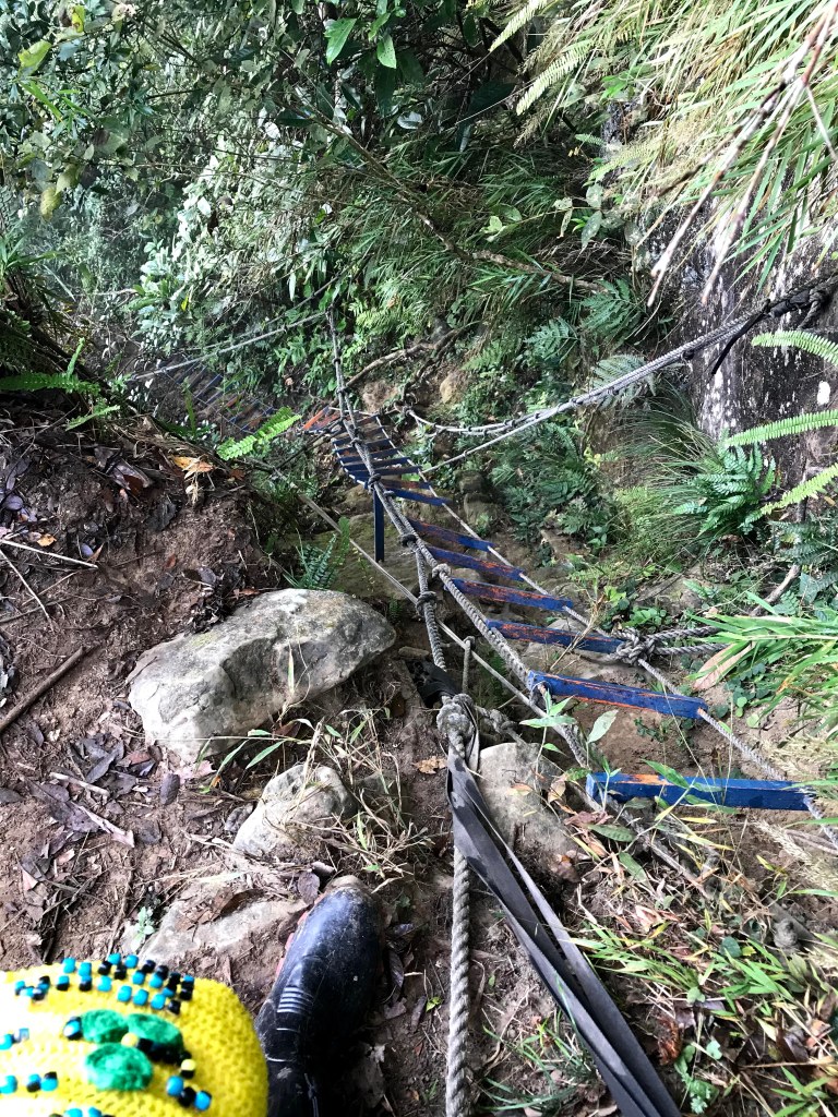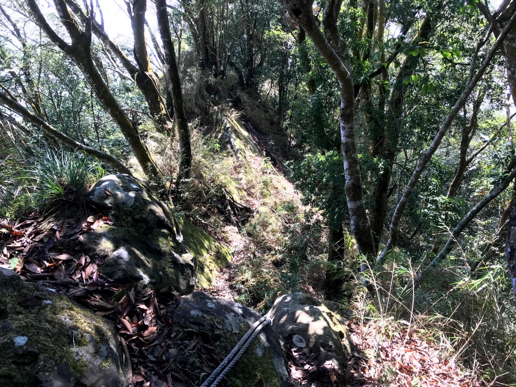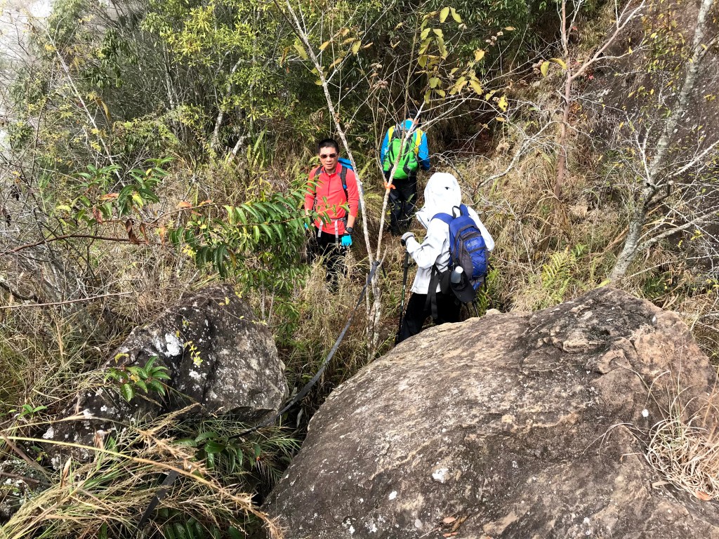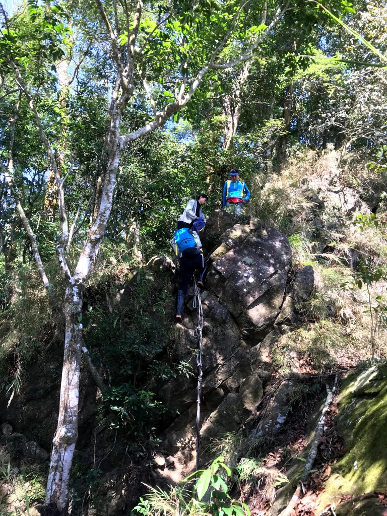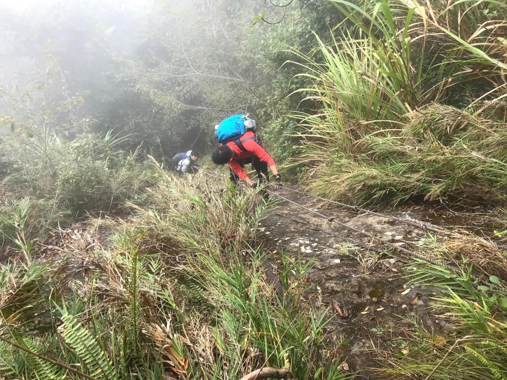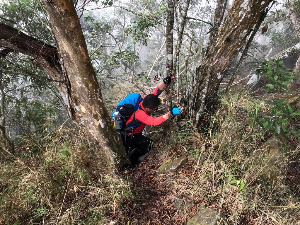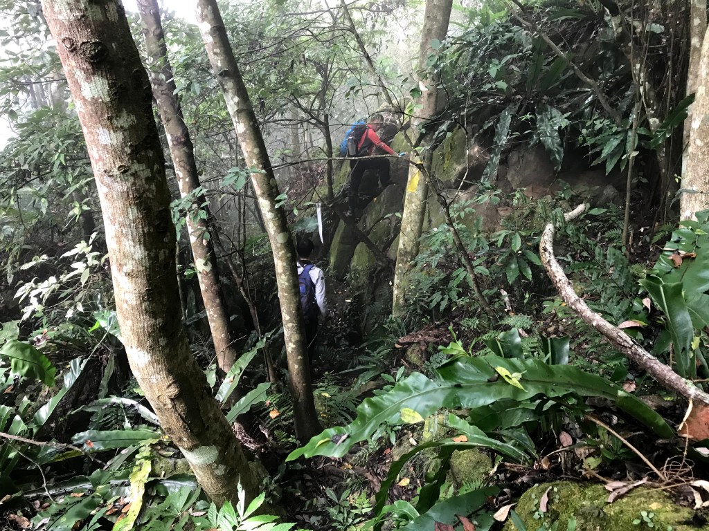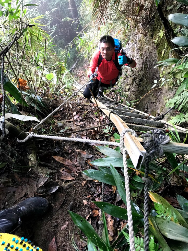 抵達大克山時,因為天色不好但偶有陽光,因此四人就在此討論了一下,要繼續前進嗎?因為接下來由大克山到司令山這一段,才是今天的挑戰!就怕天氣不好,給大伙帶來較大的濕滑風險。決定繼續走!接下來的0.5K就是陡下但是路徑狀況還好,0.5K後來到路徑右轉陡下處,開始進入斷崖式的陡下,在0.3K的距離裡會有四段的鐵梯輔助陡下,過程不好走但都架有繩索可用。從鐵梯開始的陡下,是幾近垂直狀態的斷崖路徑,此時小黃(狗)就只能在鐵梯前一直吼叫,好像是告訴我們牠也想跟著過來?太難了,只能割捨短暫的相聚,跟小黃說再見了。