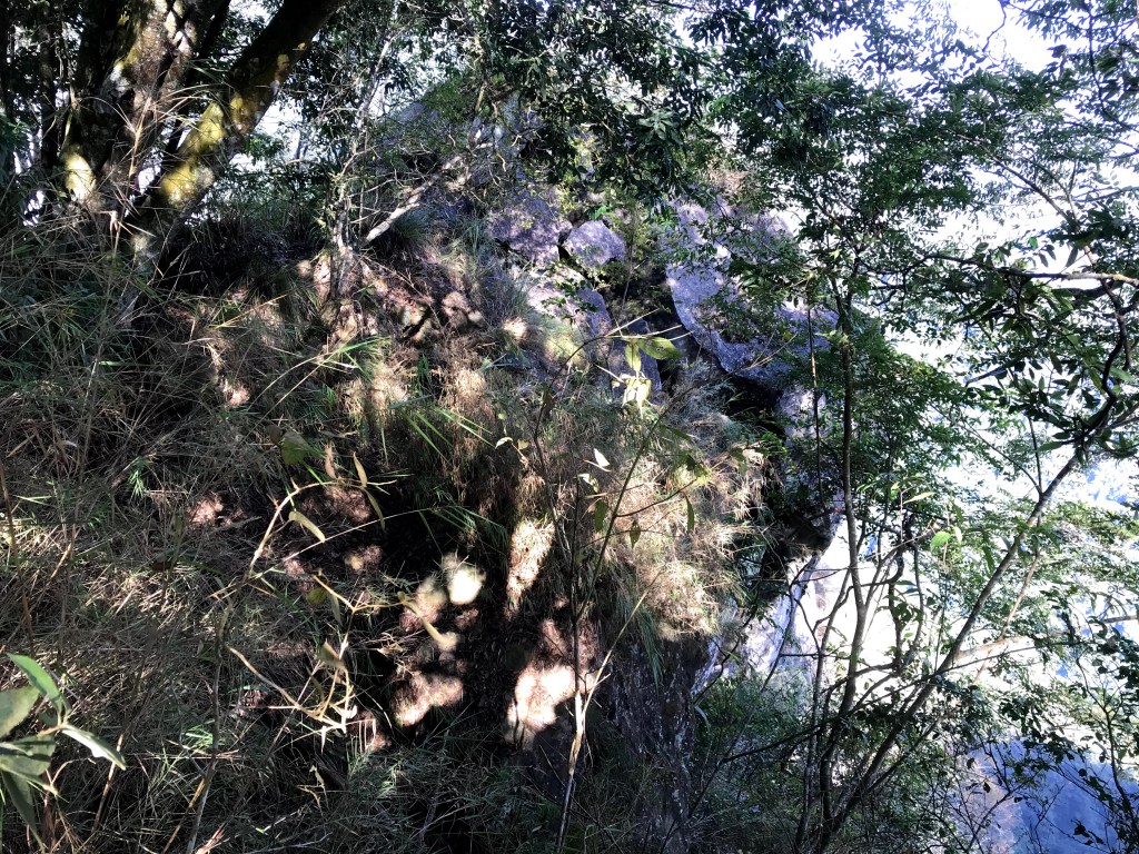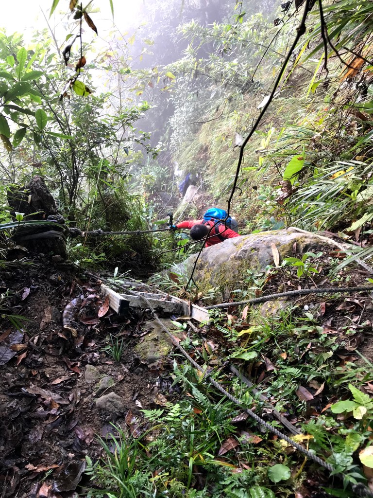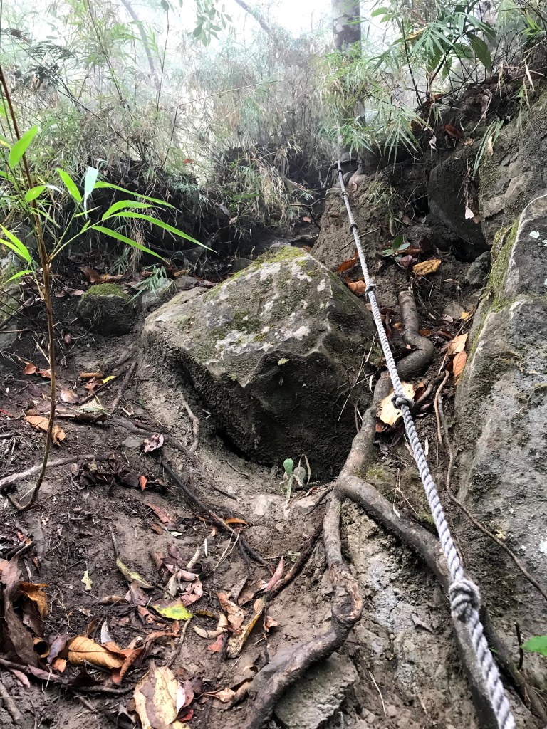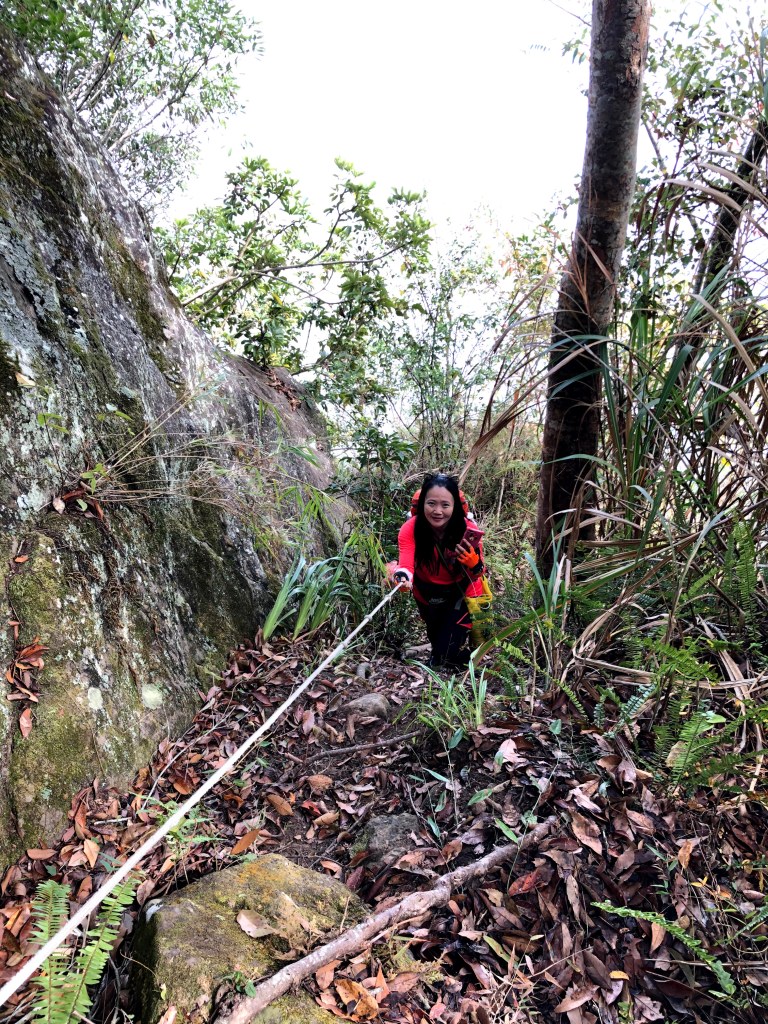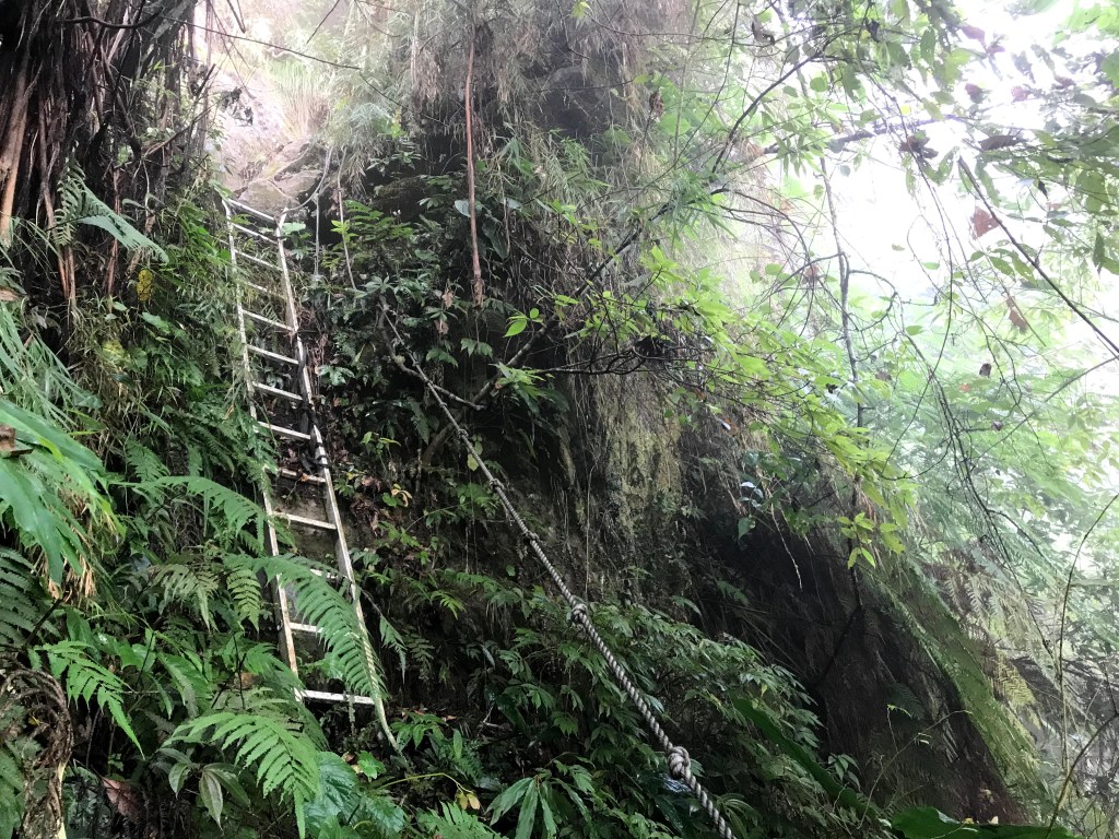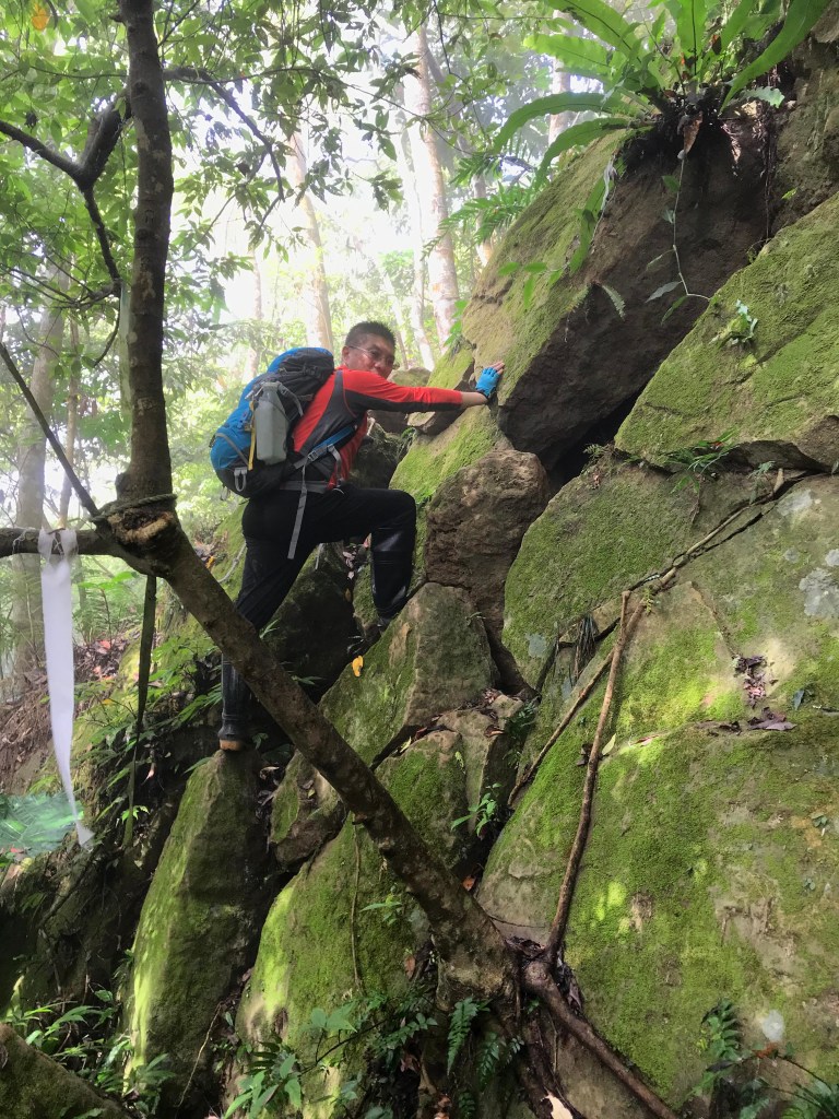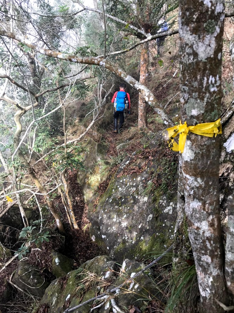 抵達大克山時,因為天色不好但偶有陽光,因此四人就在此討論了一下,要繼續前進嗎?因為接下來由大克山到司令山這一段,才是今天的挑戰!就怕天氣不好,給大伙帶來較大的濕滑風險。決定繼續走!接下來的0.5K就是陡下但是路徑狀況還好,0.5K後來到路徑右轉陡下處,開始進入斷崖式的陡下,在0.3K的距離裡會有四段的鐵梯輔助陡下,過程不好走但都架有繩索可用。從鐵梯開始的陡下,是幾近垂直狀態的斷崖路徑,此時小黃(狗)就只能在鐵梯前一直吼叫,好像是告訴我們牠也想跟著過來?太難了,只能割捨短暫的相聚,跟小黃說再見了。