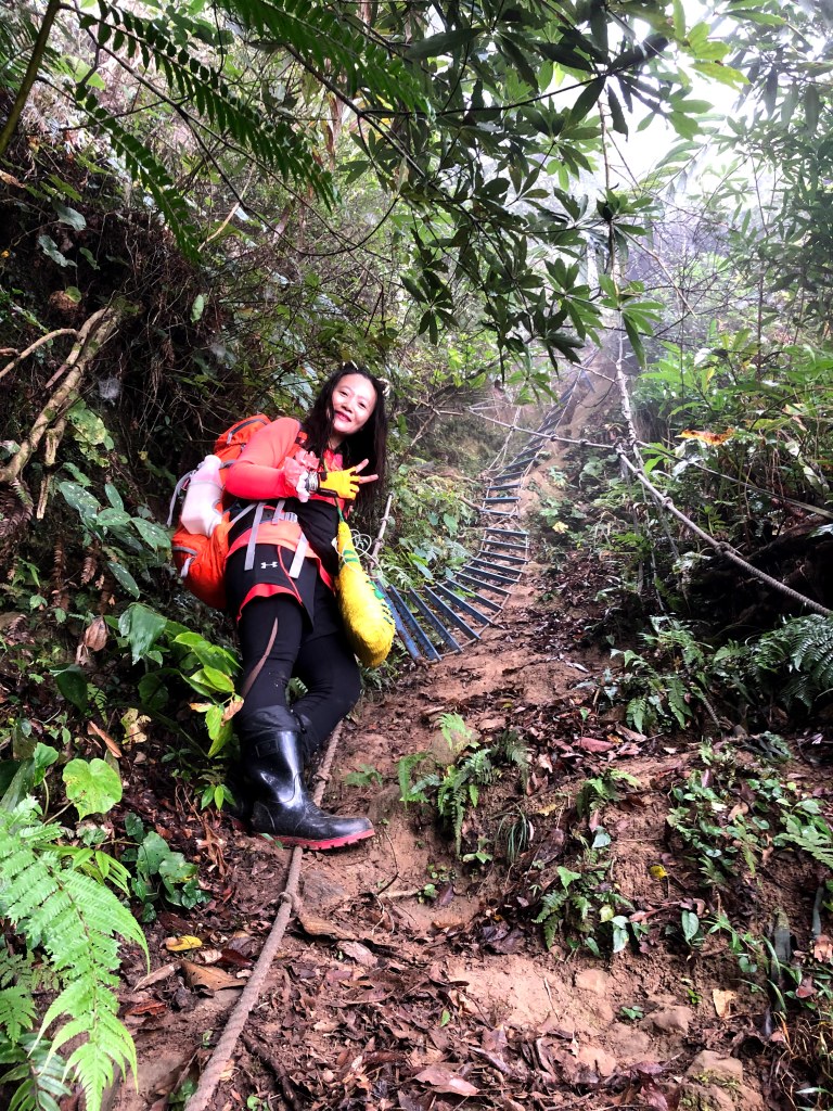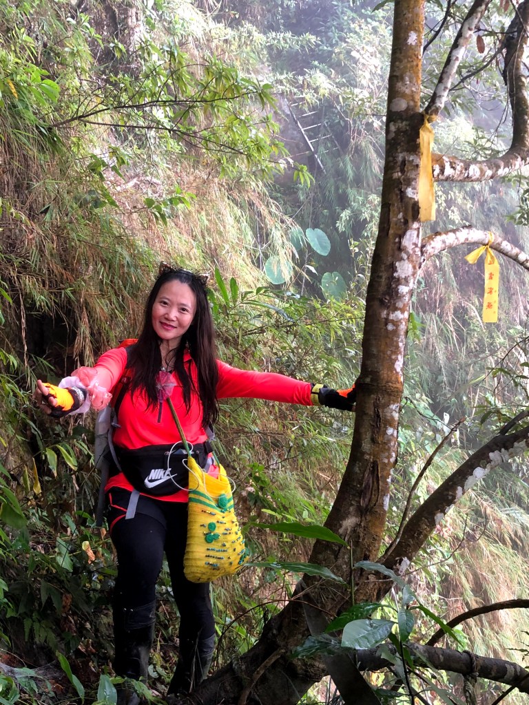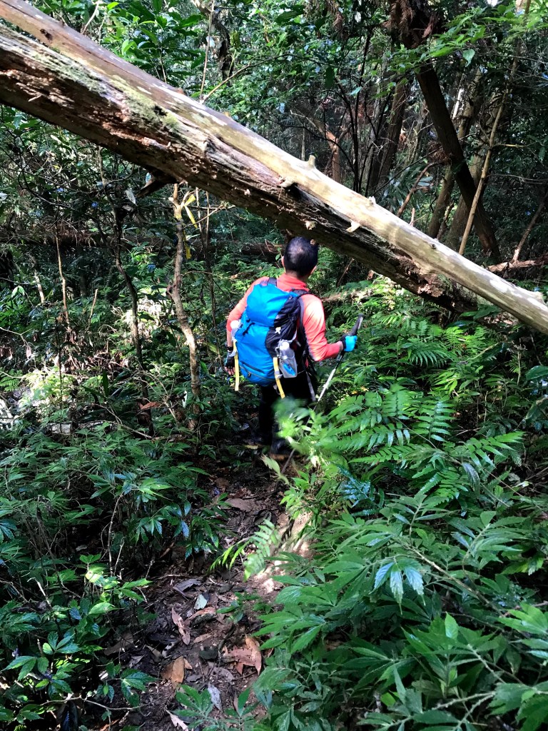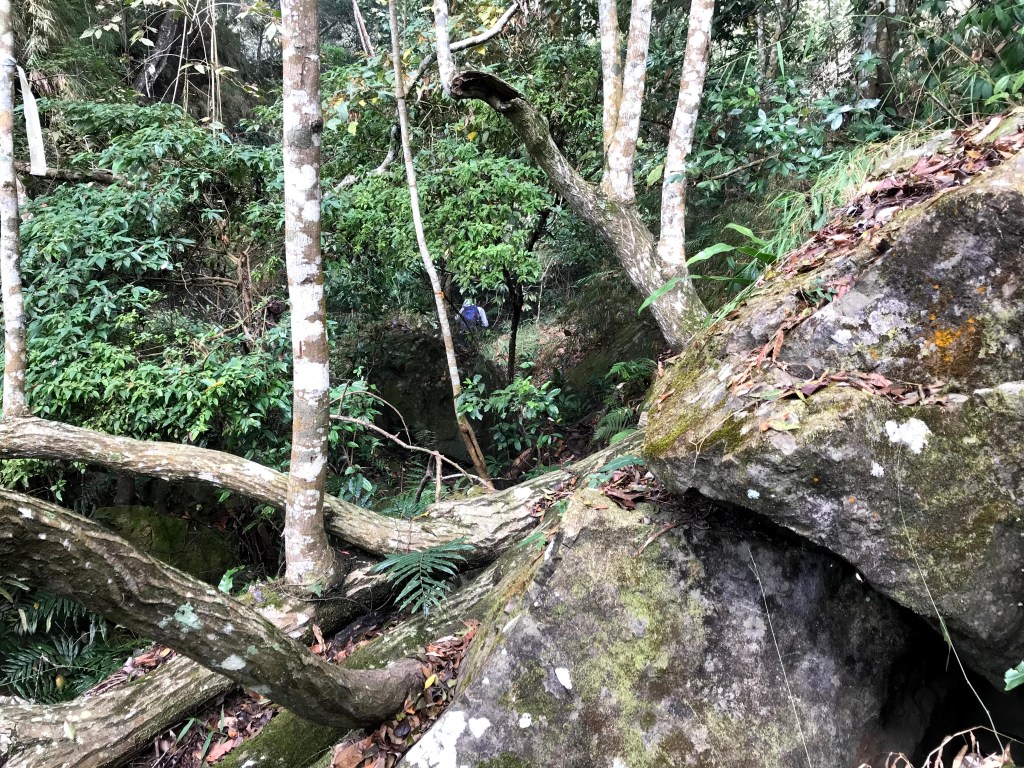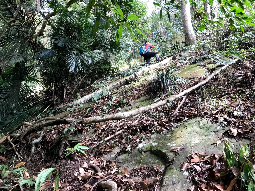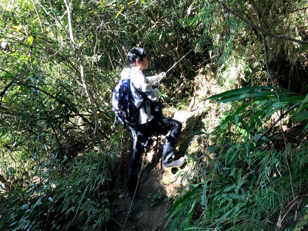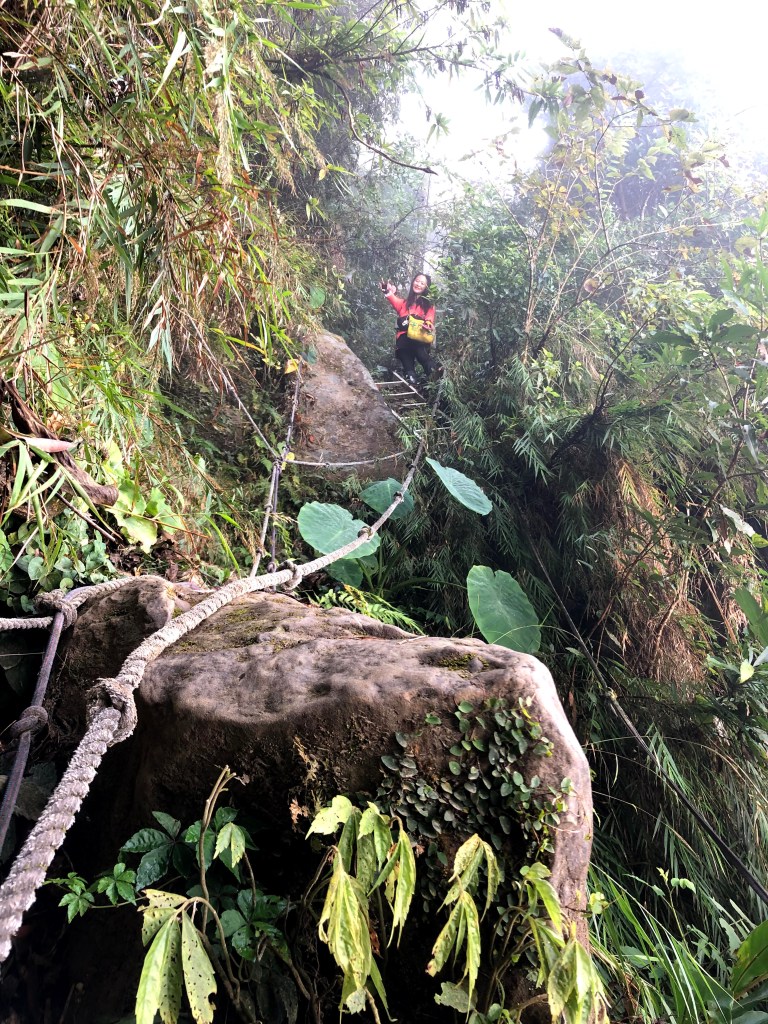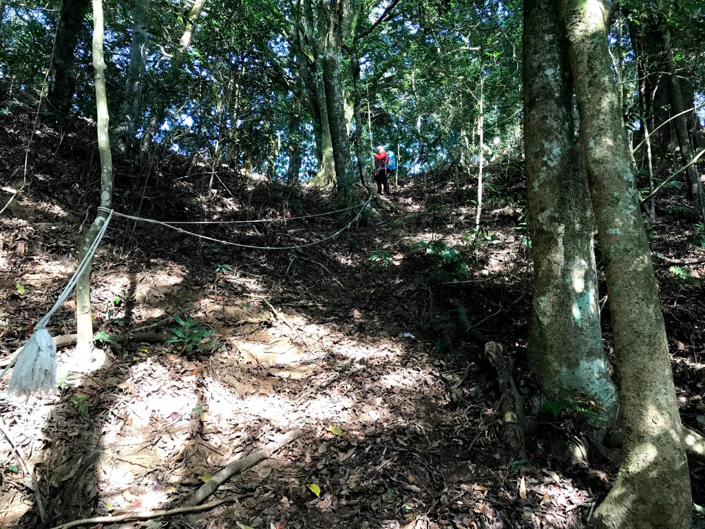 抵達大克山時,因為天色不好但偶有陽光,因此四人就在此討論了一下,要繼續前進嗎?因為接下來由大克山到司令山這一段,才是今天的挑戰!就怕天氣不好,給大伙帶來較大的濕滑風險。決定繼續走!接下來的0.5K就是陡下但是路徑狀況還好,0.5K後來到路徑右轉陡下處,開始進入斷崖式的陡下,在0.3K的距離裡會有四段的鐵梯輔助陡下,過程不好走但都架有繩索可用。從鐵梯開始的陡下,是幾近垂直狀態的斷崖路徑,此時小黃(狗)就只能在鐵梯前一直吼叫,好像是告訴我們牠也想跟著過來?太難了,只能割捨短暫的相聚,跟小黃說再見了。