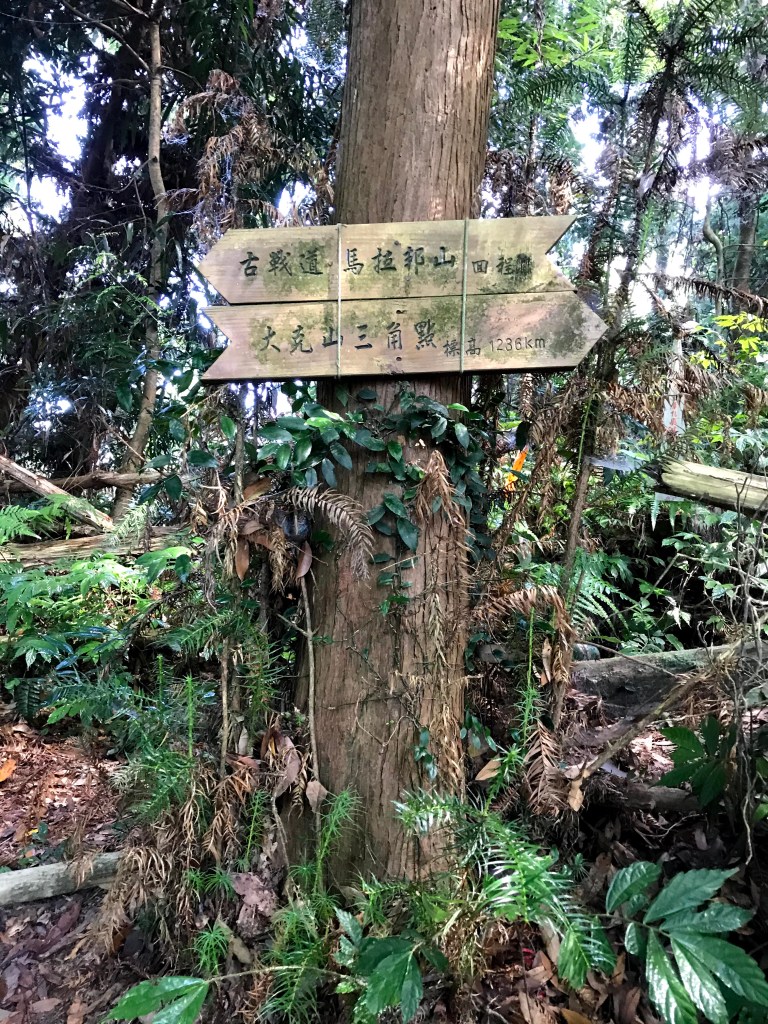 過了四道鐵梯後,路徑繼續往下會到達遊樂區岔A,可由此左轉而下抵達大克山冷泉森林遊樂區,此路徑可以當作撤退路線。繼續前行0.5K會再遇到遊樂區岔B,此時沿著路徑往下直走可以向左彎繞回大克山冷泉森林遊樂區,但我們必須在此右轉陡上,有木製板上有寫著:「馬拉邦山7K」引導方向。接著就進入第一個假山頭,要先來一段極陡峭的連續拉繩而上的過程,再來一段拉繩陡下的路徑。這樣的假山頭有三個,每一段的陡上陡下角度都很大,而且因為路徑原始要走快很難,以安全踩踏為第一要務。經過一番掙扎之後,就會抵達司令山,此時的天氣轉晴,只是下了一段時間雨的山徑都是濕滑狀態。