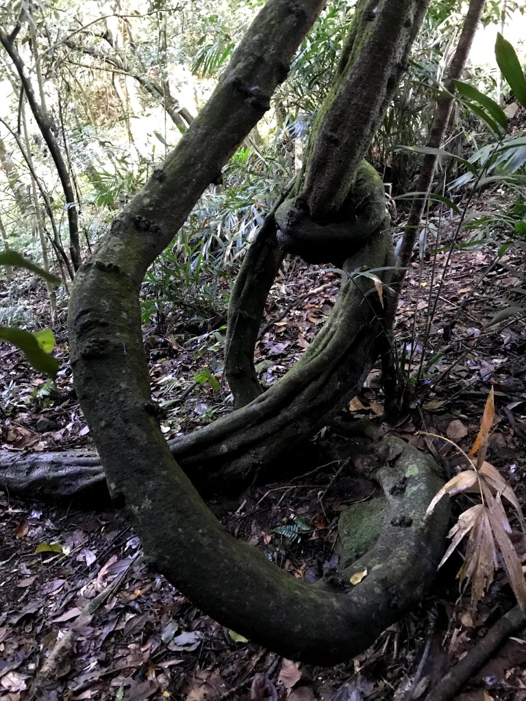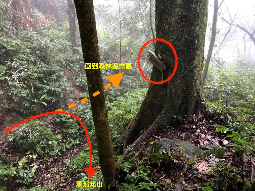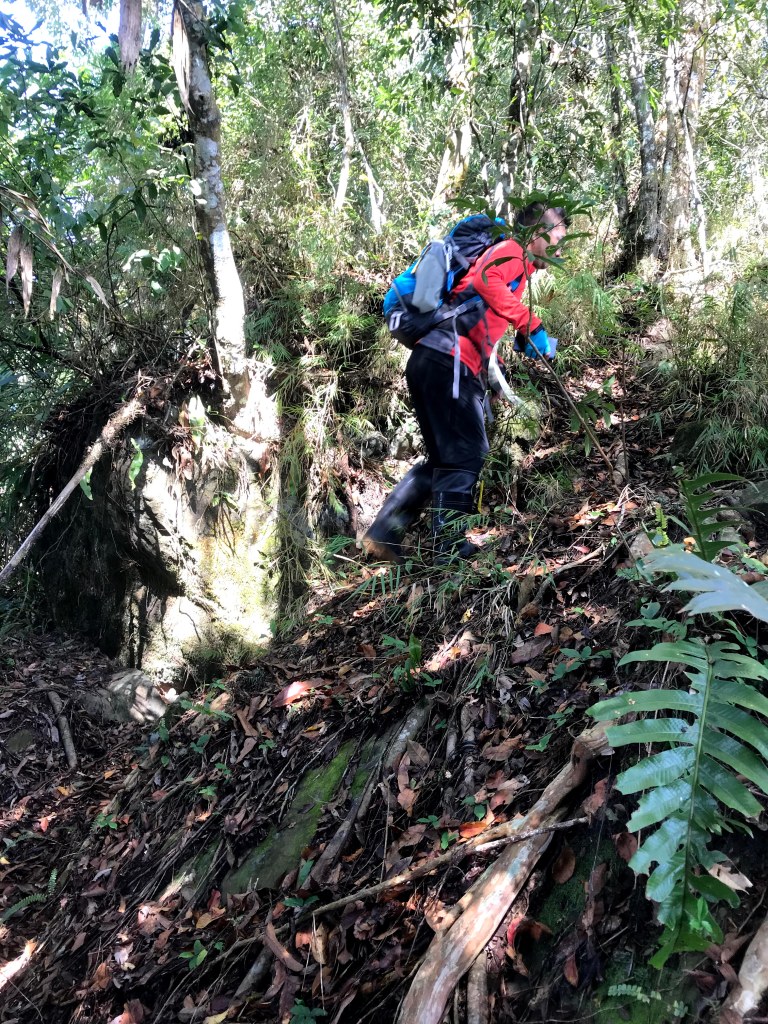 我們在司令山吃午餐休息了半小時,此時跟要幫我們接駁的強哥約好下午2點在馬那邦山見面,已經是不可能的事情,但偏偏這段路徑上沒有訊號無法聯絡,我們在想強哥應該會等太久而離開吧?由司令山往馬那邦山的這一段路徑上,就是在逐漸的陡上,路徑為泥土、落葉與樹根交雜但並不難走的過程,且會經過三姊妹樹,還有一段是走在右側為斷崖但不會有危險的瘦稜上,我們一行人在下午3點半出了箭竹林而抵達馬那邦山。