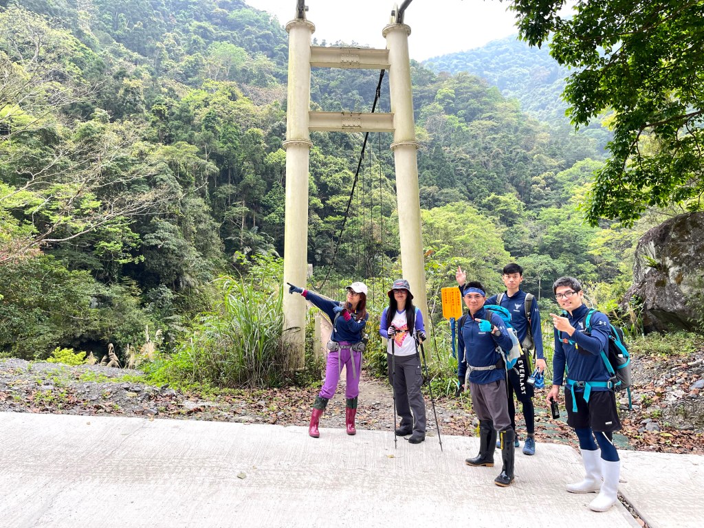 上圖:此時菲菲的速度比較慢一些,因此我就先把衣服給換好了,這時菲菲、Sonia、阿志正在通過吊橋,大伙與吊橋合拍一張。我們六人,完成今天的艱辛行程。