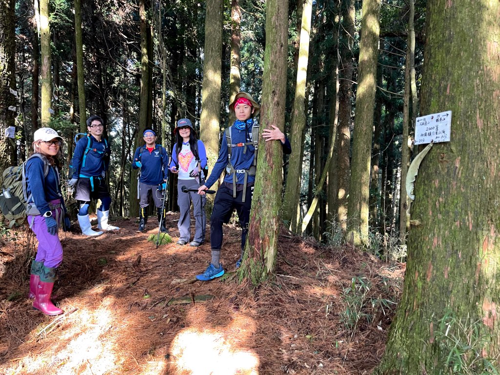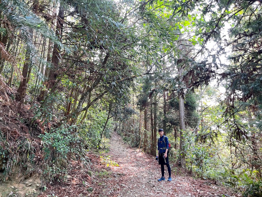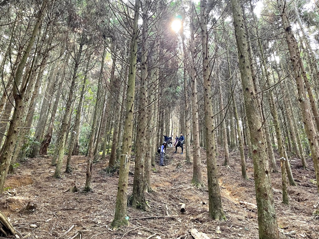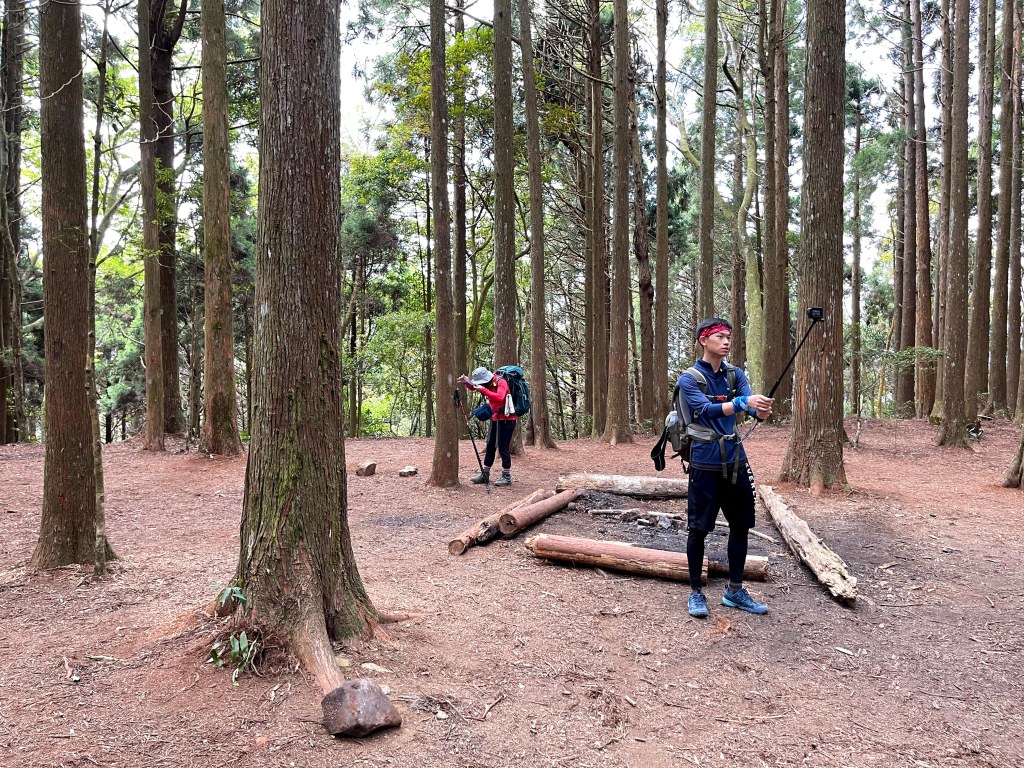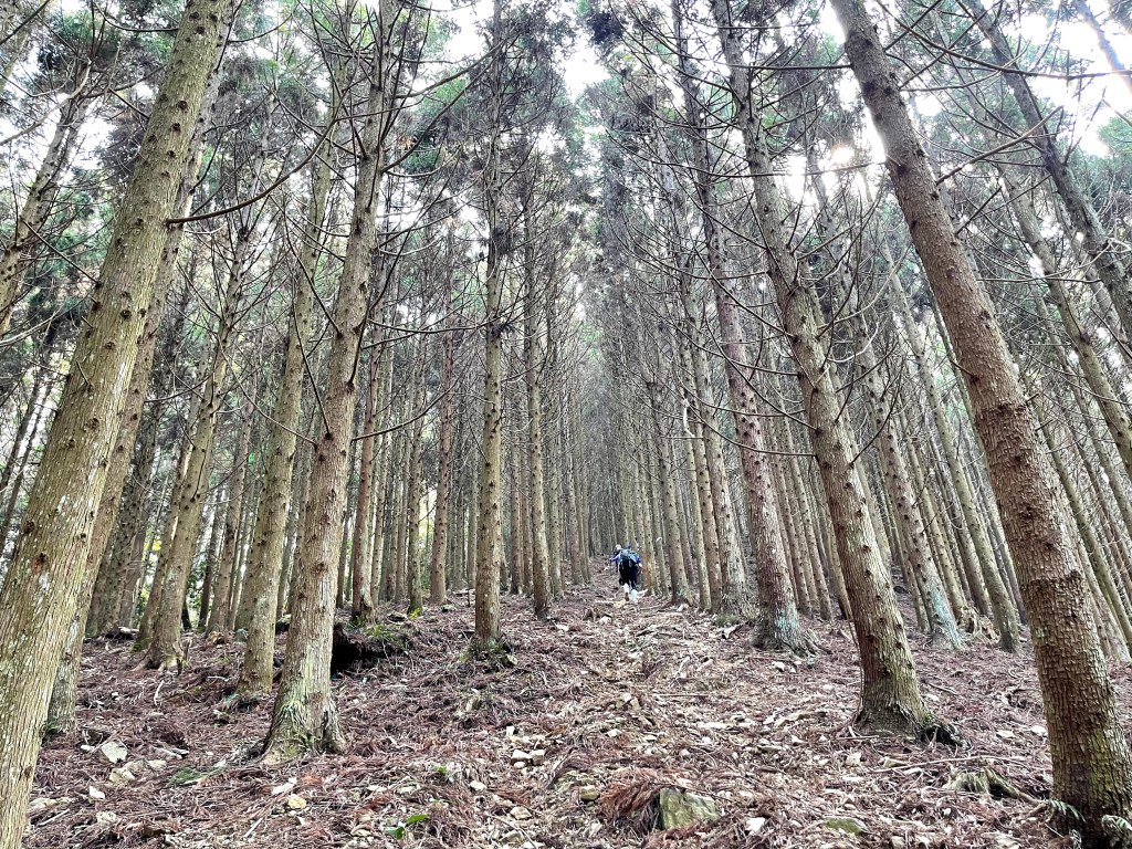 由鐵柵欄再走3.4K可到高台山,這段的路徑可分為兩部份,前段是沿著產業道路緩緩而上,其中還看到了滿滿的血藤,山友們盛傳看到血藤會讓人得到幸運,那今天應該是幸運滿滿。接著後段就是陡上的穿梭在筆直人造杉木林裡,因為杉木林實在太美,大伙在此都是走走停停的一直在拍照。