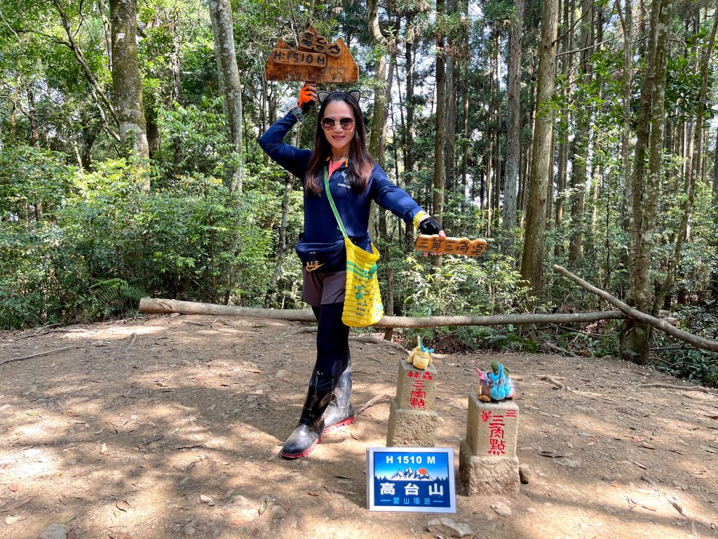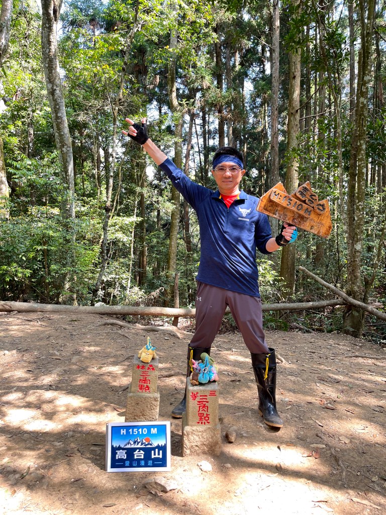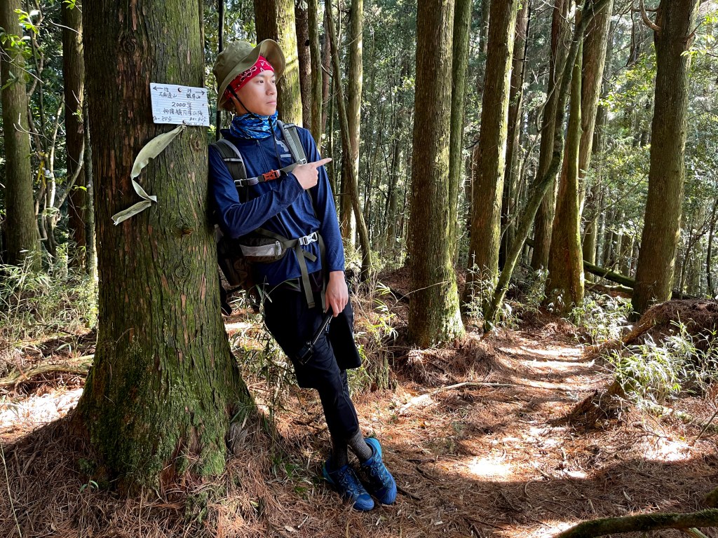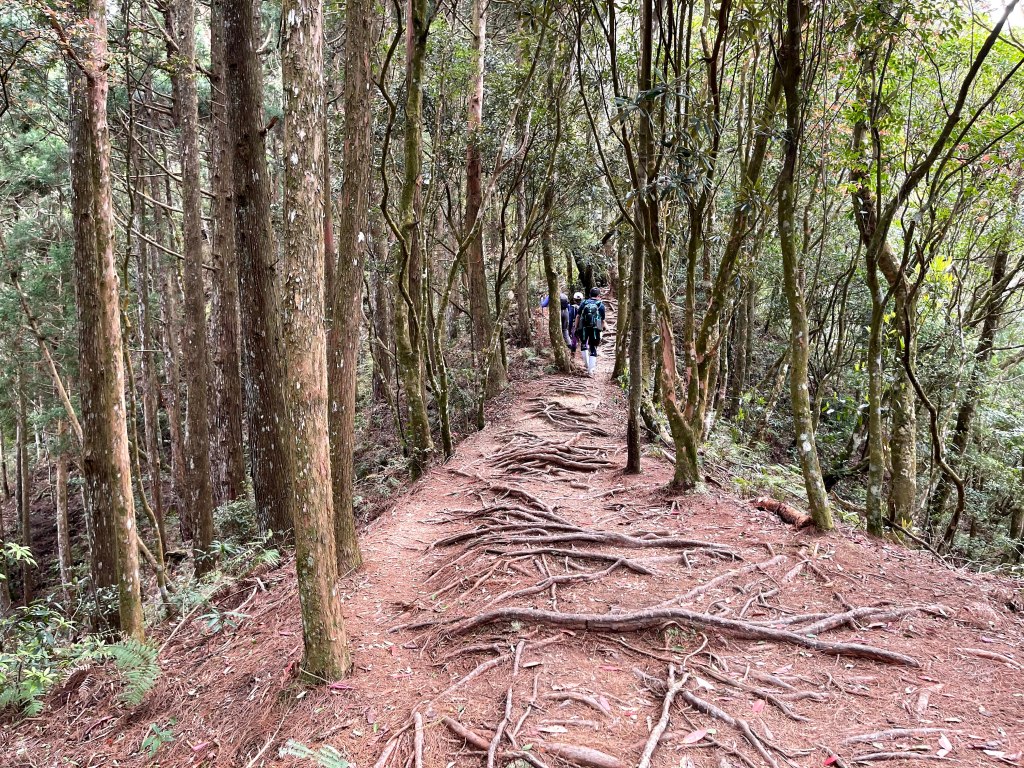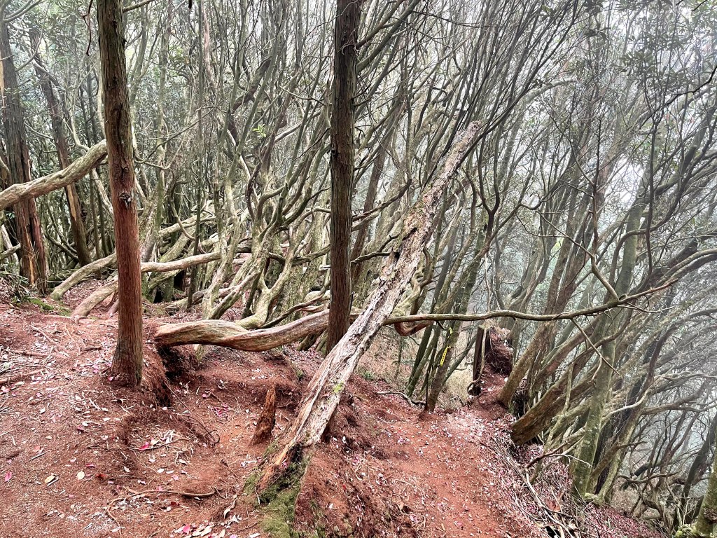 由鐵柵欄再走3.4K可到高台山,這段的路徑可分為兩部份,前段是沿著產業道路緩緩而上,其中還看到了滿滿的血藤,山友們盛傳看到血藤會讓人得到幸運,那今天應該是幸運滿滿。接著後段就是陡上的穿梭在筆直人造杉木林裡,因為杉木林實在太美,大伙在此都是走走停停的一直在拍照。